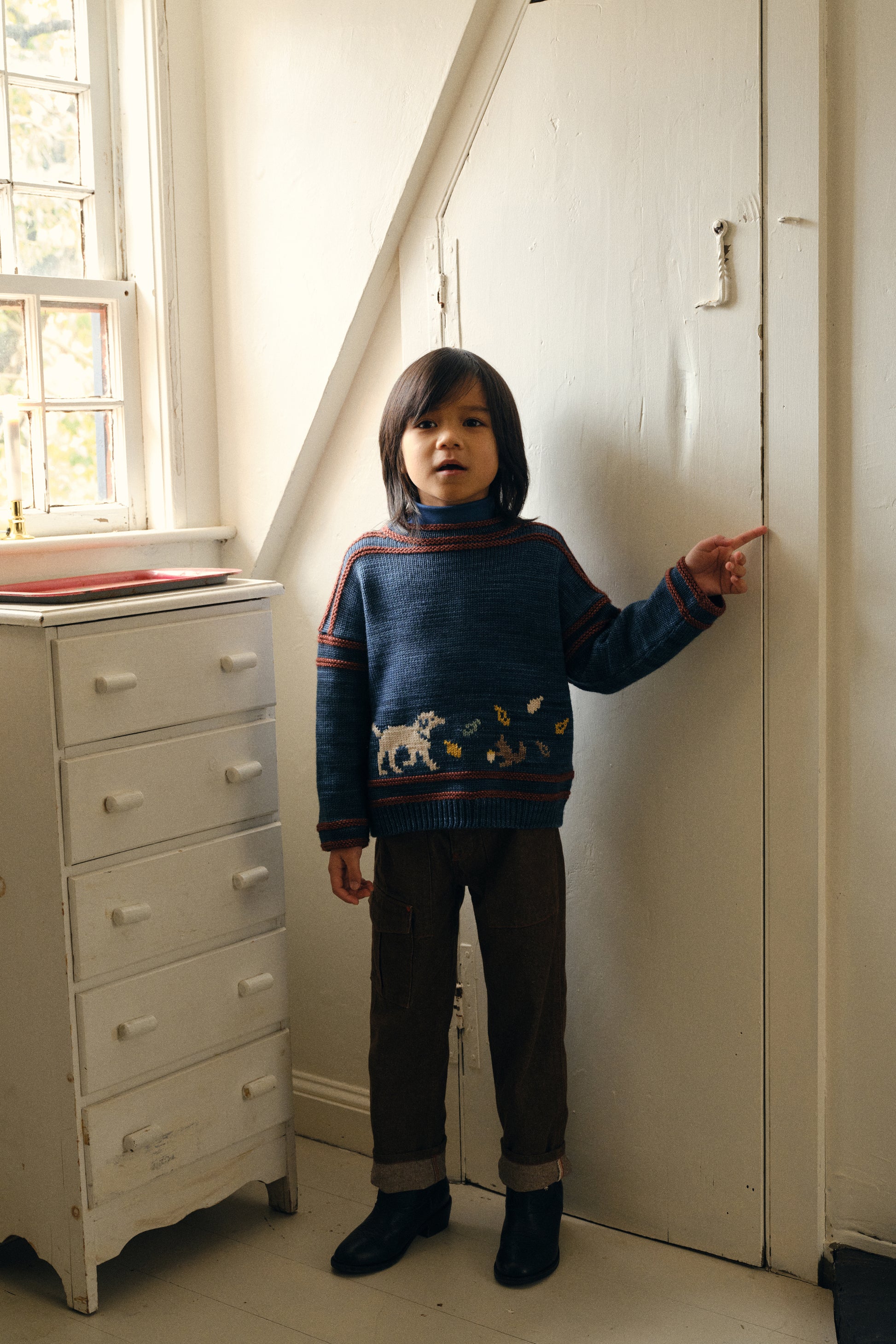 A sweater in Merino wool, featuring a boxy silhouette, mock-neck collar, contrast bands, and ribbed trim. With a special animal and leaves intarsia on the front.
