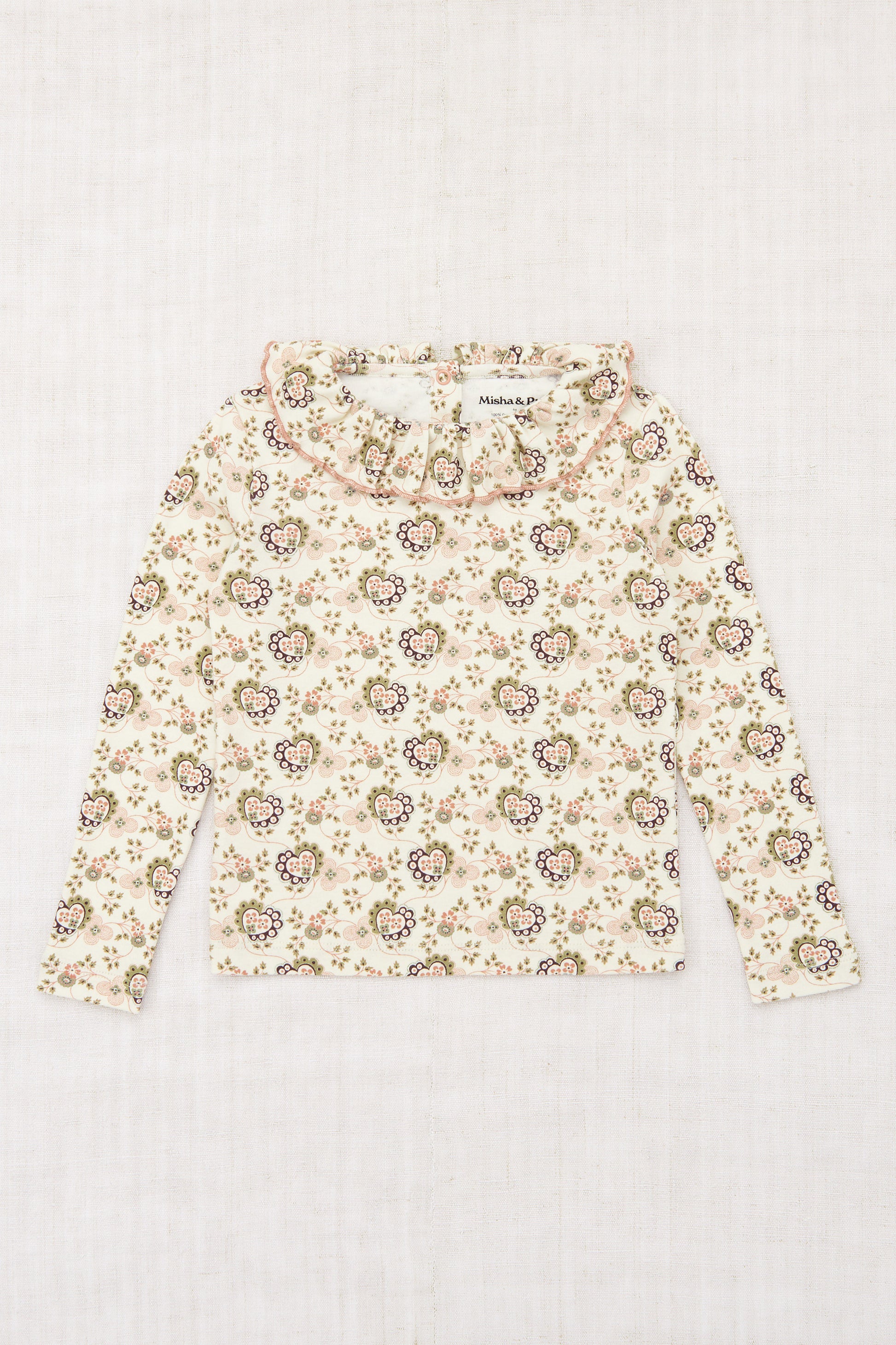A long-sleeved slim-fit top in soft organic Pima cotton, featuring a gathered ruffle neck with contrast merrowed edge and snap closure at the back neck.