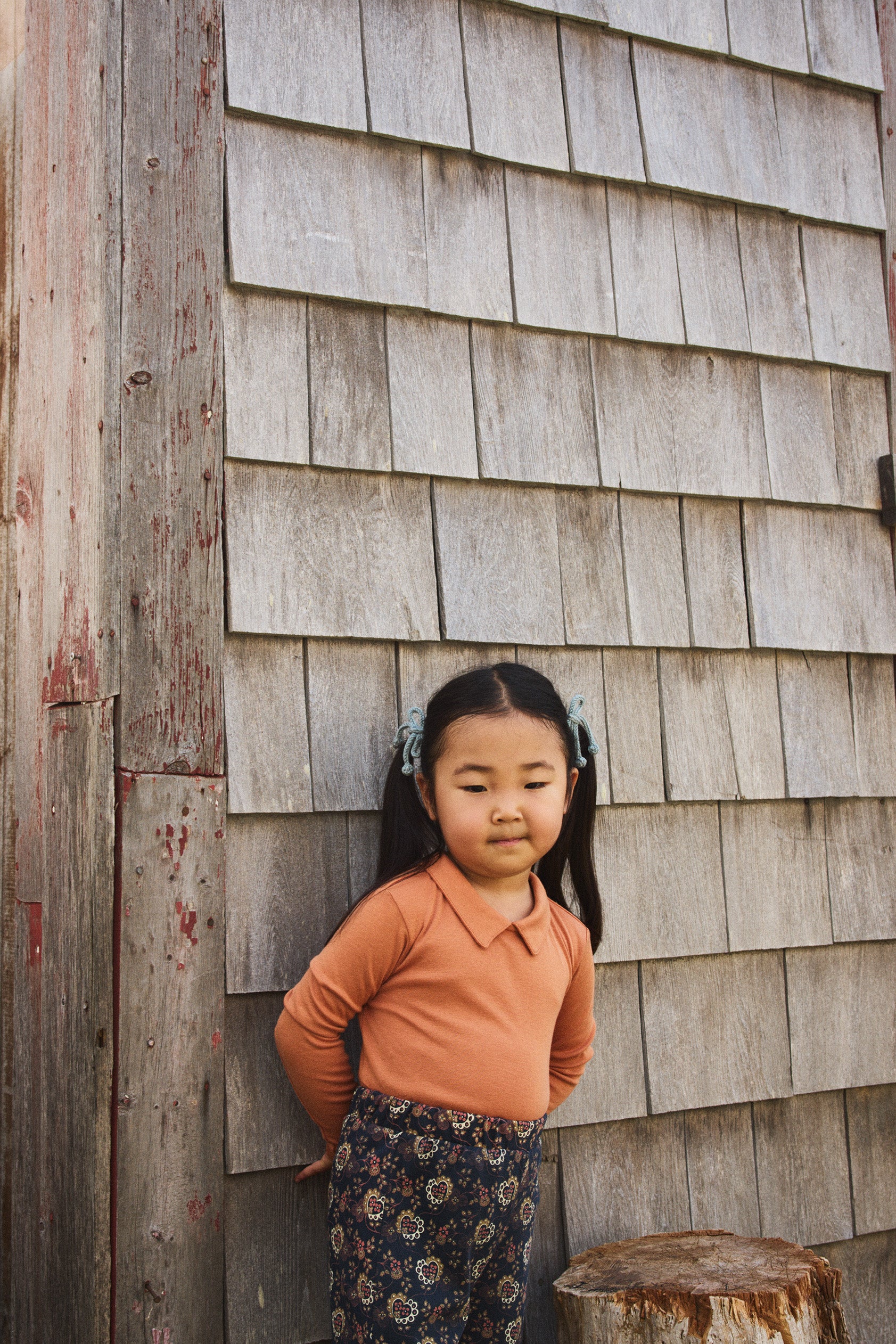 A long-sleeved top in organic Pima cotton, featuring a mod-inspired silhouette, point collar, and snap closure at the back neck.