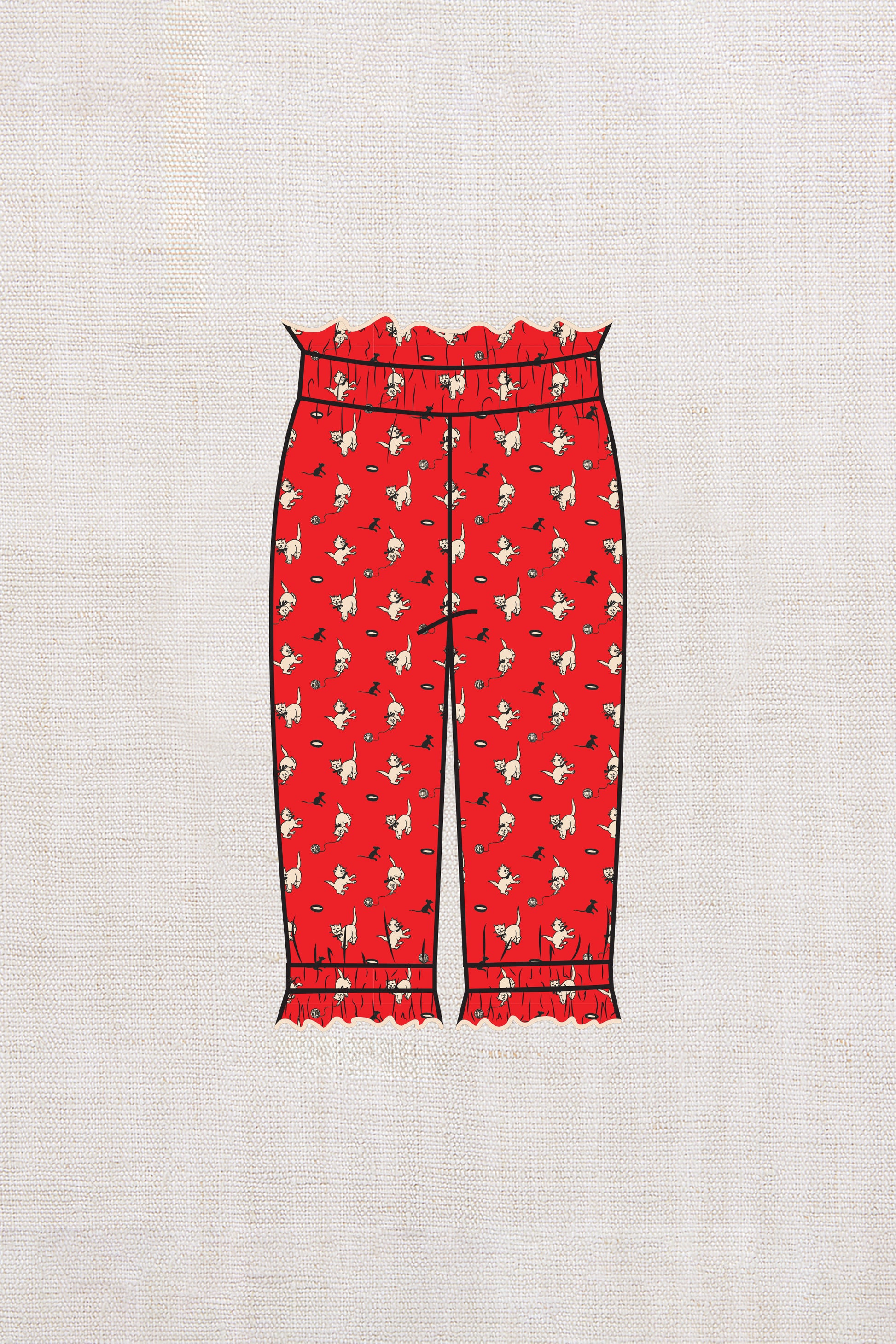 A pull-on loose-fitting pant in soft organic Pima cotton, featuring a gathered elastic waistband, and ruffle hem with a contrast merrowed edge.