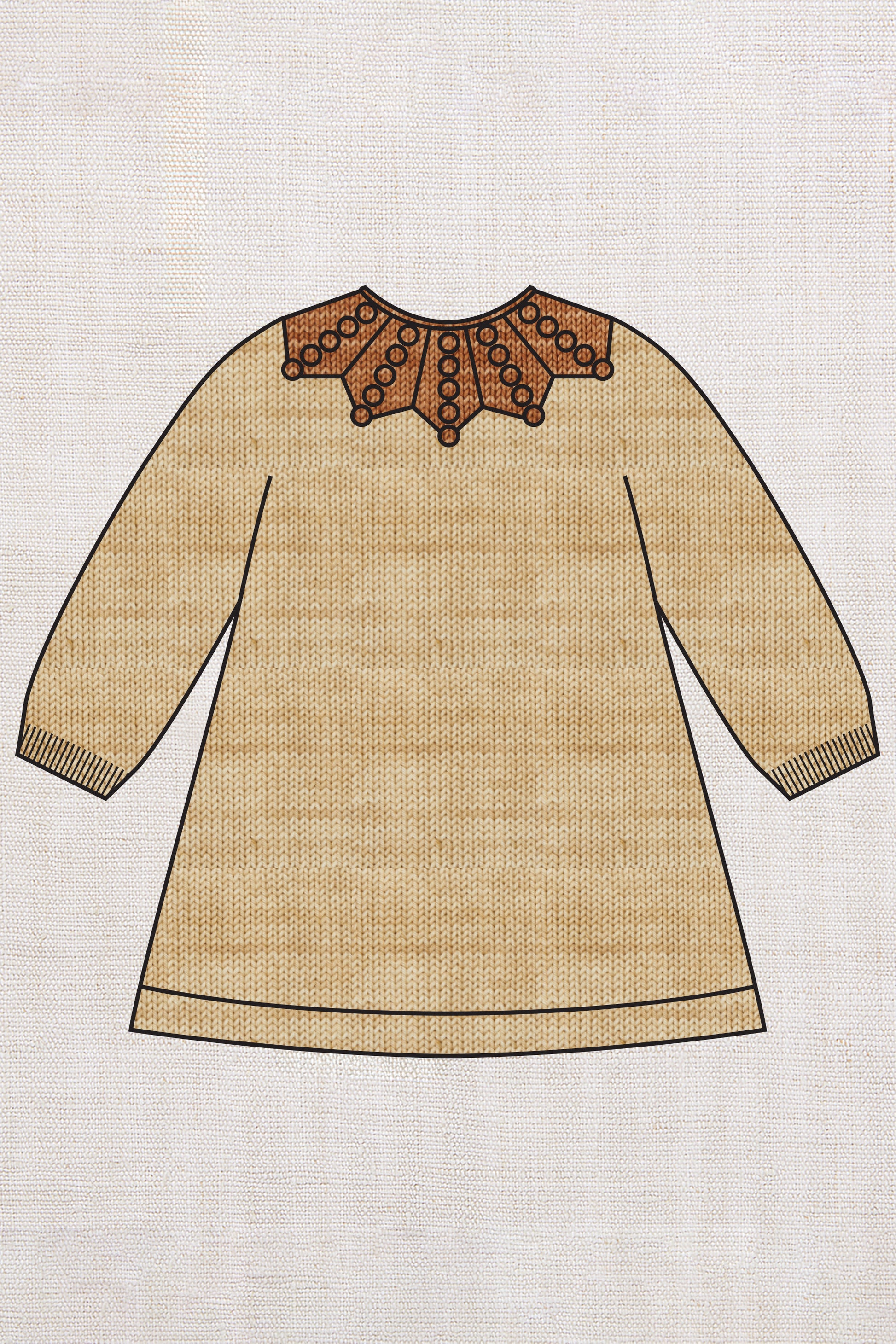 A long-sleeved dress in Merino wool, featuring a self-rolled mock neck, open A-line silhouette, star-shaped yoke with popcorn stitch detail, and ribbed trim. Finished with horn button keyhole closure at the back neck.