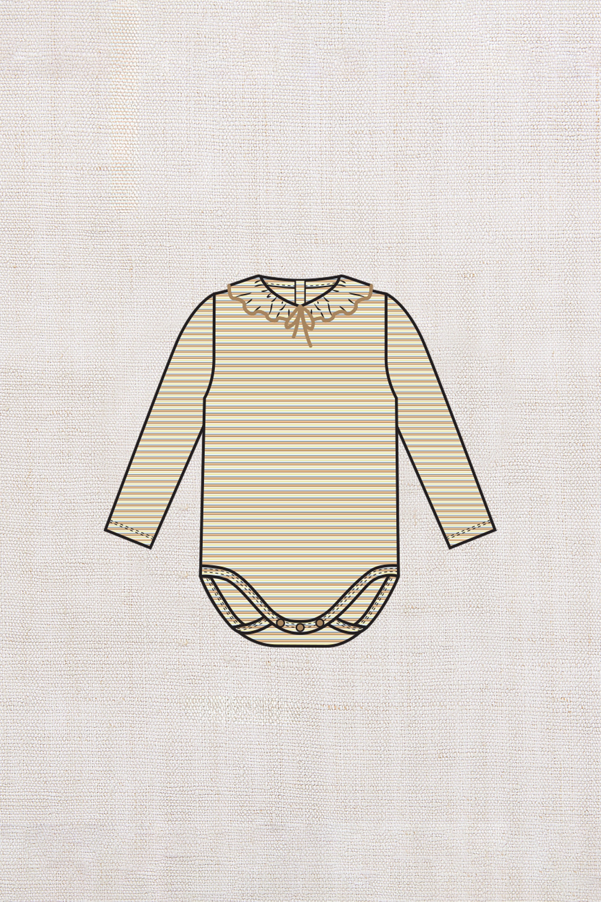 A classic long-sleeved onesie in organic Pima cotton, featuring a ruffle collar with a contrast merrowed edge and mini bow. Finished with snap closure at the bottom and back neck — perfect on its own or layered for a versatile, buildable look. Each color of the stripes featured in this style are dyed separately and then knit together, creating colors that last longer.