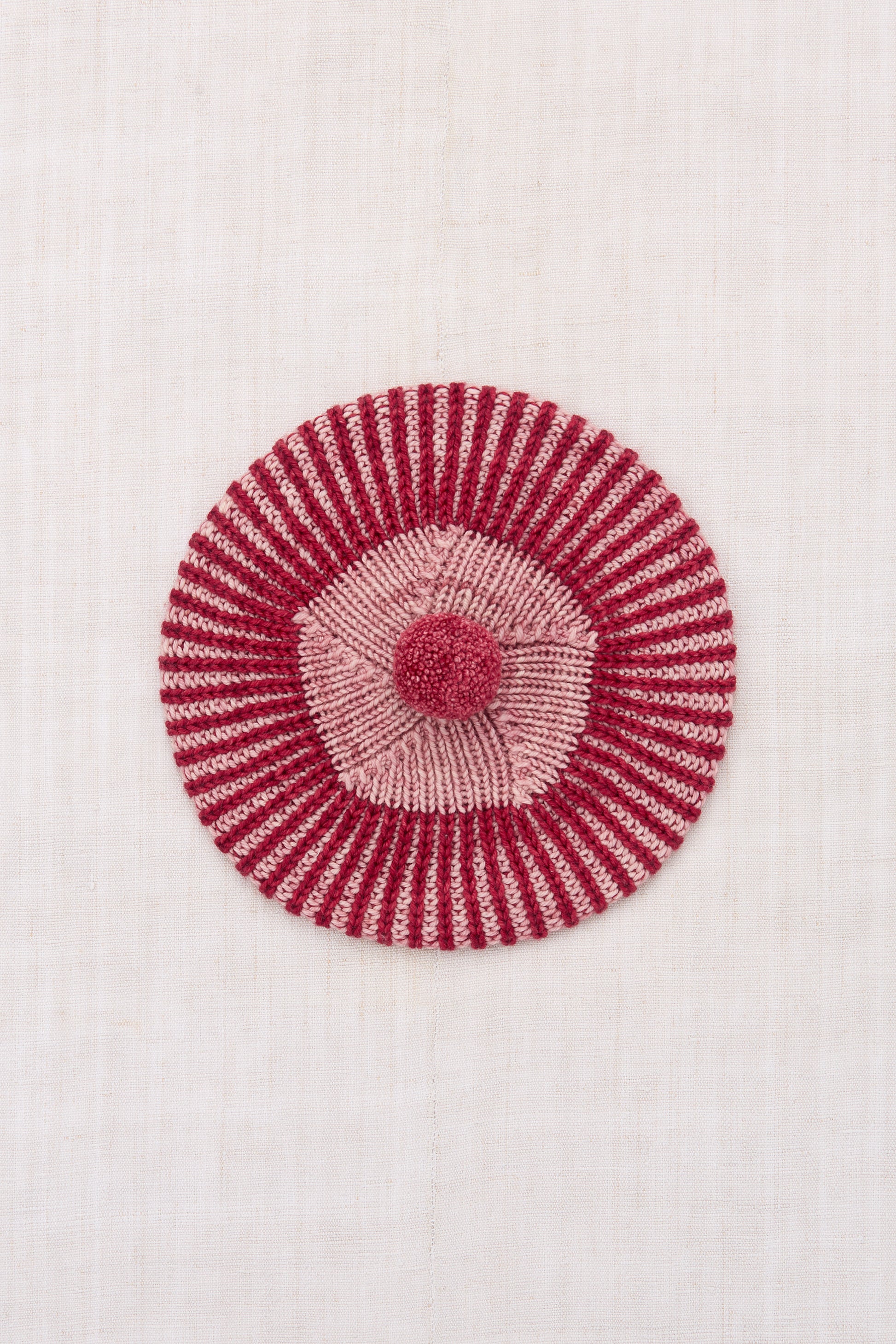 A Scottish-inspired hand-knit beret-style hat in Merino wool, featuring a chunky double brioche rib and a pom-pom accent on top.