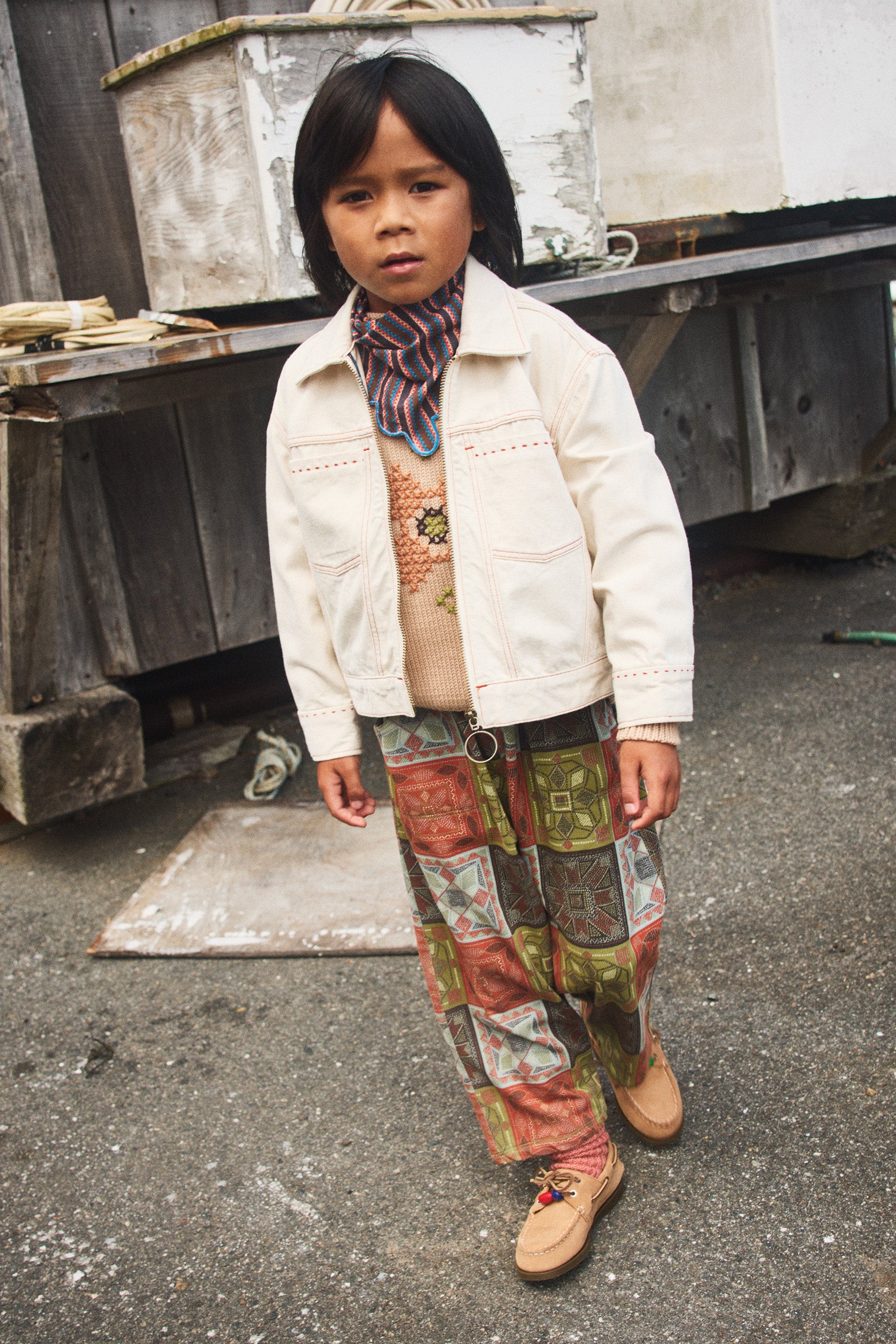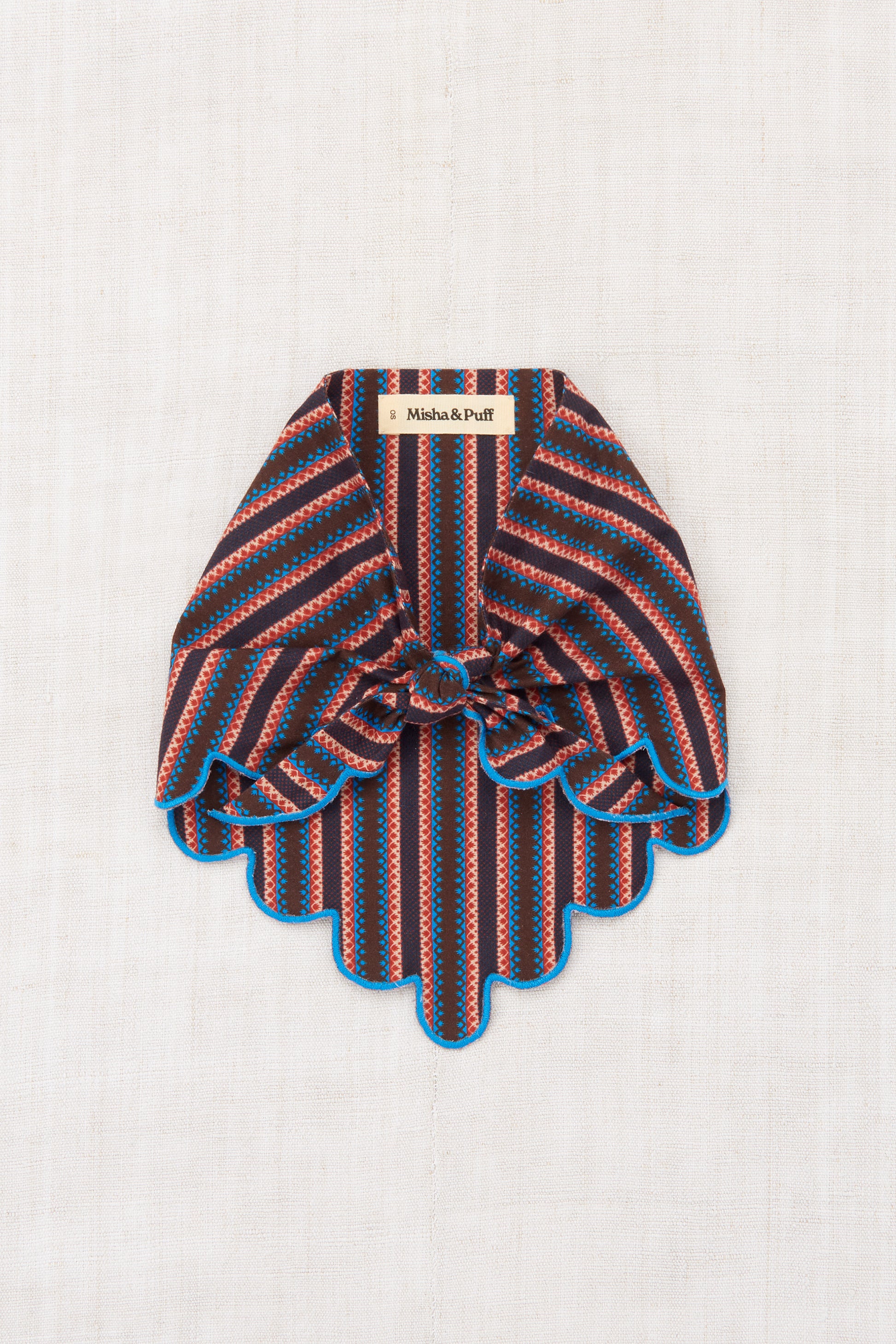 A scarf in cotton poplin, featuring a scalloped edge with contrast merrowed trim. Perfect for the head, neck, or as an adornment.