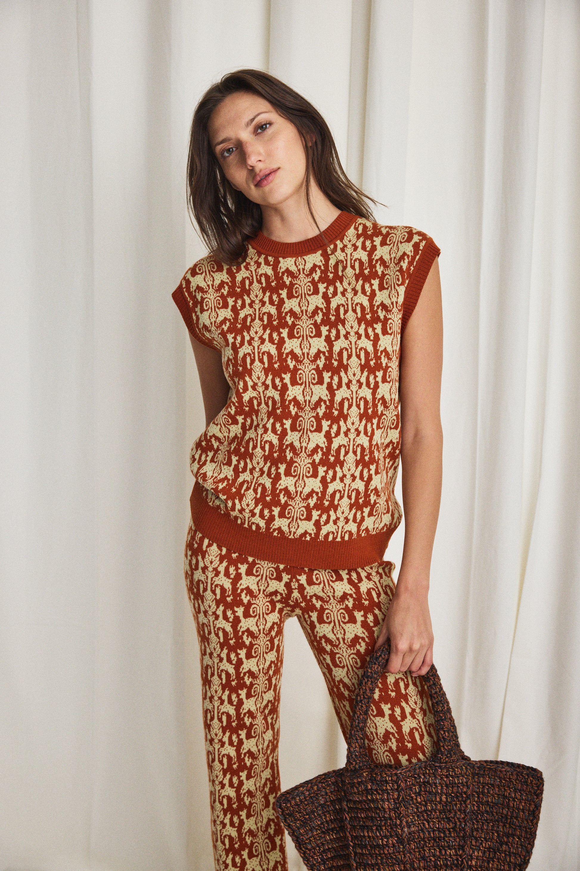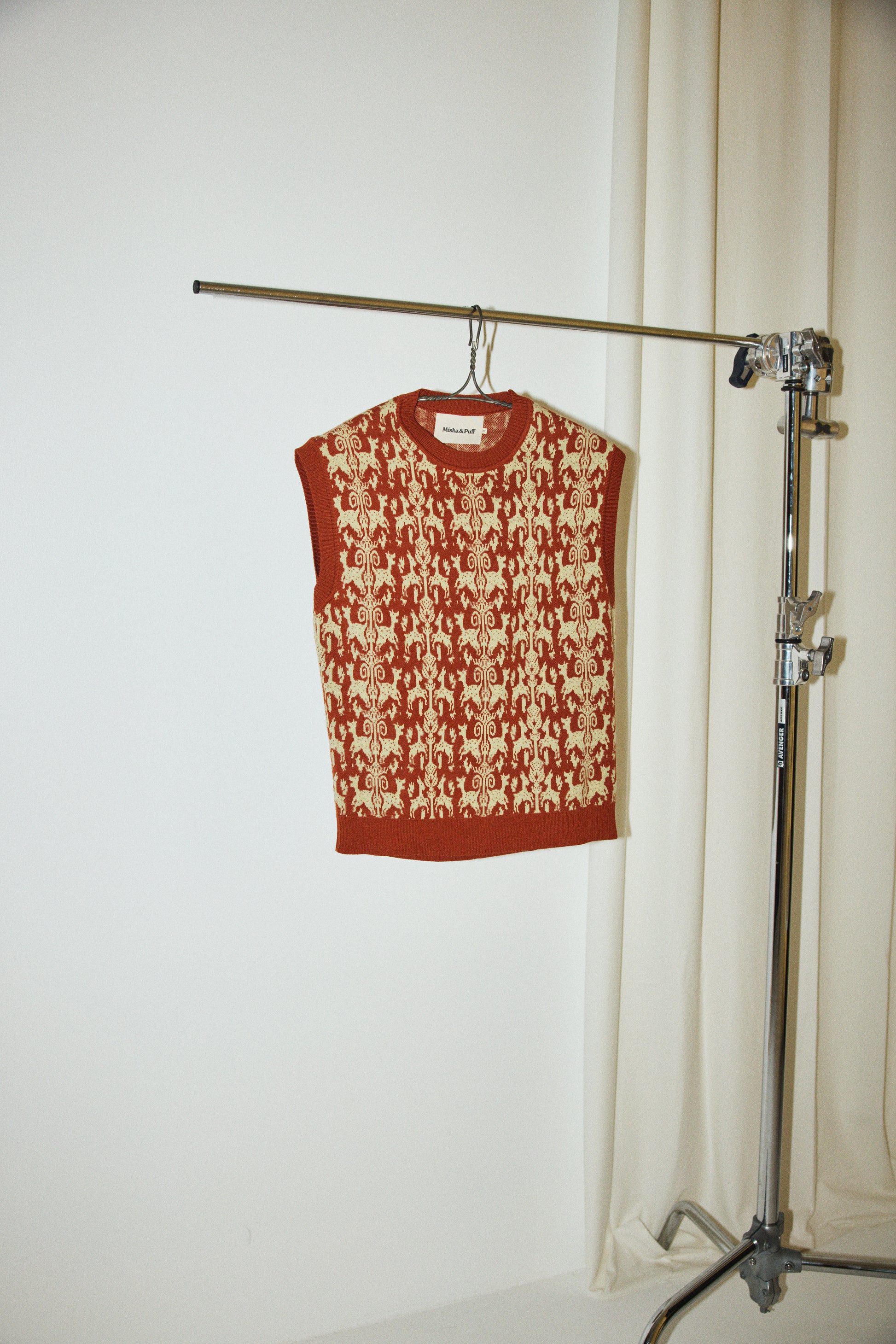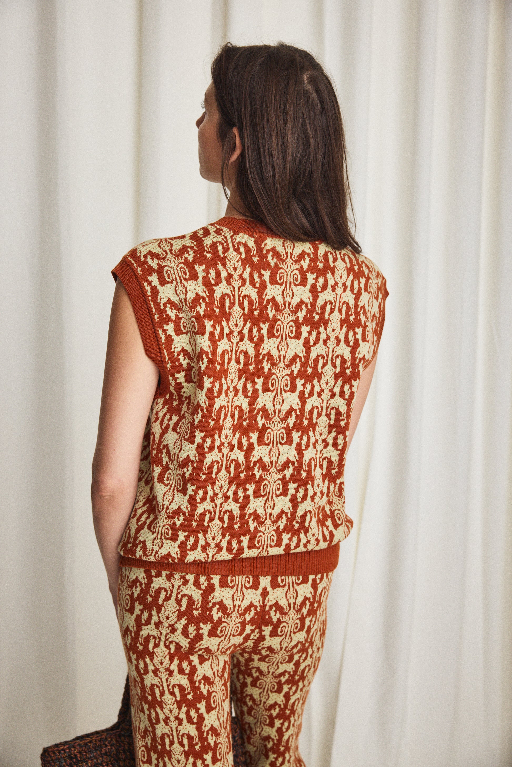 A sleeveless top in a fine-gauge Merino wool jacquard knit, featuring ribbed trim. Perfect worn alone or layered for a versatile look.