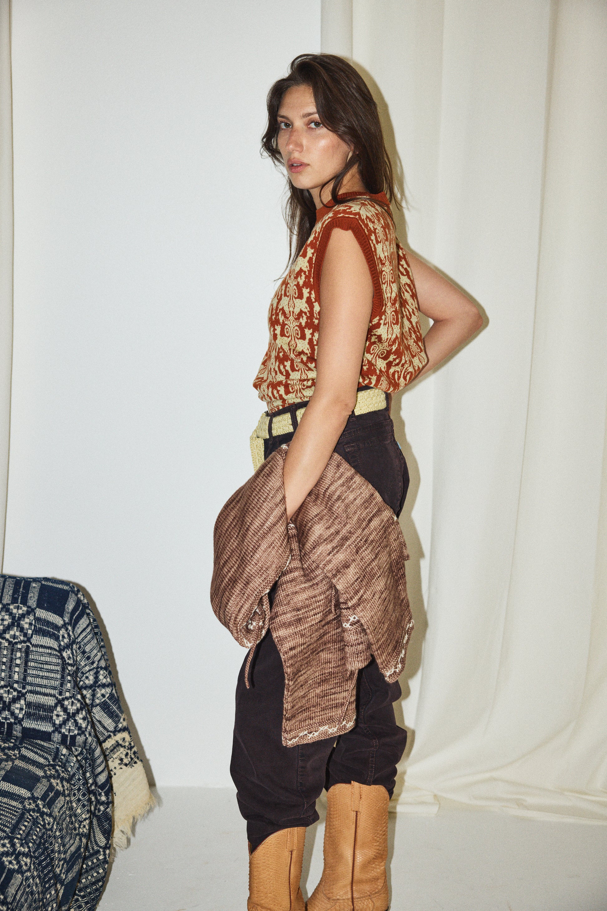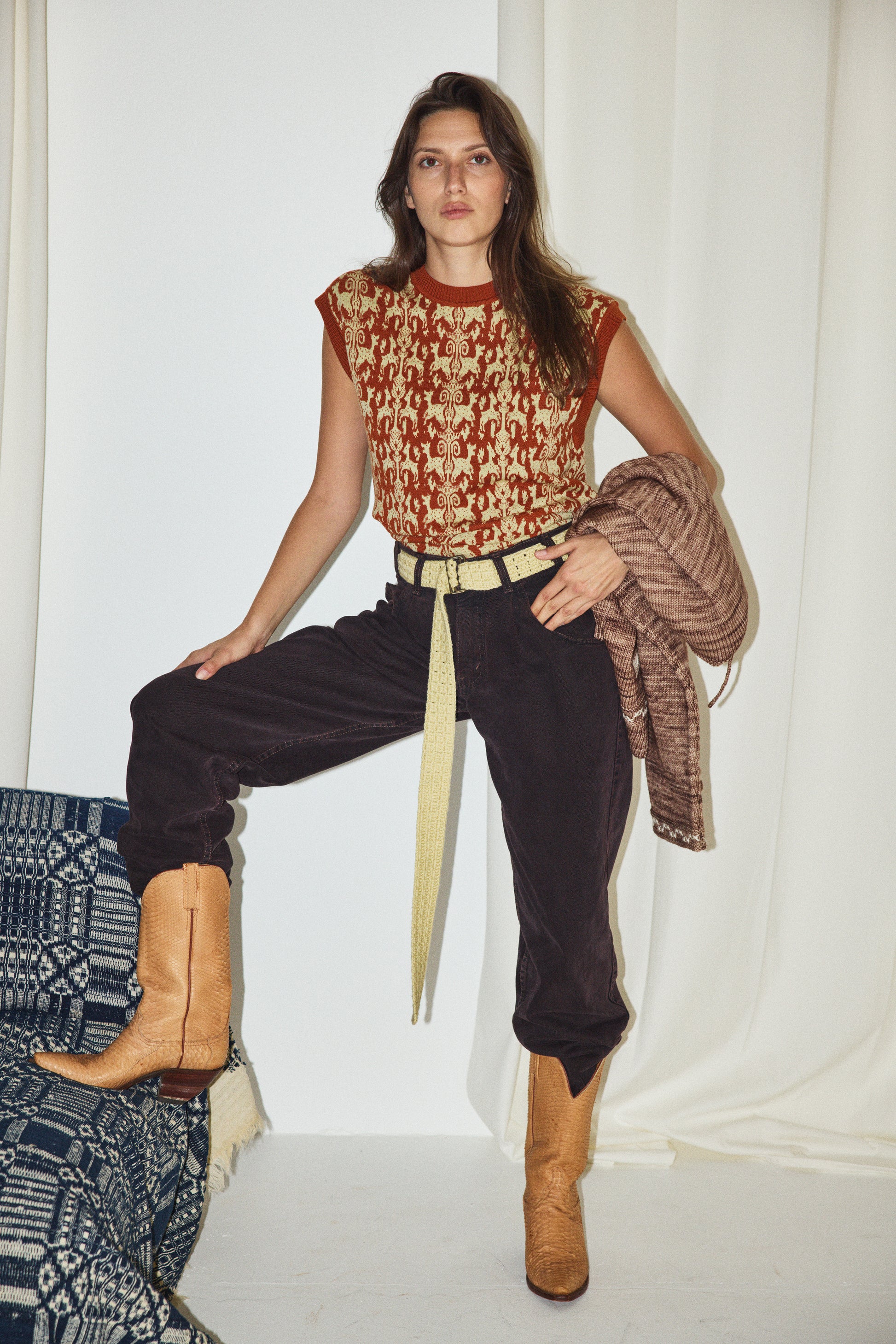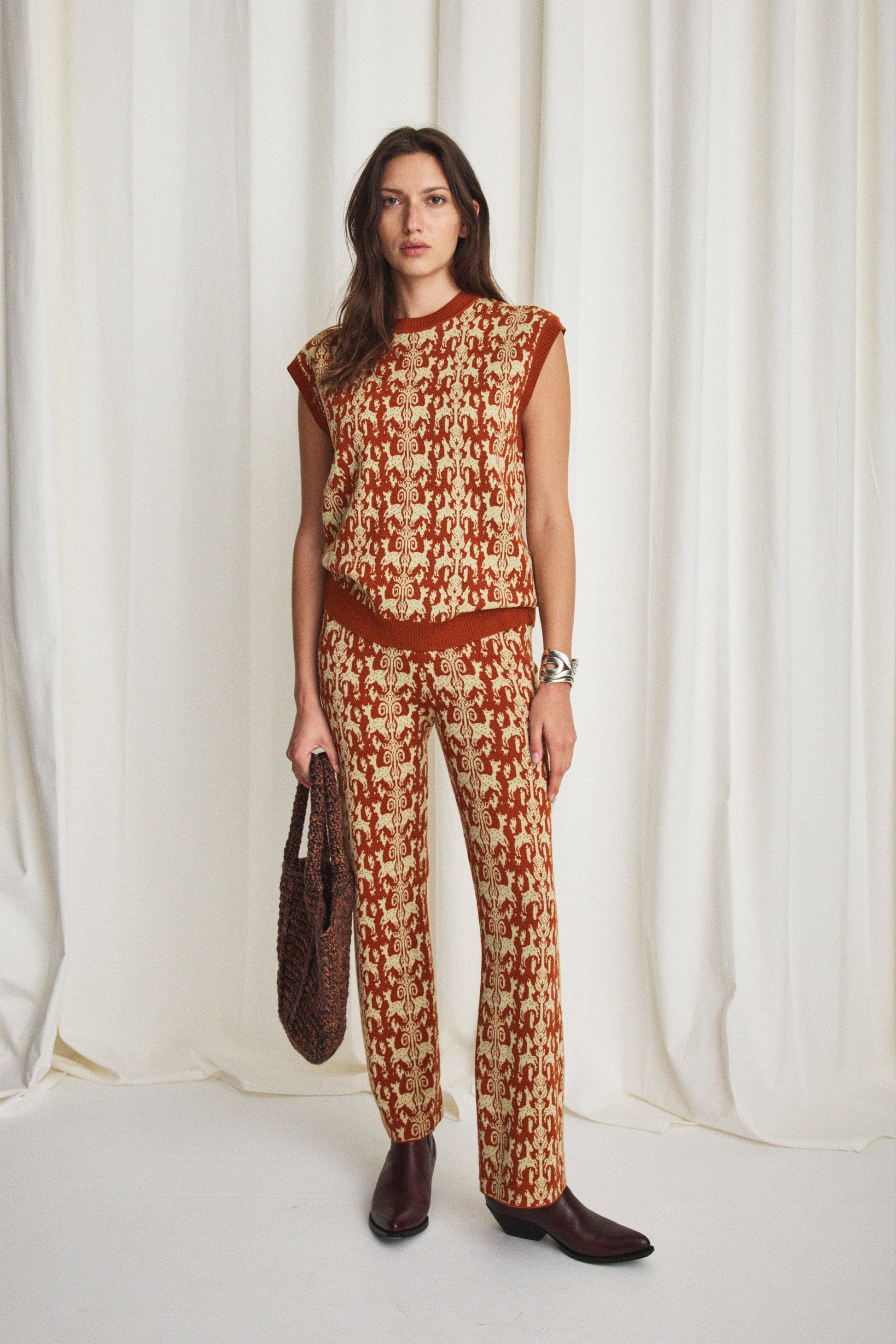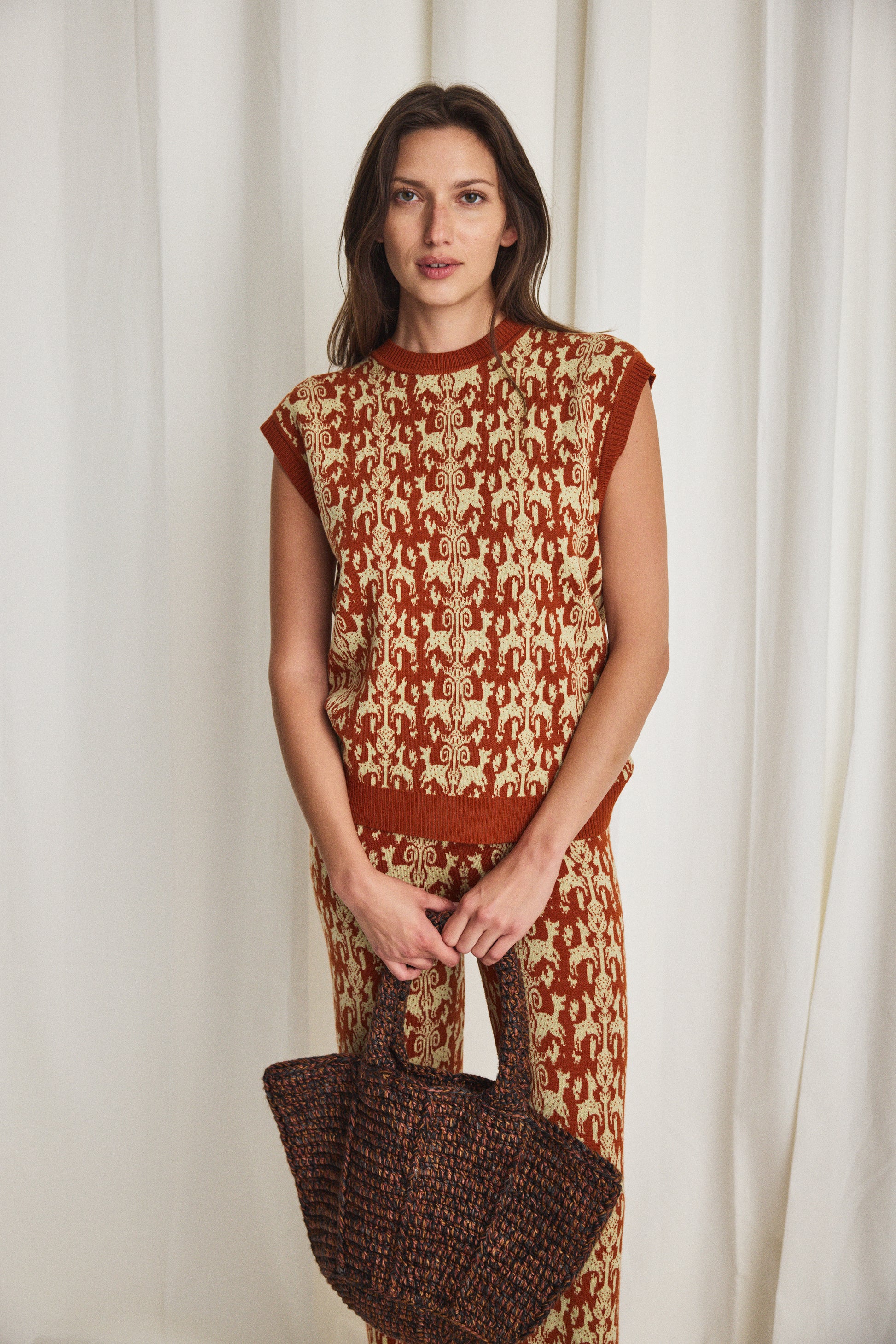 A sleeveless top in a fine-gauge Merino wool jacquard knit, featuring ribbed trim. Perfect worn alone or layered for a versatile look.
