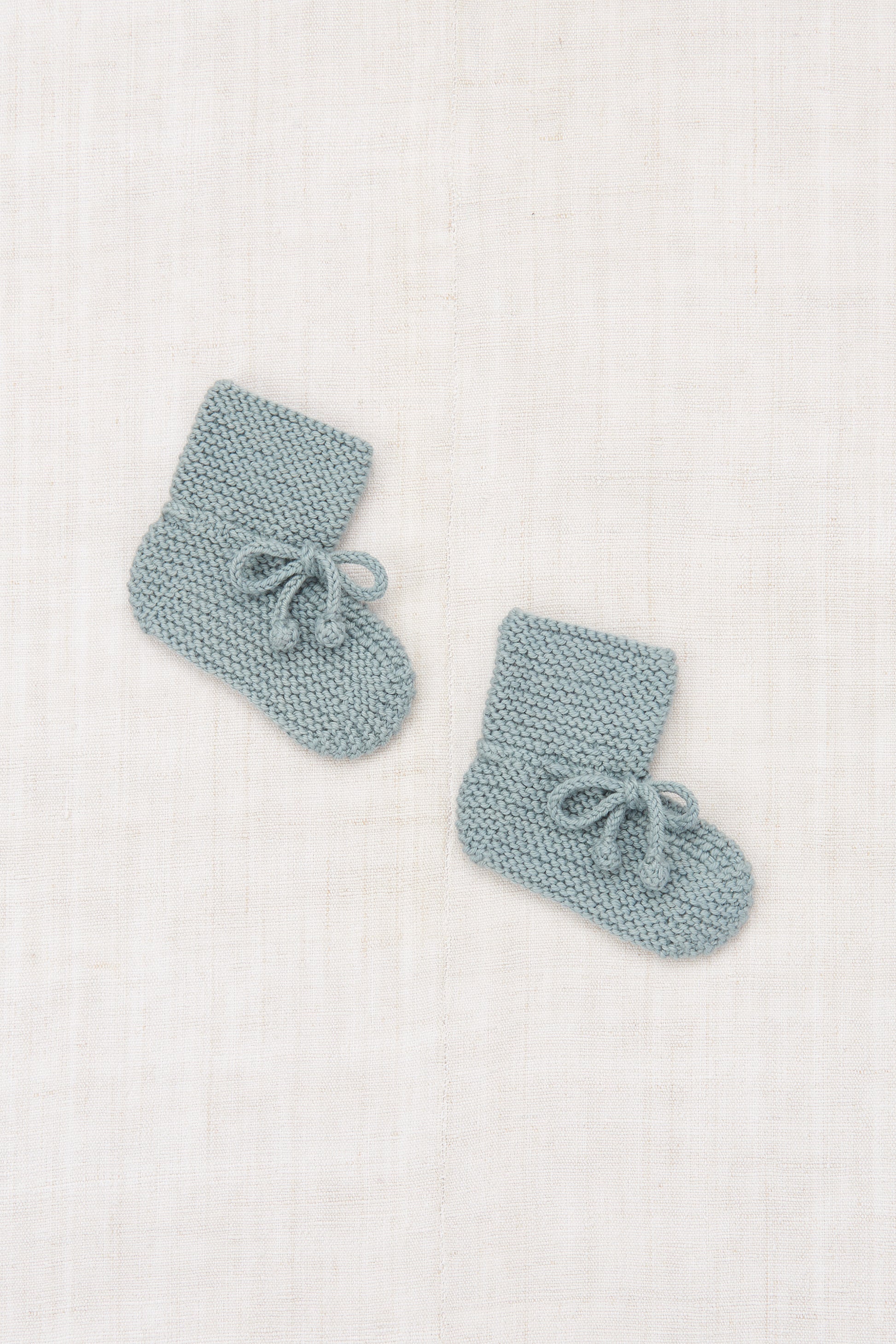 A classic hand-knit bootie set in Merino wool, with popcorn ties at the ankle for a secure fit.