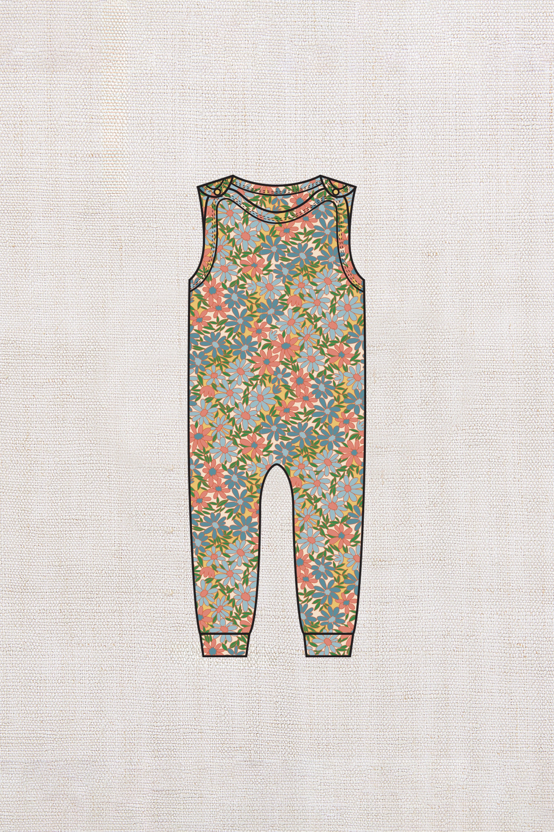 A sleeveless overall onesie in organic Pima cotton, featuring snap closures at the shoulder and cuffs at the hem.