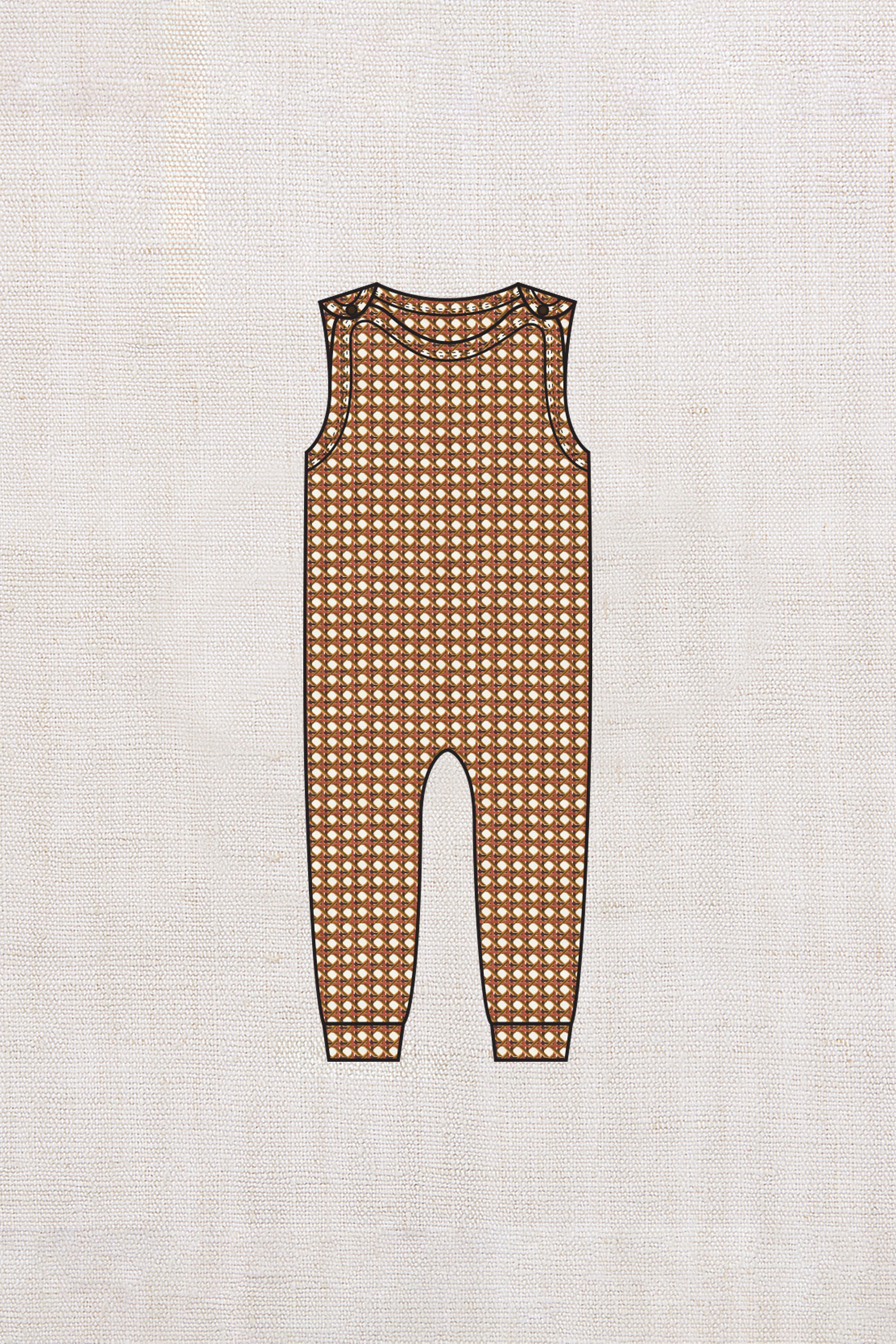 A sleeveless overall onesie in organic Pima cotton, featuring snap closures at the shoulder and cuffs at the hem.