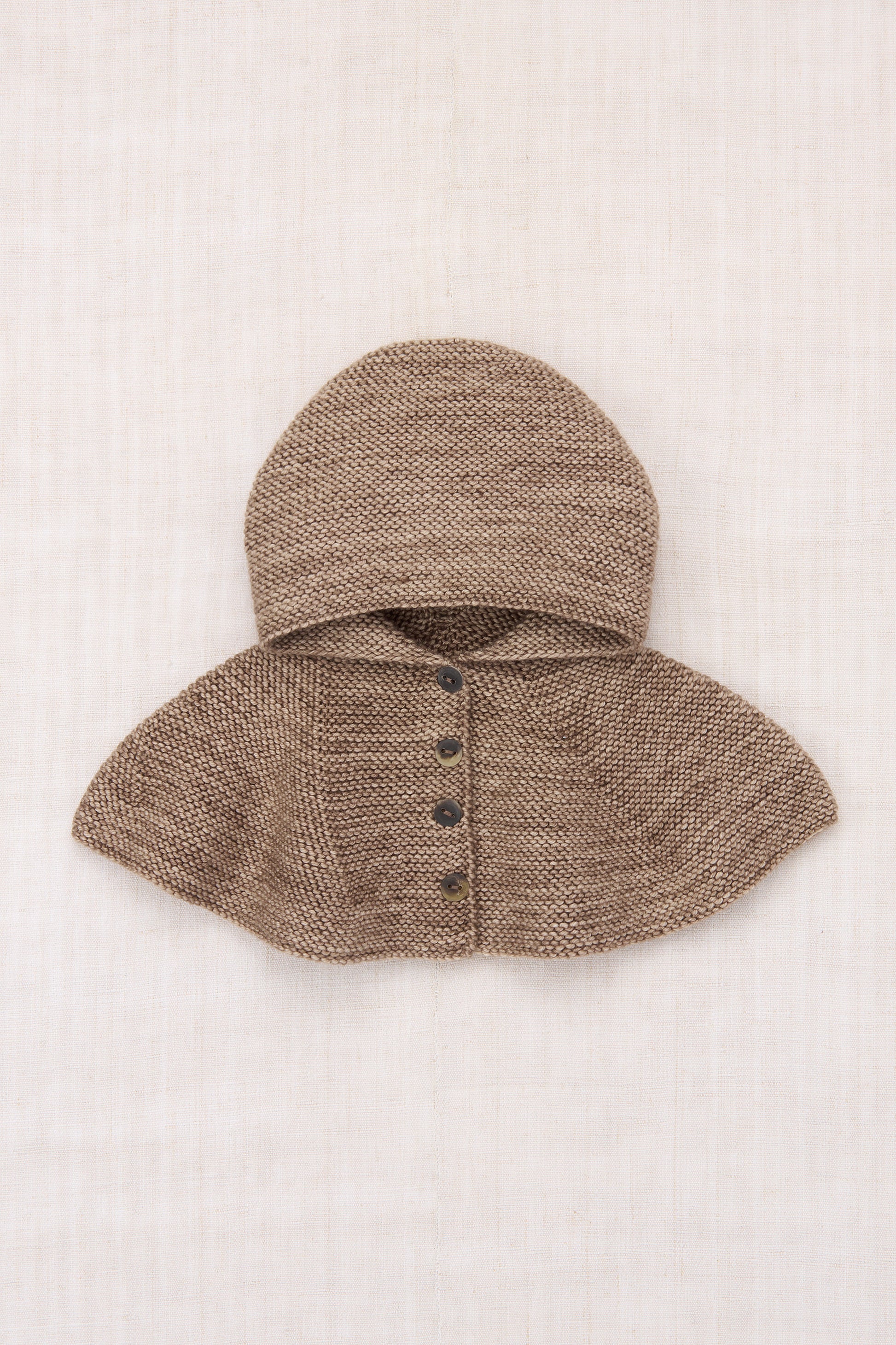 A hand-knit capelet in Merino wool, featuring a bonnet-style hood and a small capelet that drapes over the shoulders, and horn button closure up the front.