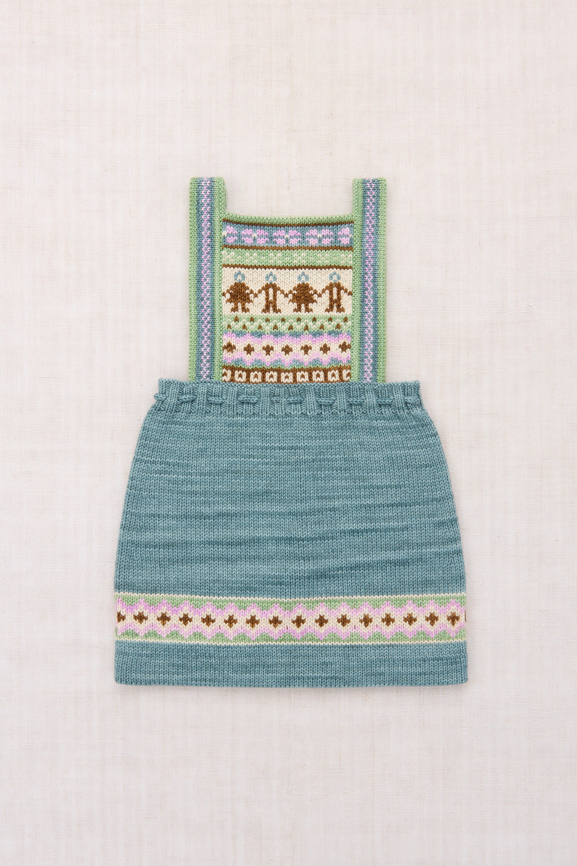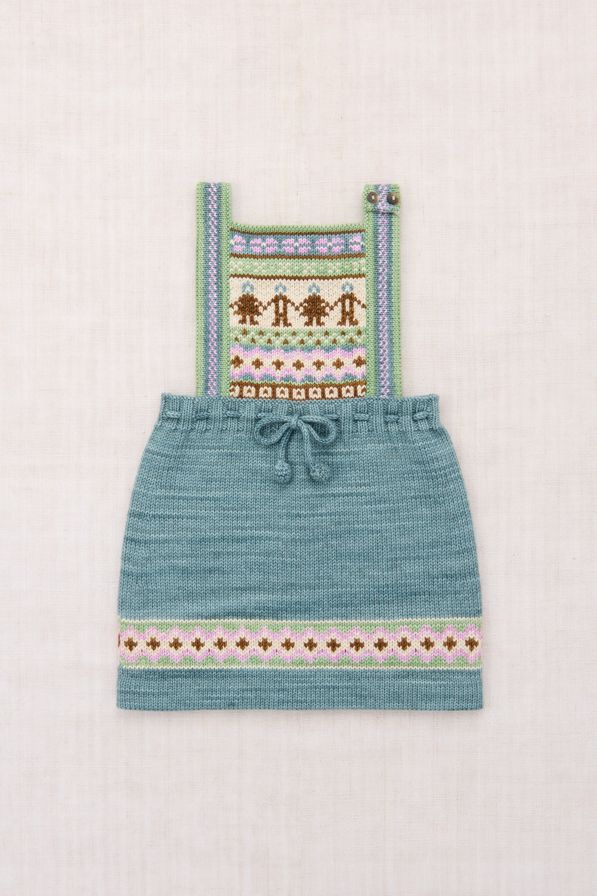 A cozy pinafore in Merino wool, featuring a hand-knit bib and straps with a Fair Isle-inspired motif, ribbed popcorn-tie drawstring waist, and single-strap horn button closure.