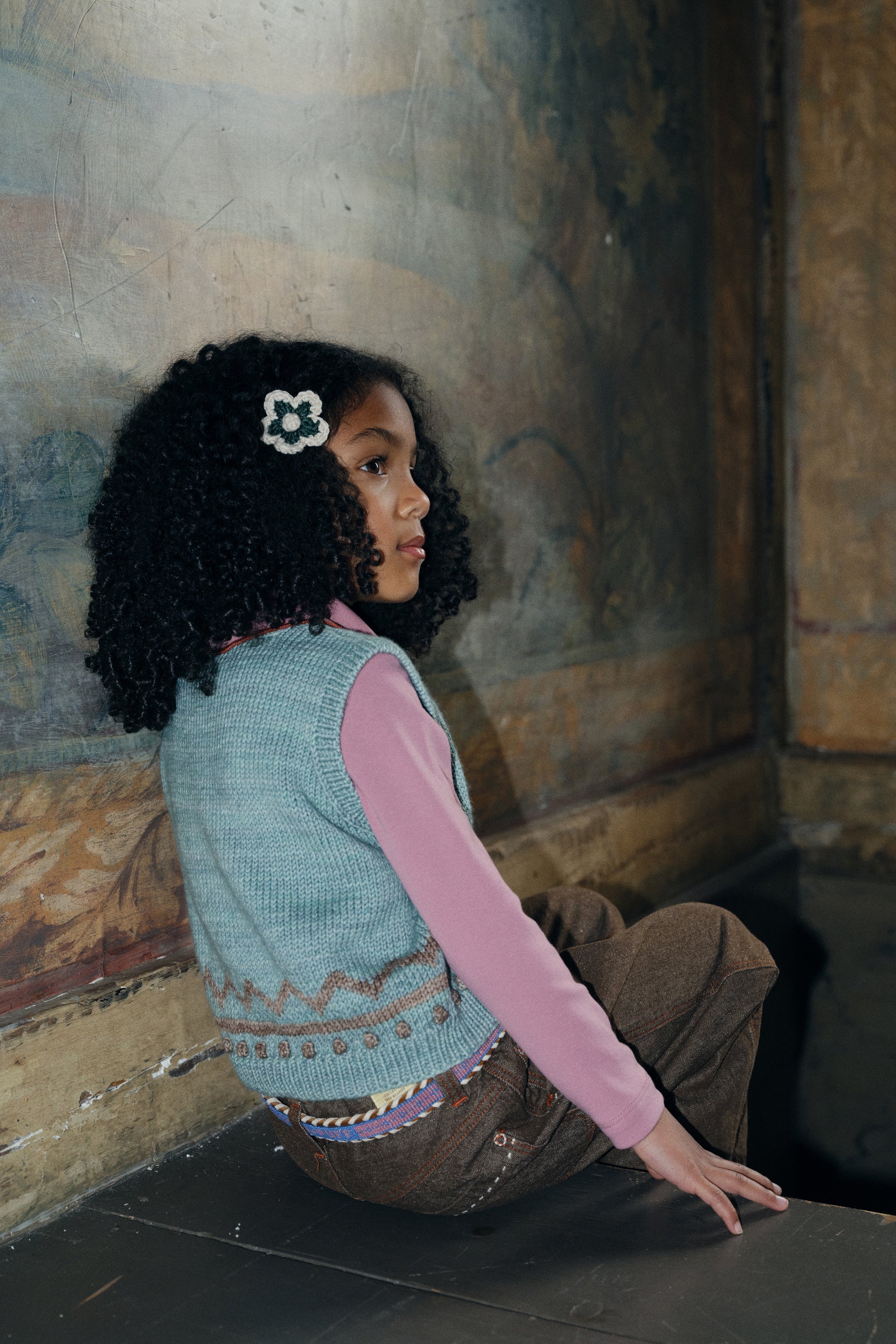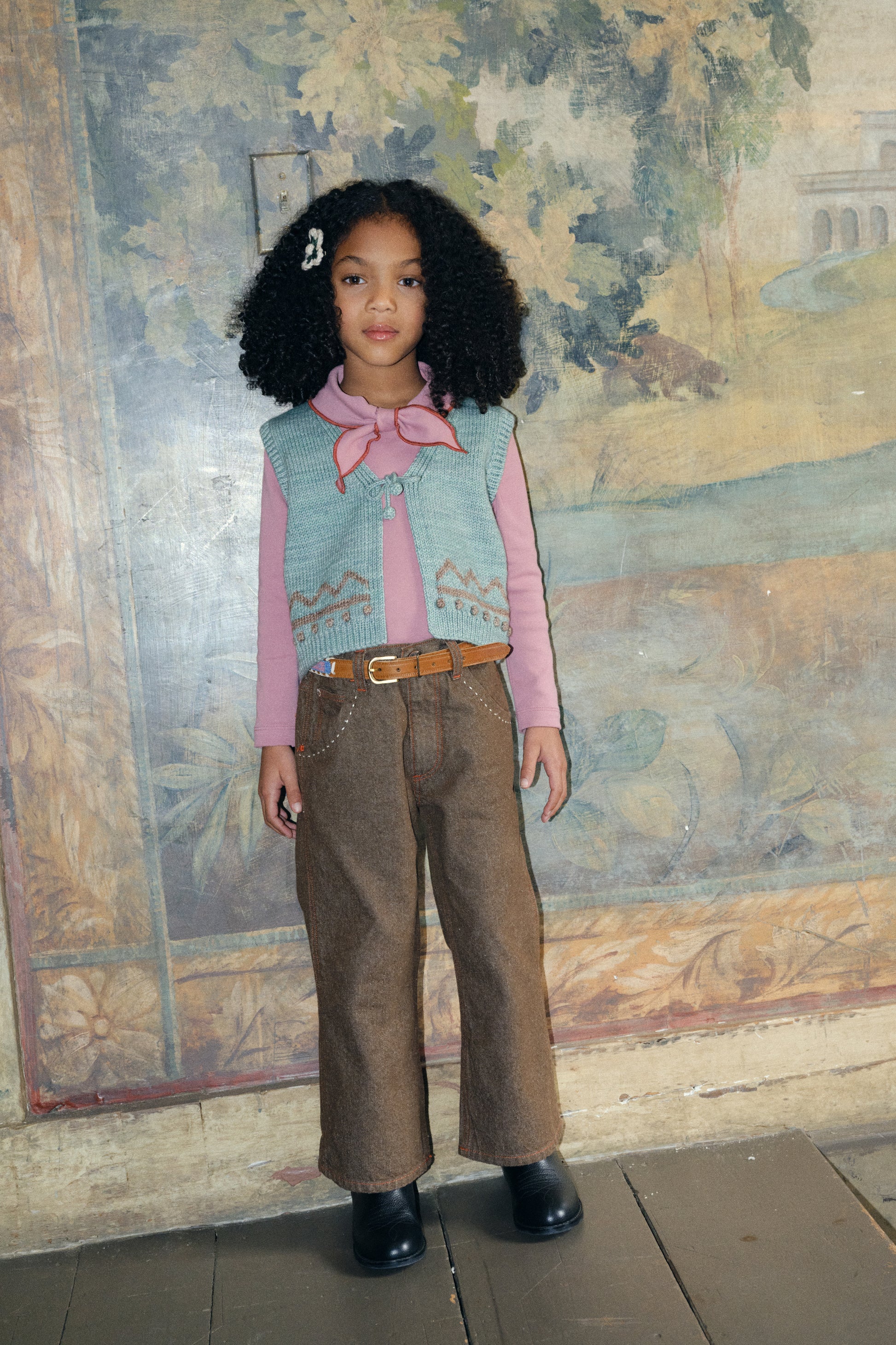A cozy hand-knit vest in Merino wool, featuring hand-worked popcorn stitch details, a zig zag motif, popcorn tie closure, and ribbed trim.