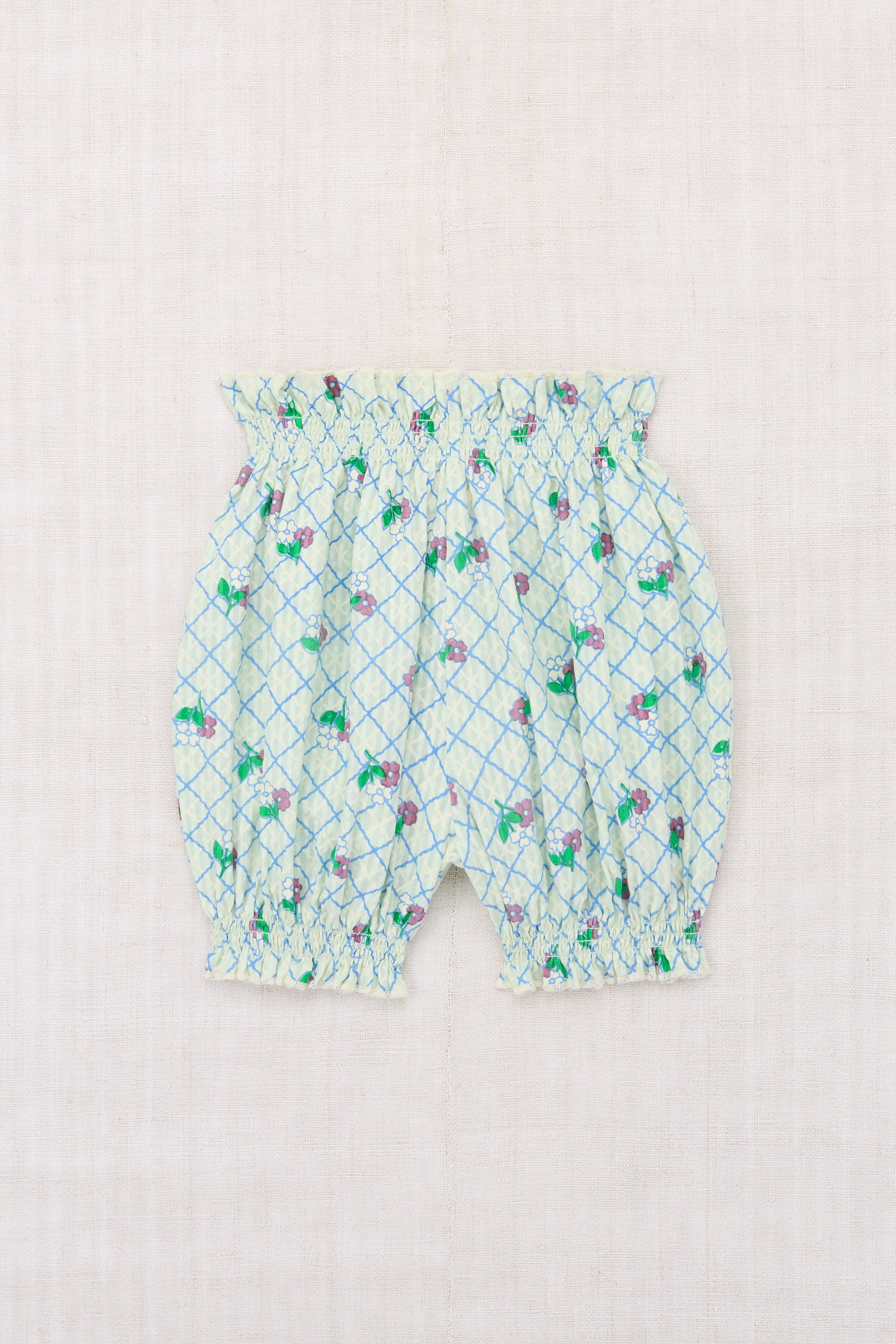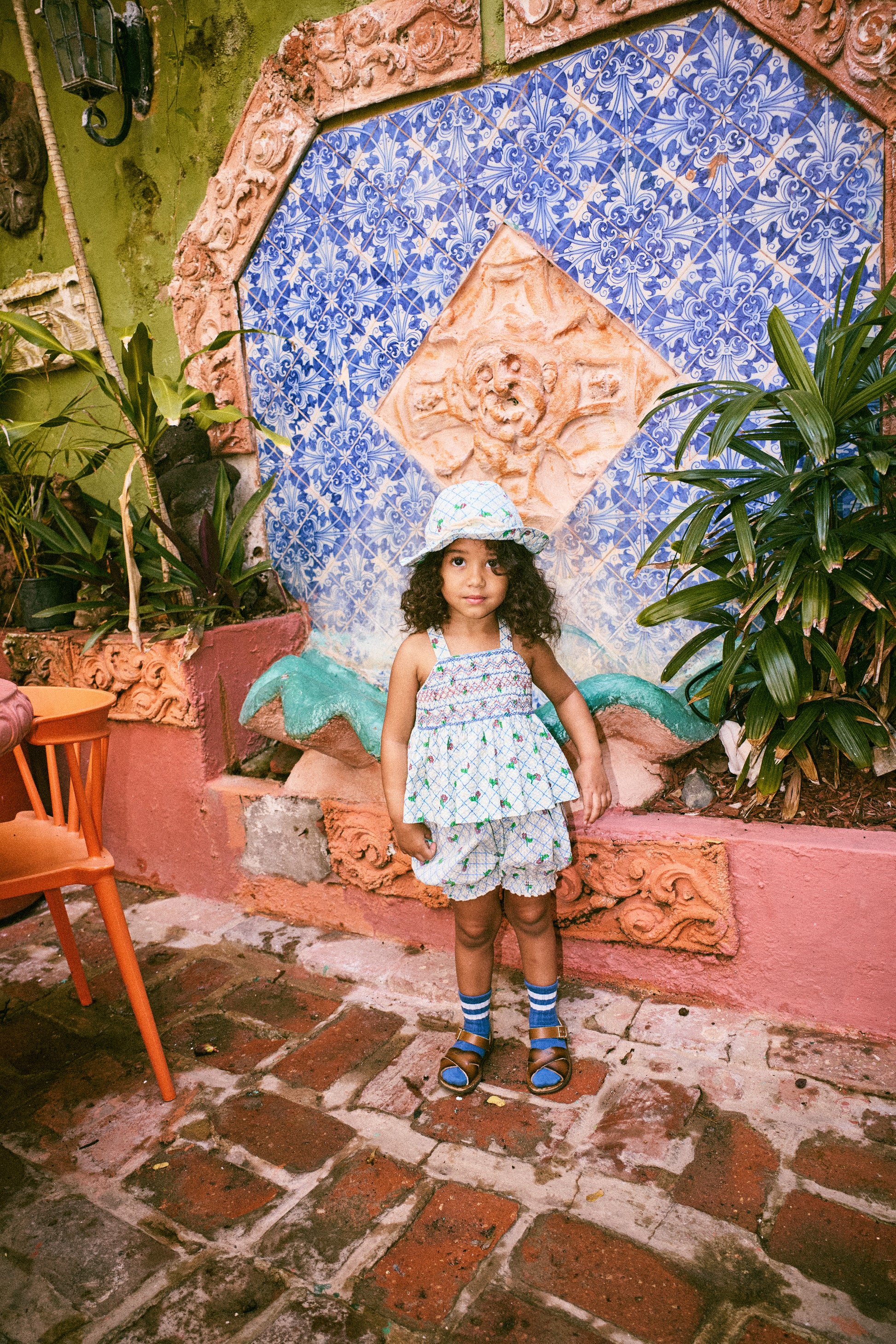 A pull-on bloomer in lightweight organic cotton seersucker, with a textured design and a cinched ruffle elastic waist and leg cuffs with merrowed edges. Finished with French seams — an effortless texture, easily packable for travel. Featuring a print inspired by seaside family vacations.