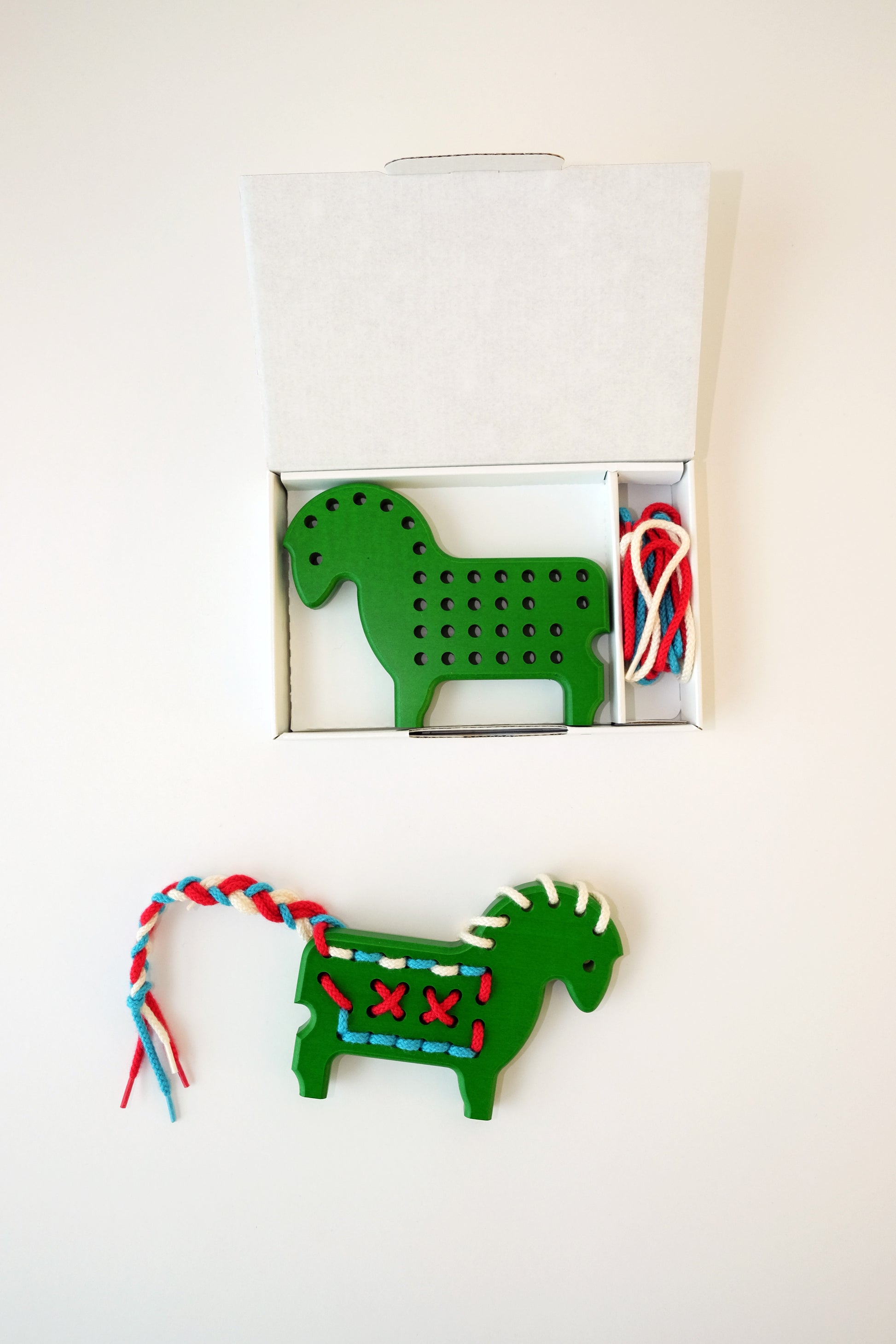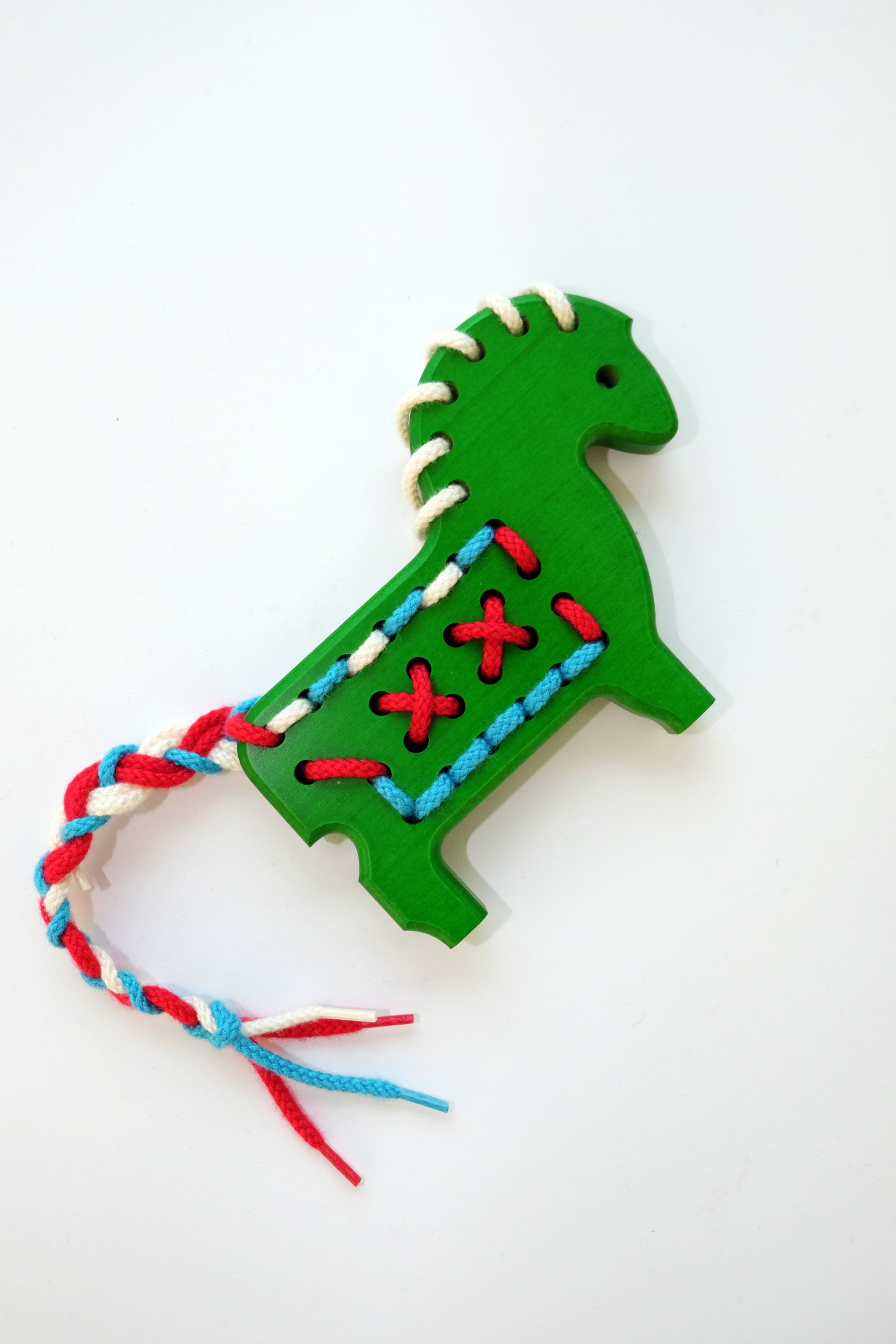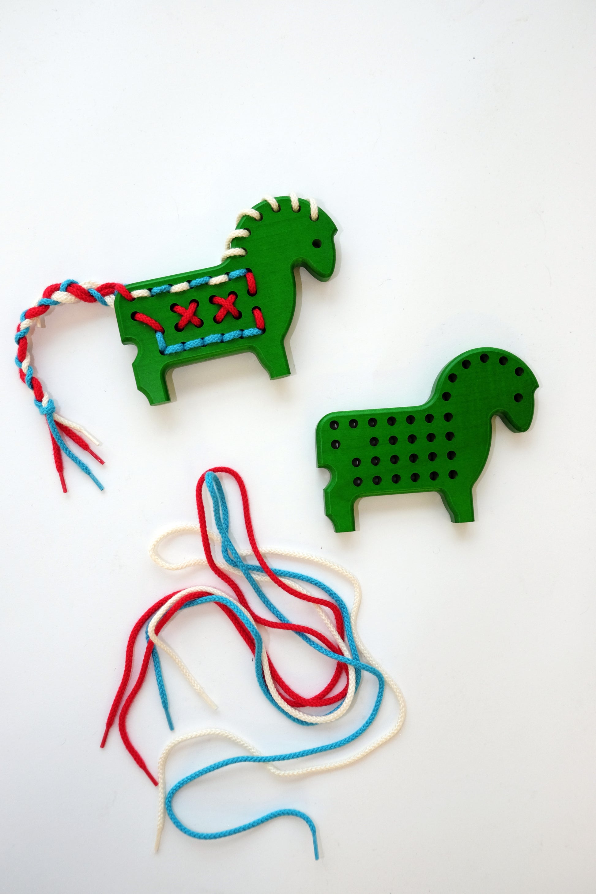 What an inspiring name for learning to thread. With three colored cotton cords, different manes or threaded patterns can be created on the ponies. What could a saddle look like for a child’s doll to ride on? Designed by Fredun Shapur.