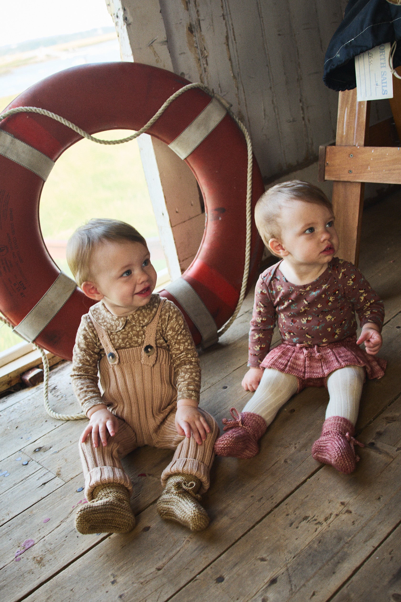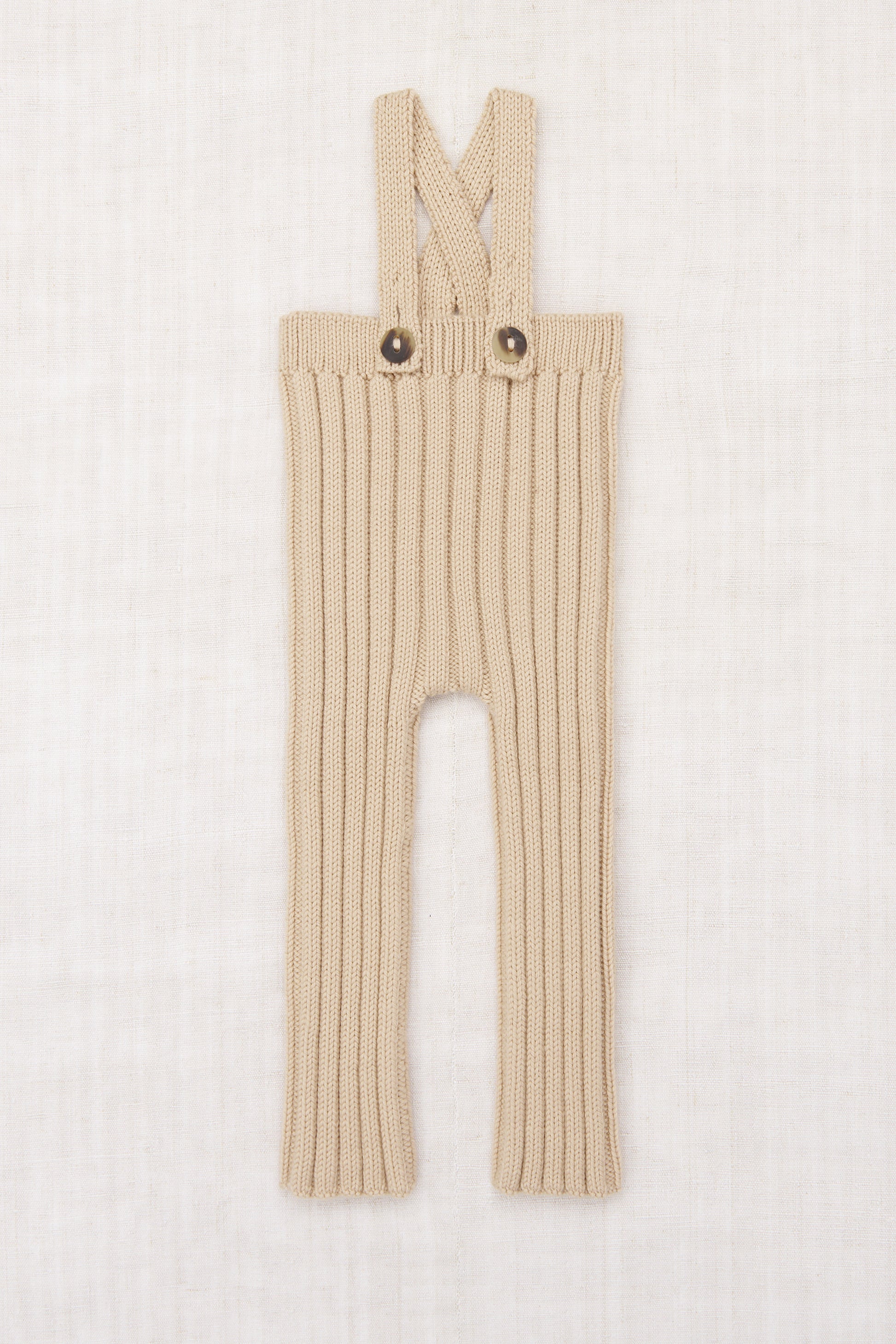 A ribbed overall in a Merino wool knit, with adjustable straps and horn button closure.
