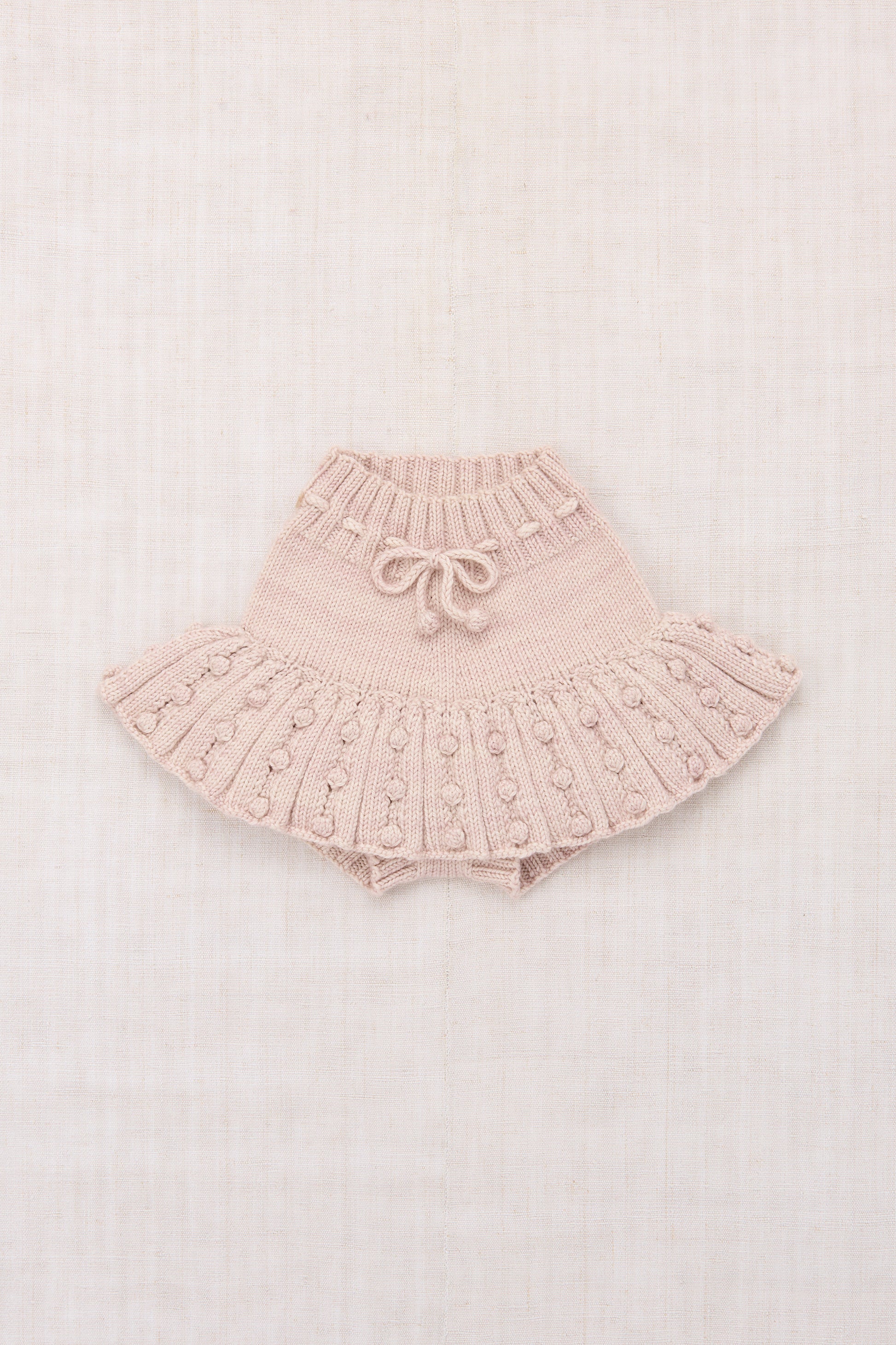 A hand-knit skirt in Merino wool, featuring attached bloomers with ribbed cuffs, eyelet popcorn stitch details, and a ribbed waistband with a popcorn-tie drawstring for a secure fit.