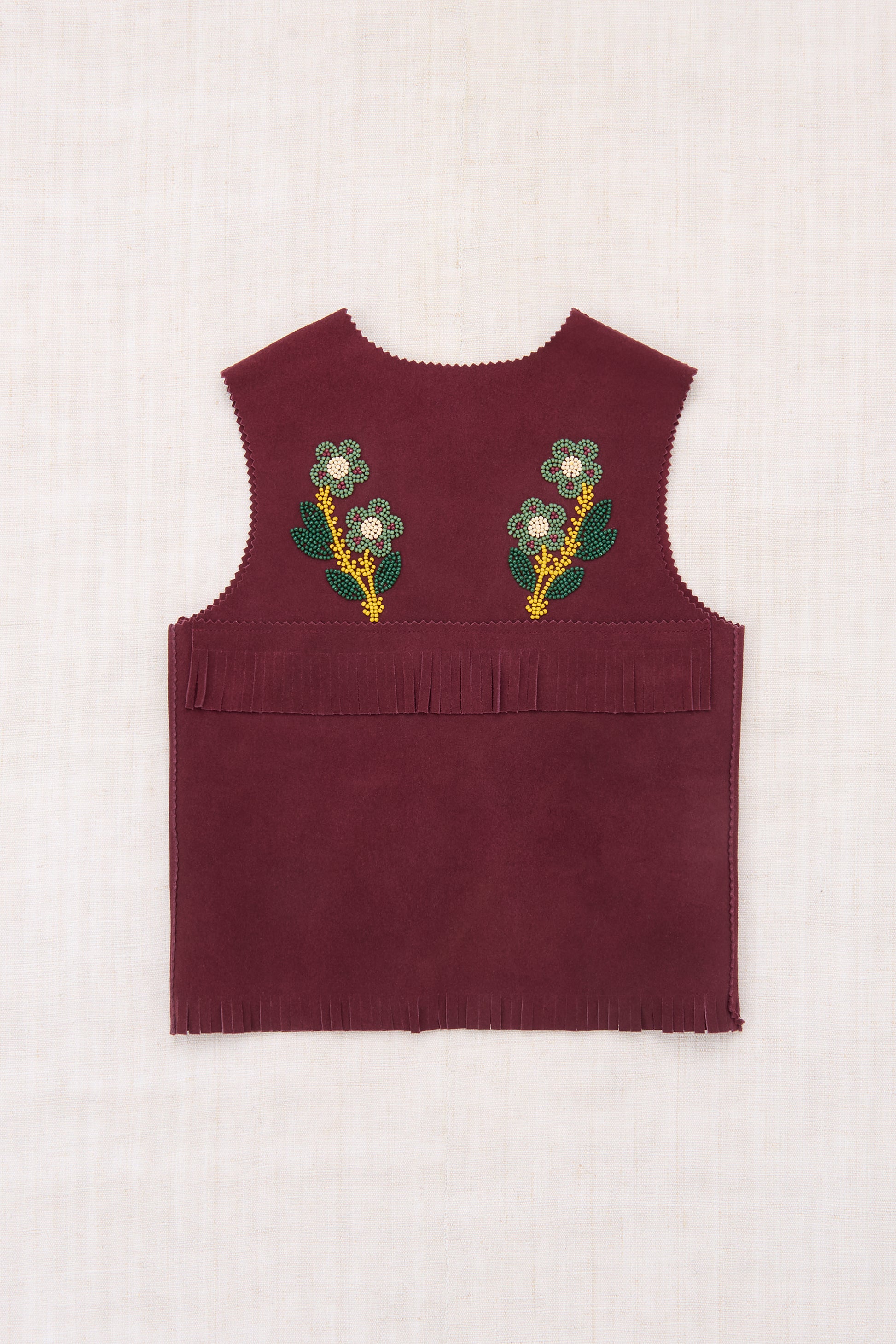 A vest in 100% leather suede, featuring zig zag and fringe trim, fringe detailing, hand-beaded glass motifs, and tie closure.