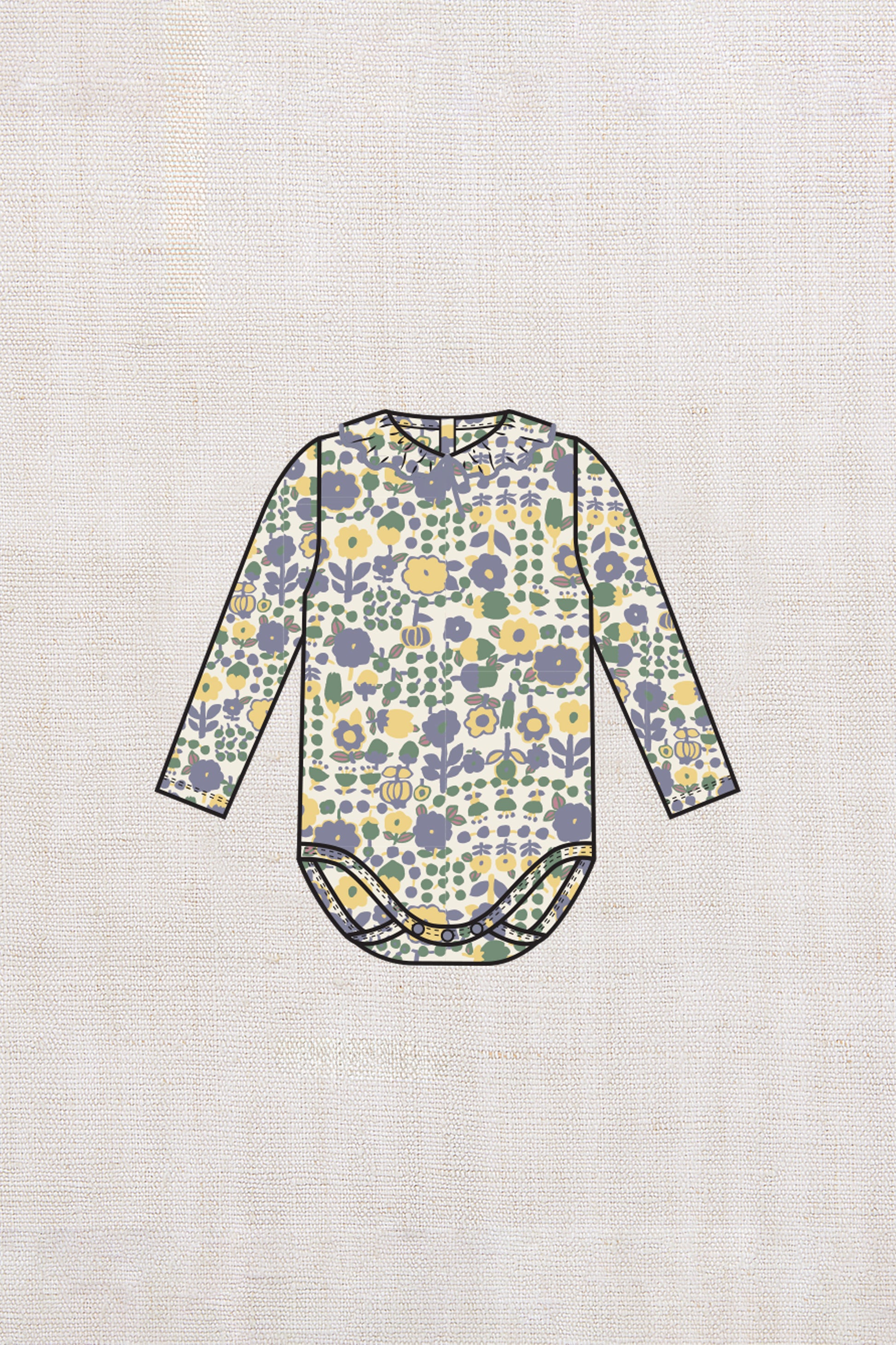A classic long-sleeved onesie in organic Pima cotton, featuring a ruffle collar with a contrast merrowed edge and mini bow. Finished with snap closure at the bottom and back neck — perfect on its own or layered for a versatile, buildable look.