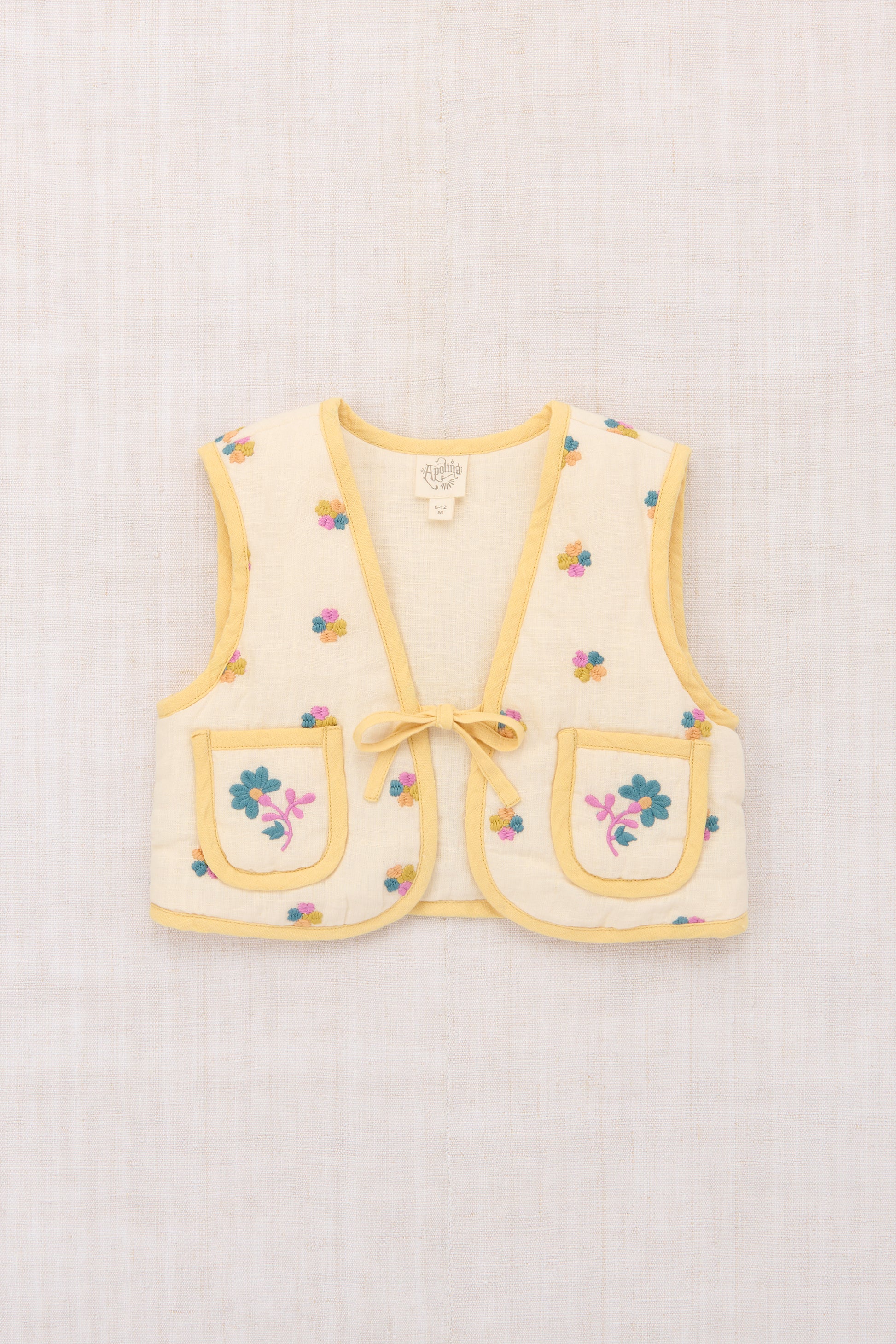 A sweet padded gilet in linen with all over contrast embroidery design and floral embroidery motifs on pockets. Finished with contrast binding and a tie front. The perfect layering piece in playful retro tones.