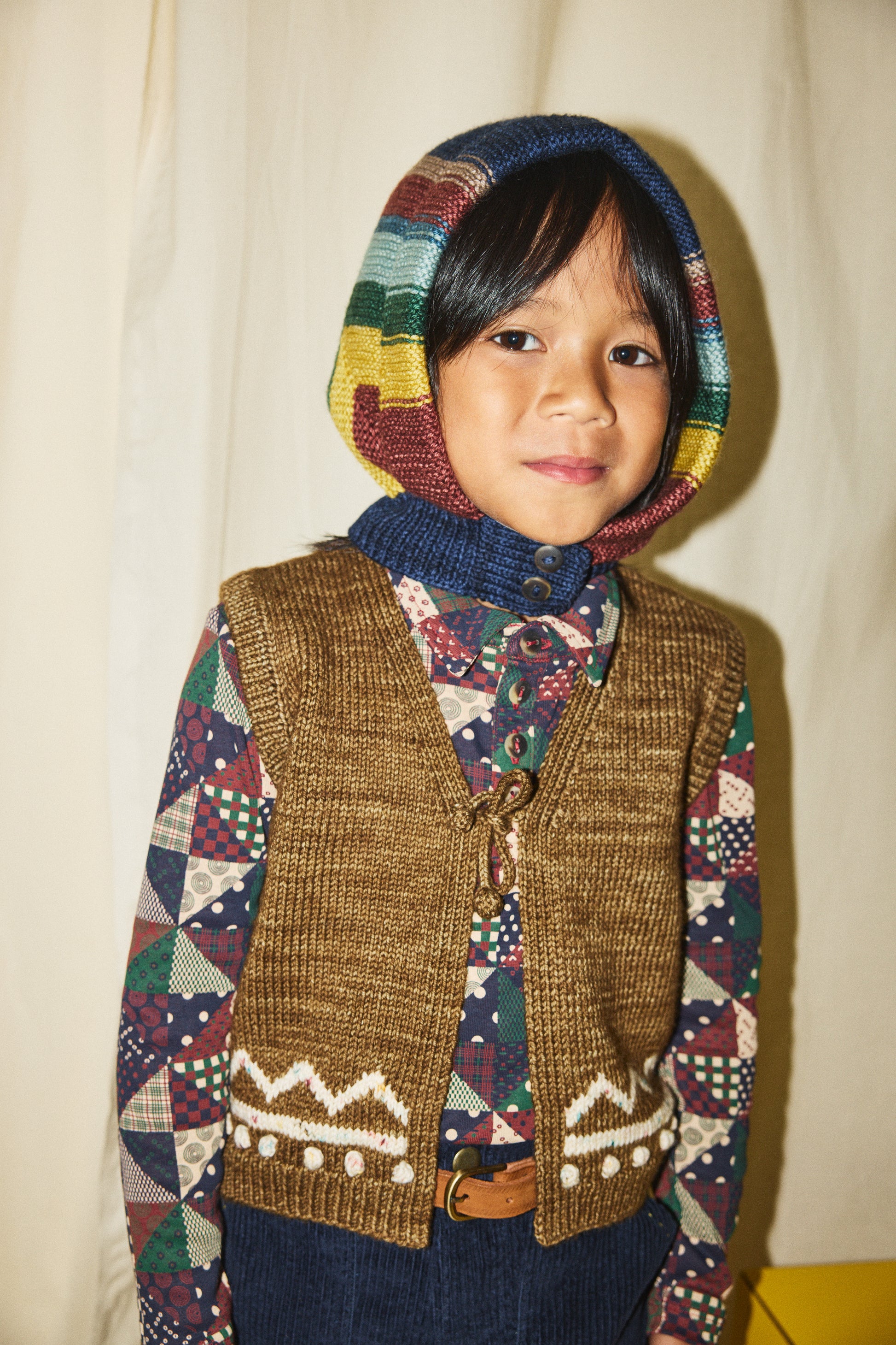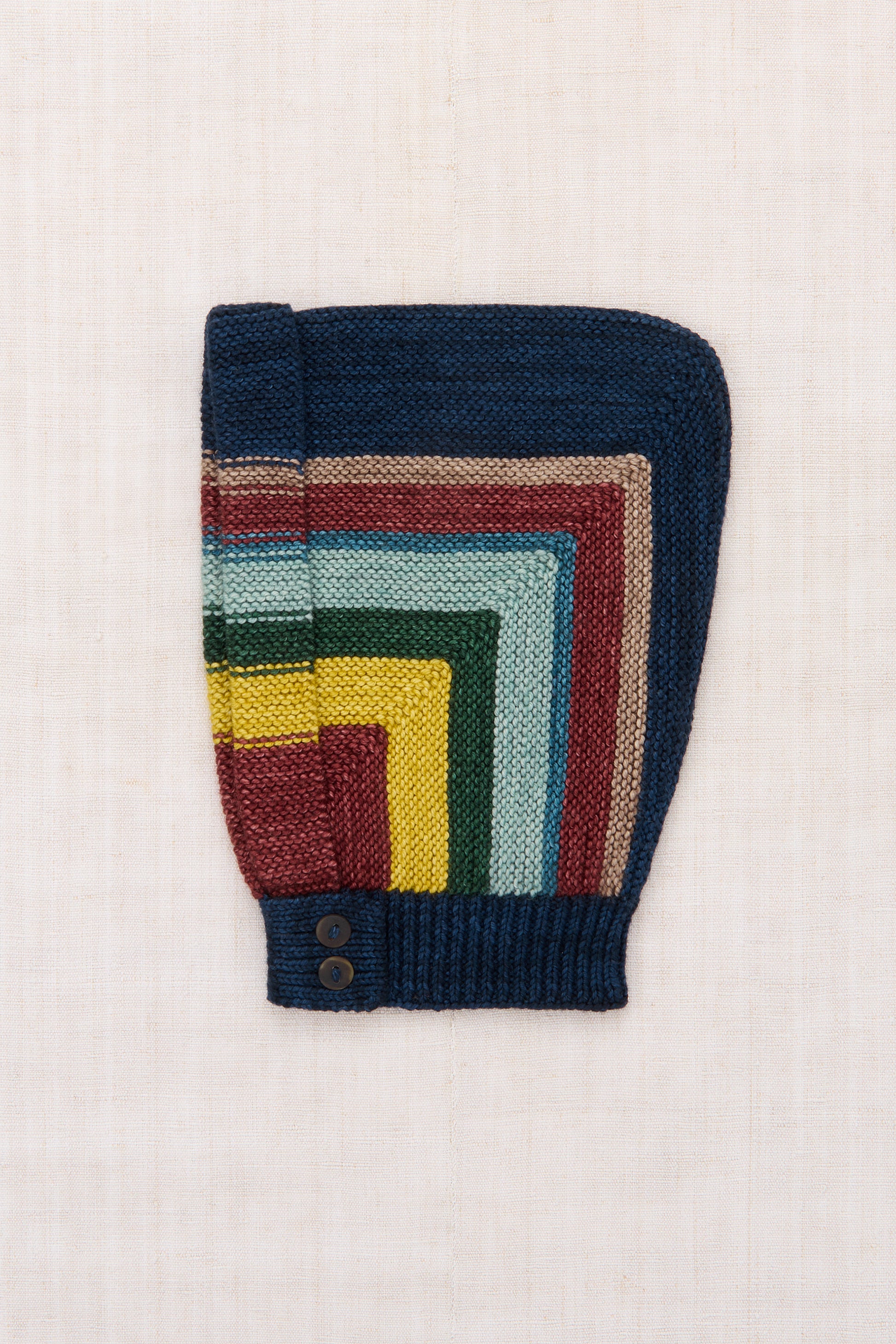 A hand-knit hood in Merino wool, featuring a multi-color mitered squares design, rolled trim, and horn button closure.