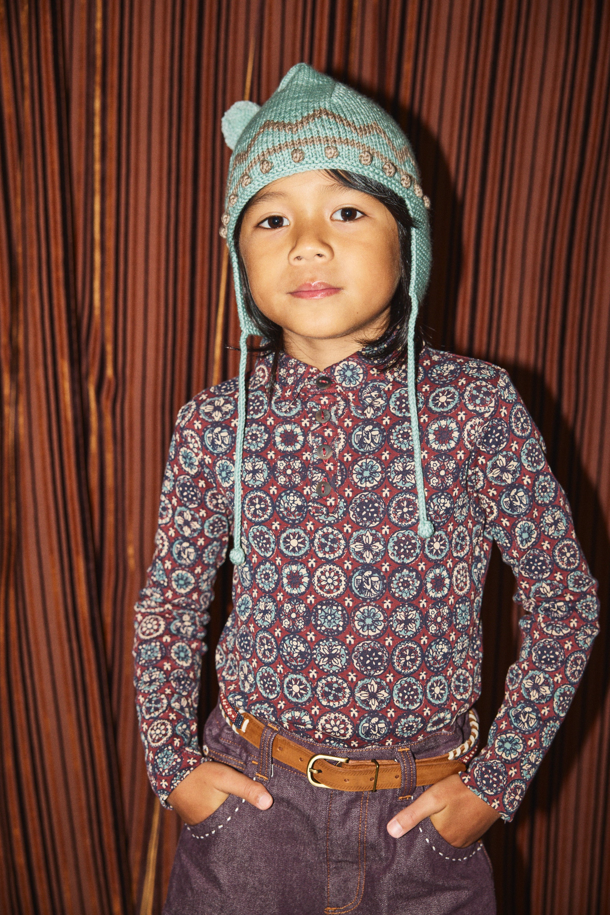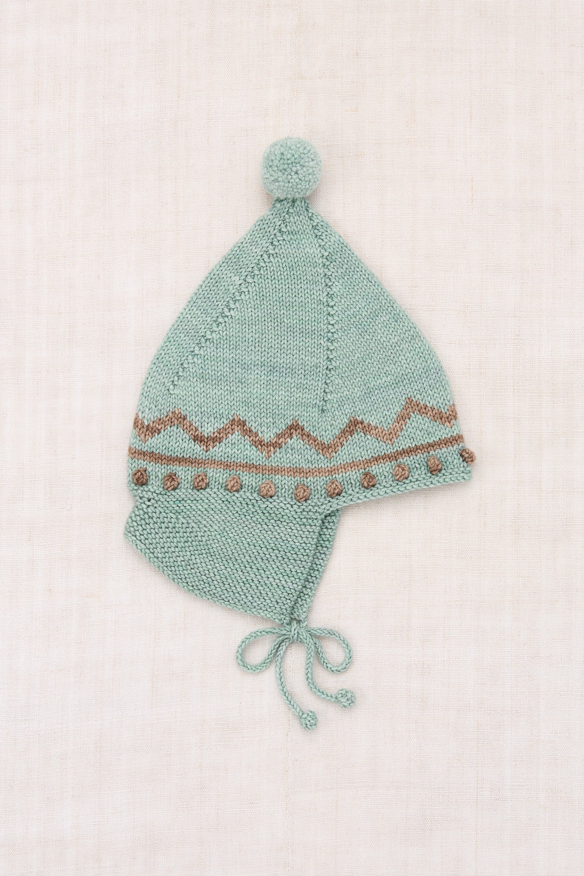 A hand-knit hat in Merino wool, featuring hand-worked popcorn stitch details, a zig zag motif, ear flaps, a stand-up pointy pom-pom top, and popcorn-tie closure for a secure fit.