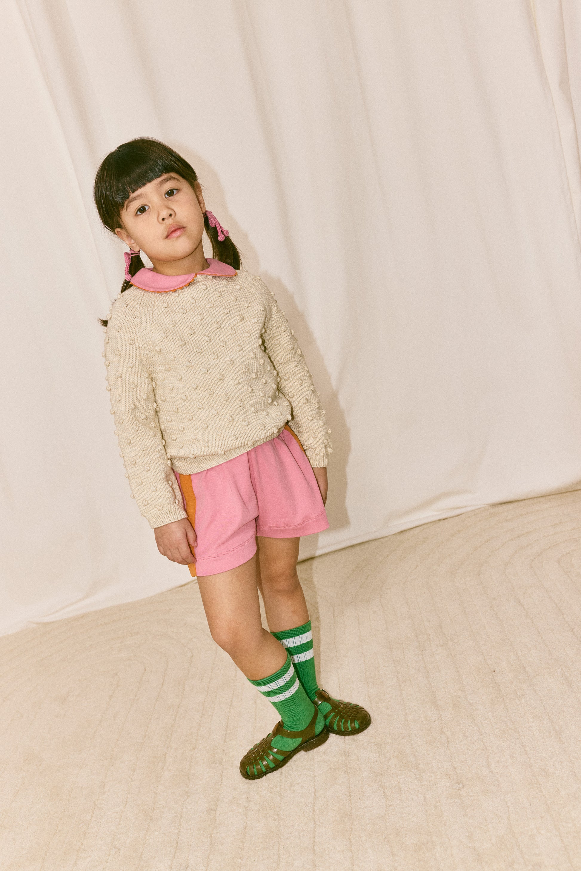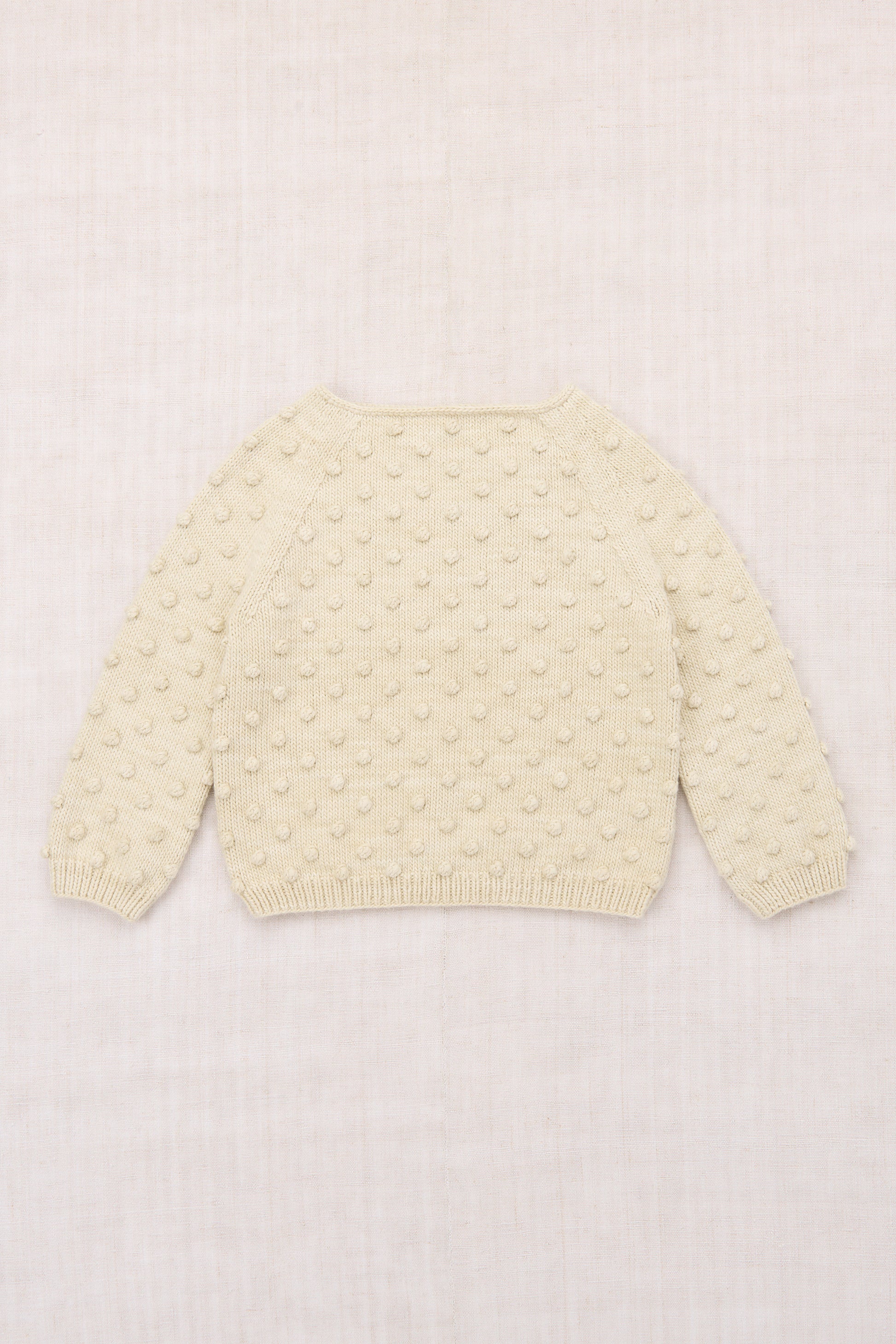 Misha & Puff’s signature hand-knit sweater in Pima cotton for warmer seasons, featuring an all-over popcorn stitch, rolled bateau neckline, ribbed cuffs and hem, and corozo button keyhole closure at the back neck.