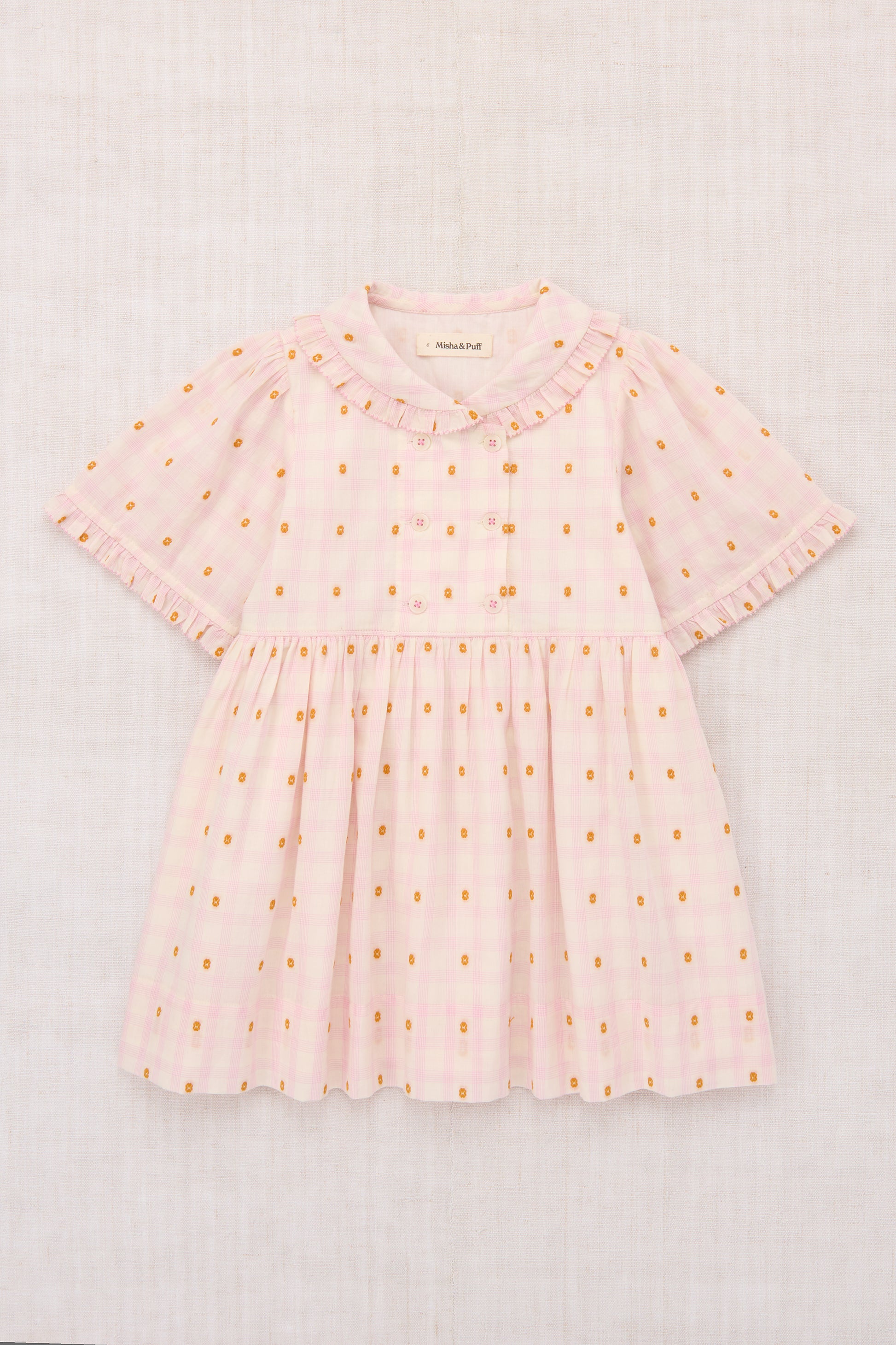 A dress in lightweight organic cotton plaid, with a woven textured design, rounded collar, elbow-length sleeves, gathered waist, ruffle trim with edge detail, and a double-breasted corozo button closure. Lined in cotton voile and finished with French seams.