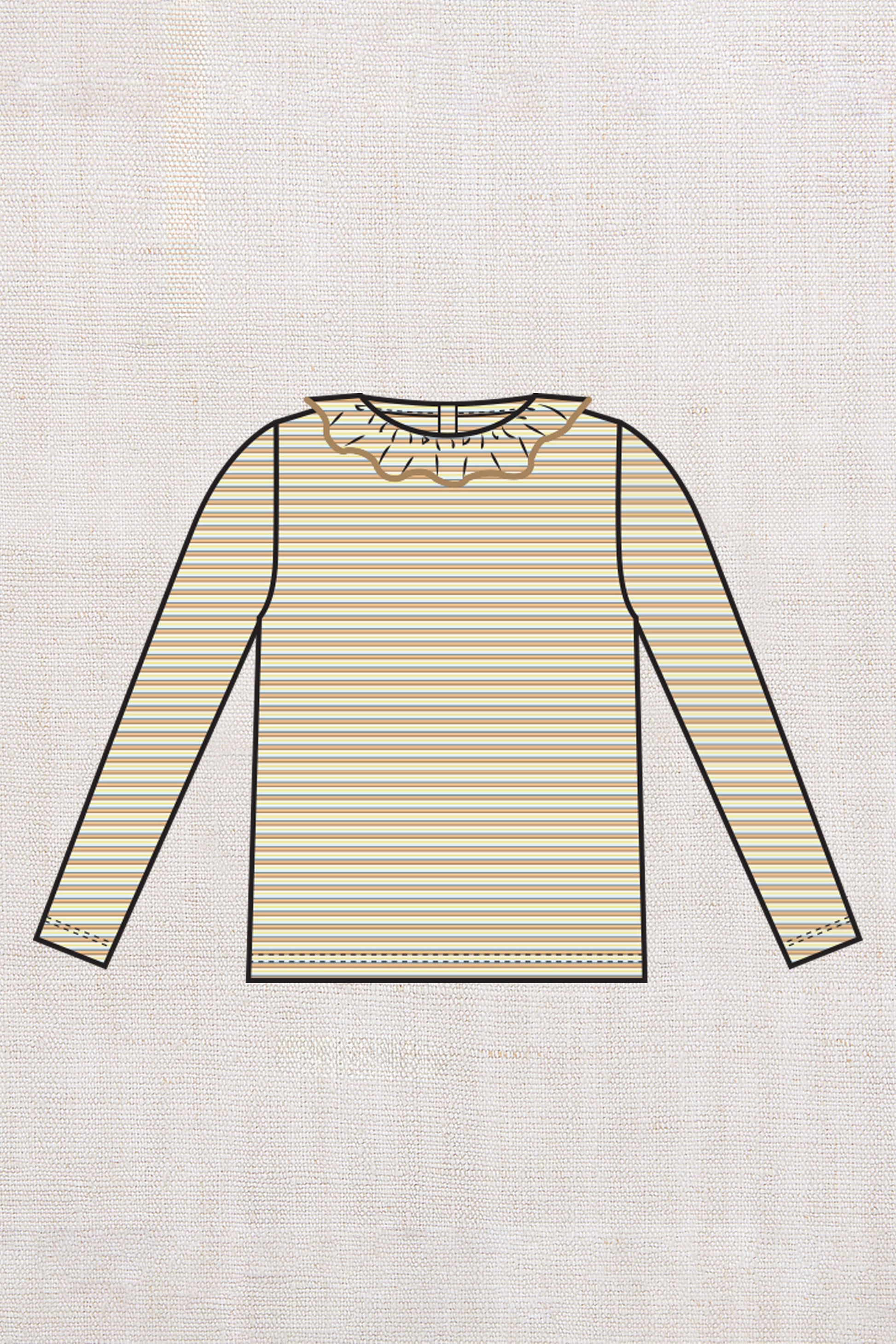 A classic long-sleeved slim-fit top in organic Pima cotton, featuring a gathered ruffle neck with a contrast merrowed edge, and a snap closure at the back neck. Each color of the stripes featured in this style are dyed separately and then knit together, creating colors that last longer.