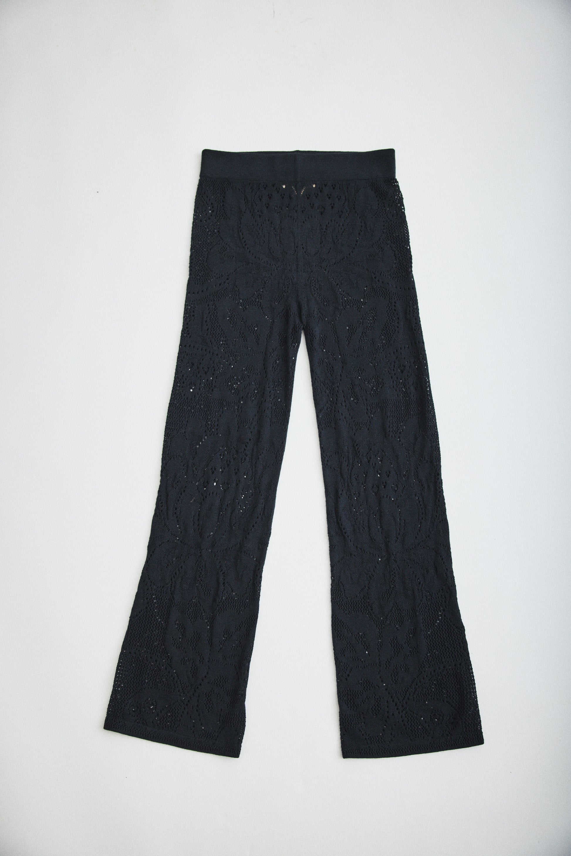 A lace pant in Pima cotton, featuring a placed pointelle lace pattern developed from our favorite vintage iterations. Designed with a high rise, soft-banded elastic waistband, and a straight leg with a subtle kick-flare. Perfect on its own or layered over tights.