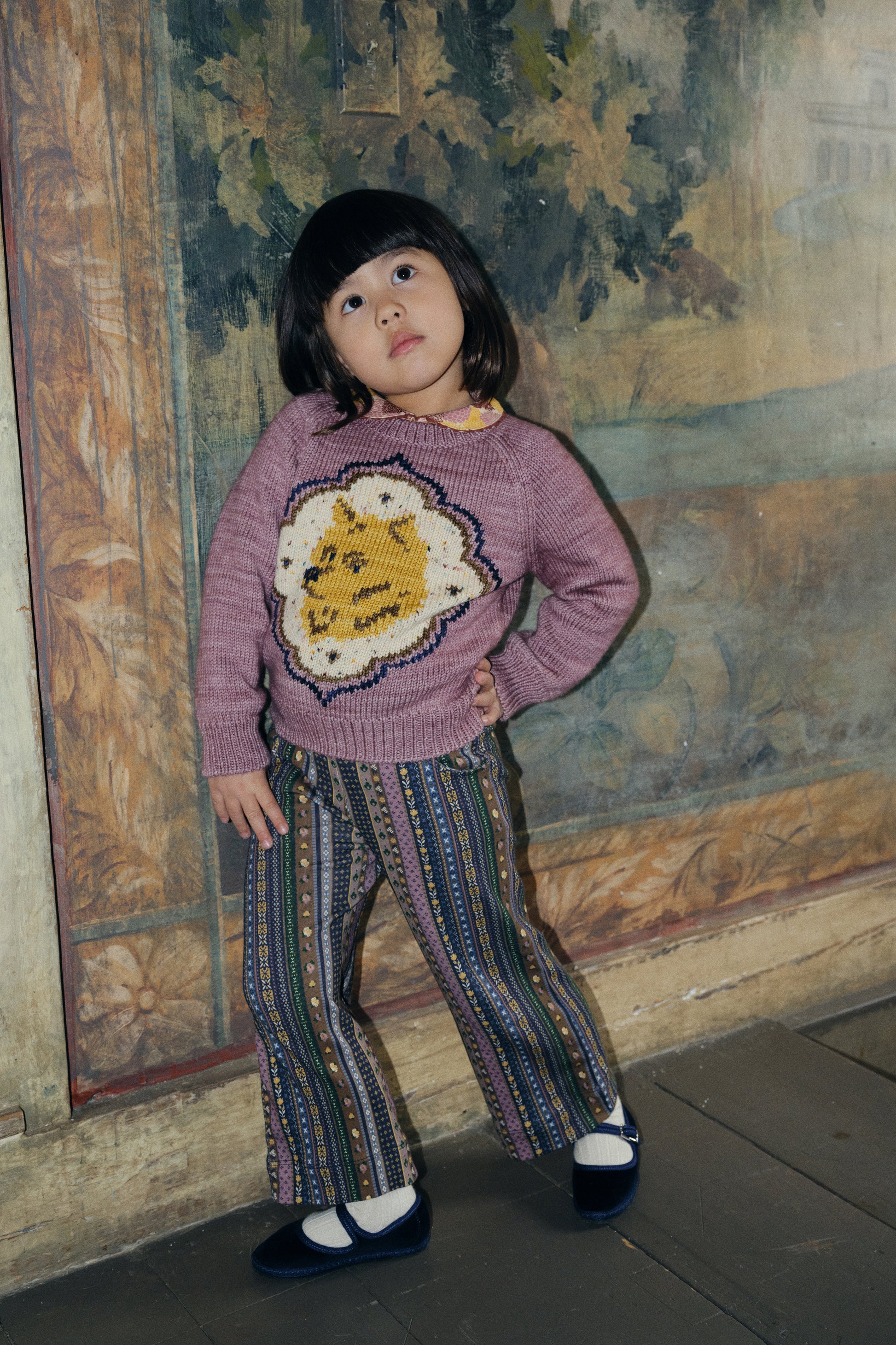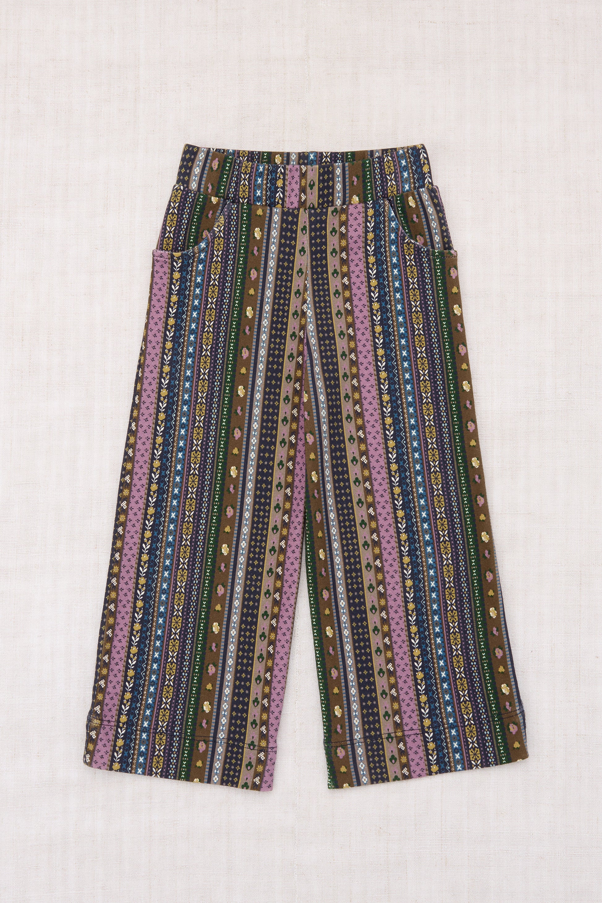 A fitted pull-on pant in organic Pima cotton, featuring a slight A-shaped flare, front pockets, and a soft banded elastic waistband.