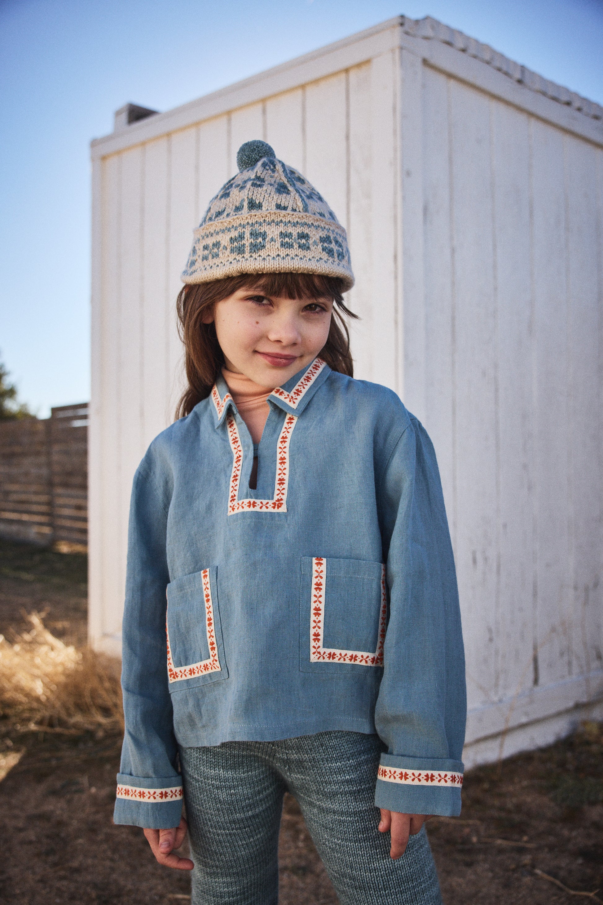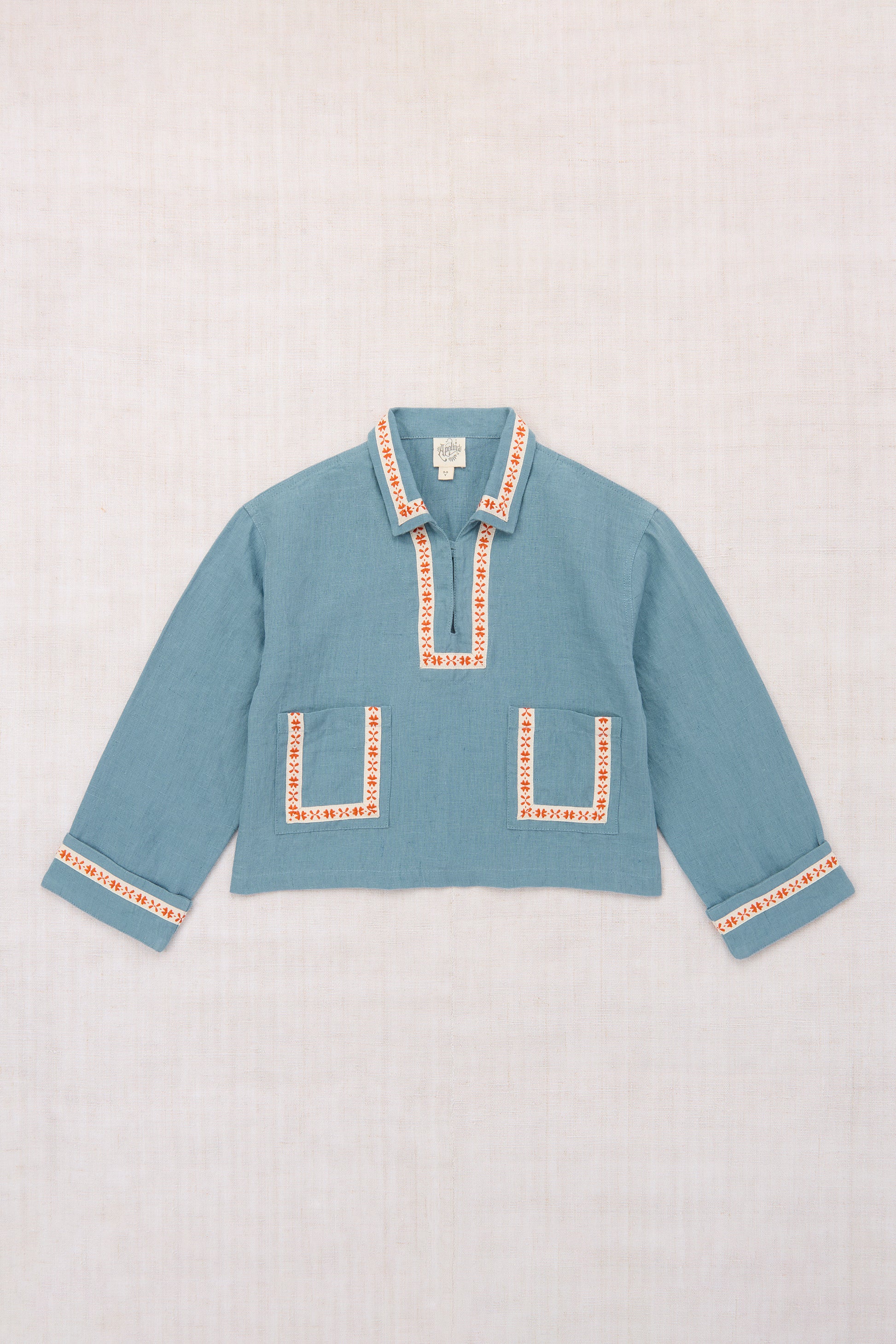 A unisex shirt in soft linen featuring overlaid bespoke folk floral ribbon detail at collar, cuffs and square pockets. Boxy fit silhouette with turned cuffs and concealed button opening.