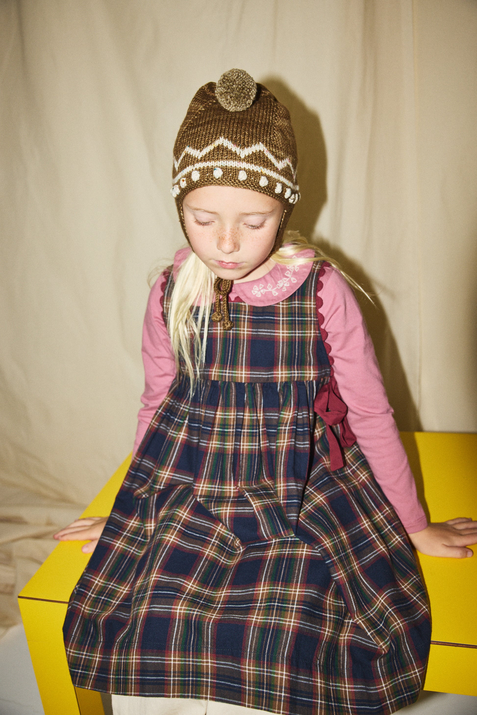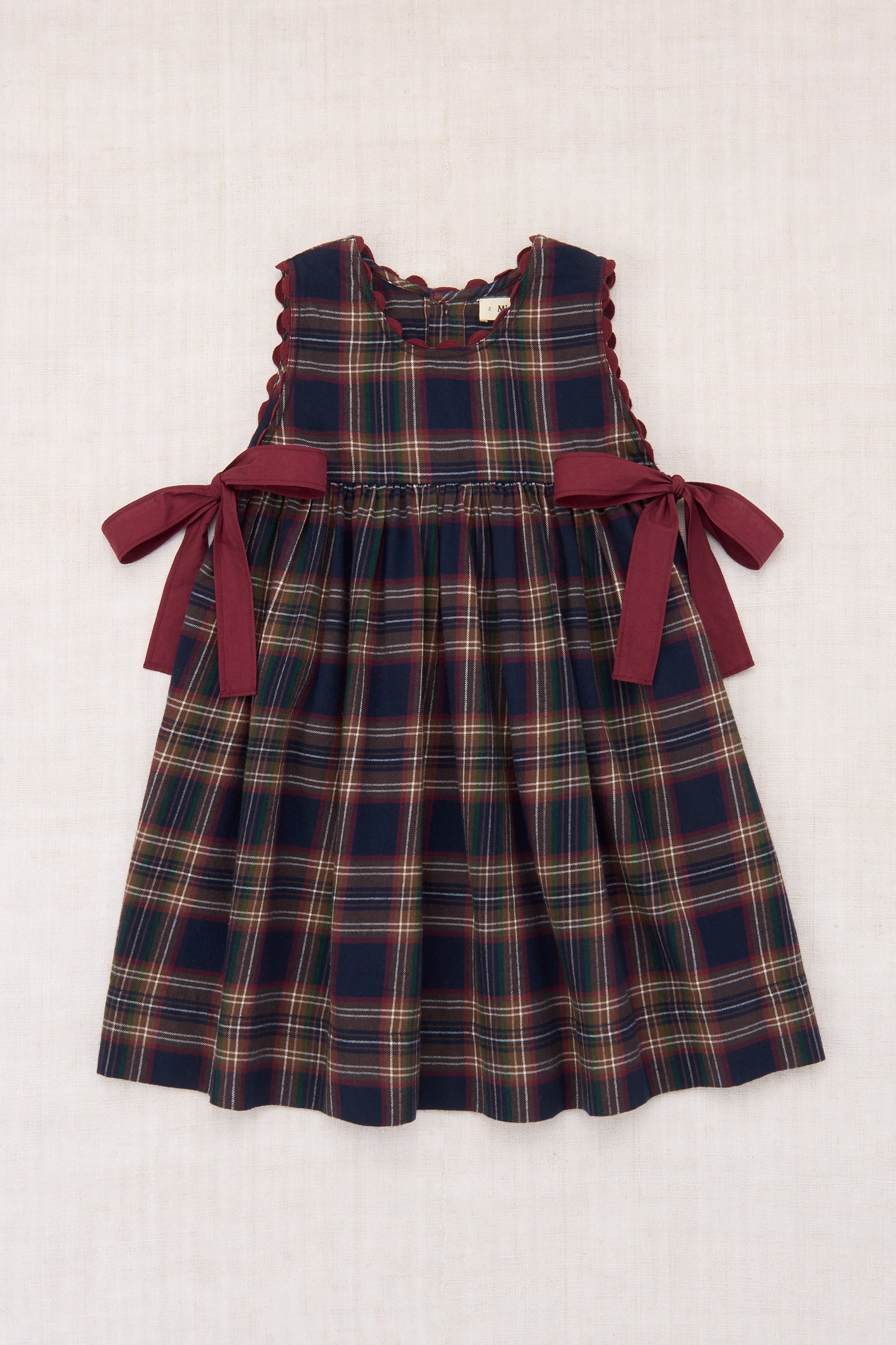 A dress in cotton flannel, slightly brushed for a soft feel, featuring inset rickrack trim along the neck and arms, two bows with side-arm closures, and a corozo button closure down the back. Finished with French seams.
