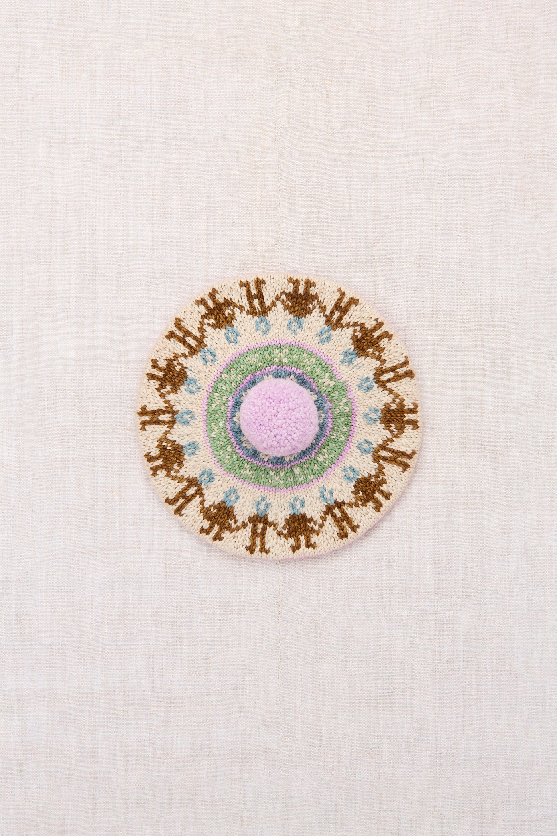 A hand-knit beret in Merino wool, featuring a Fair Isle-inspired colorwork motif and pom-pom top.