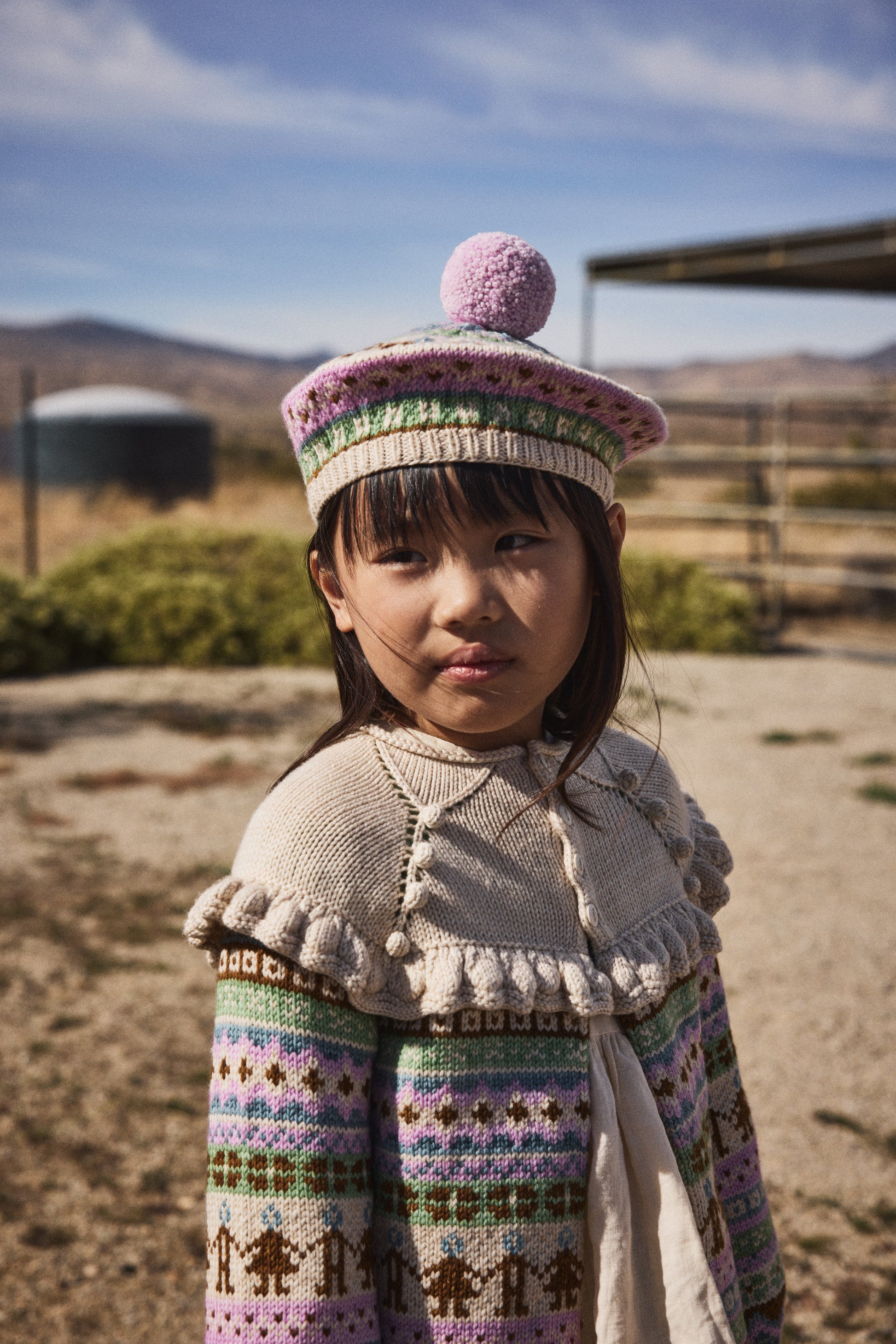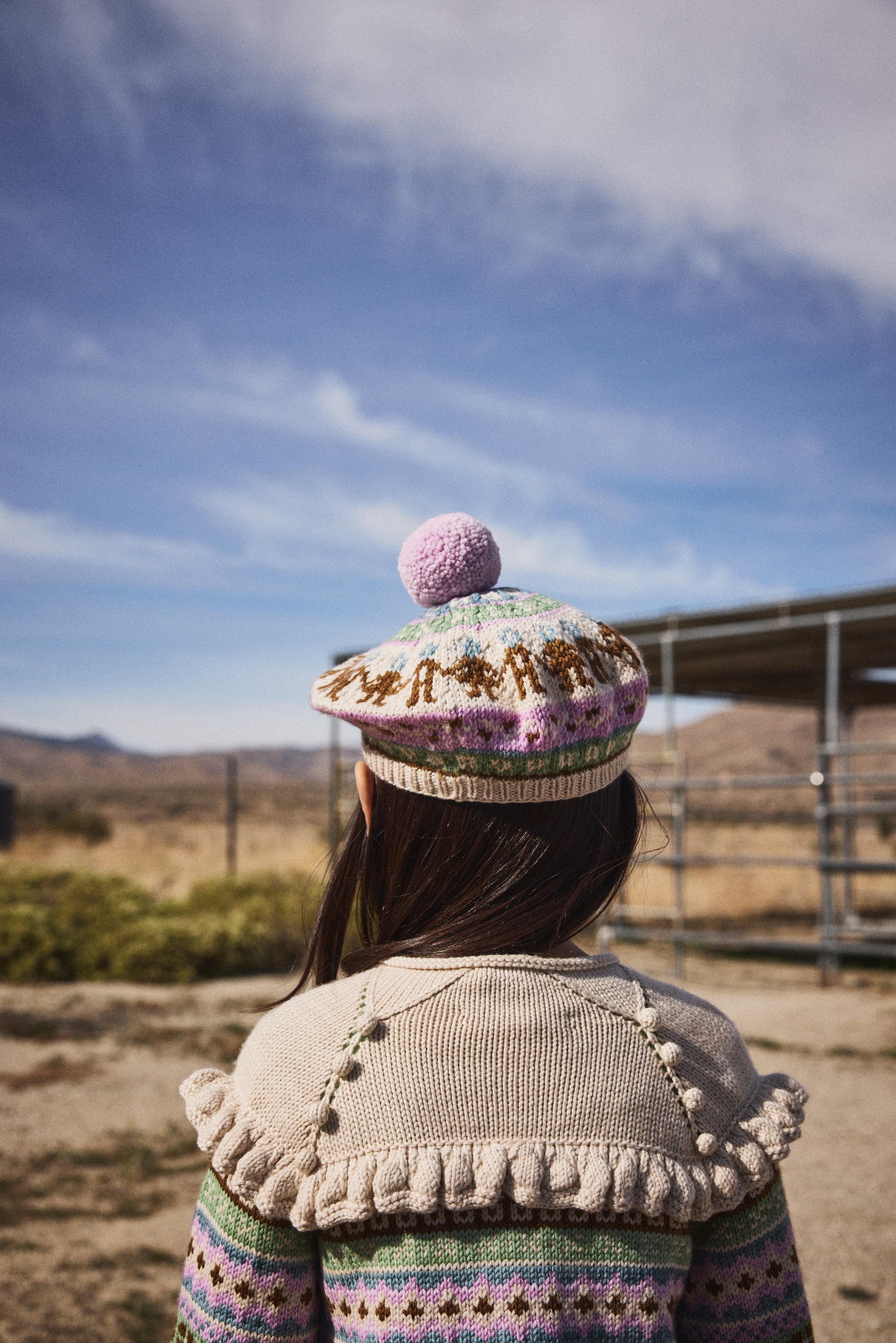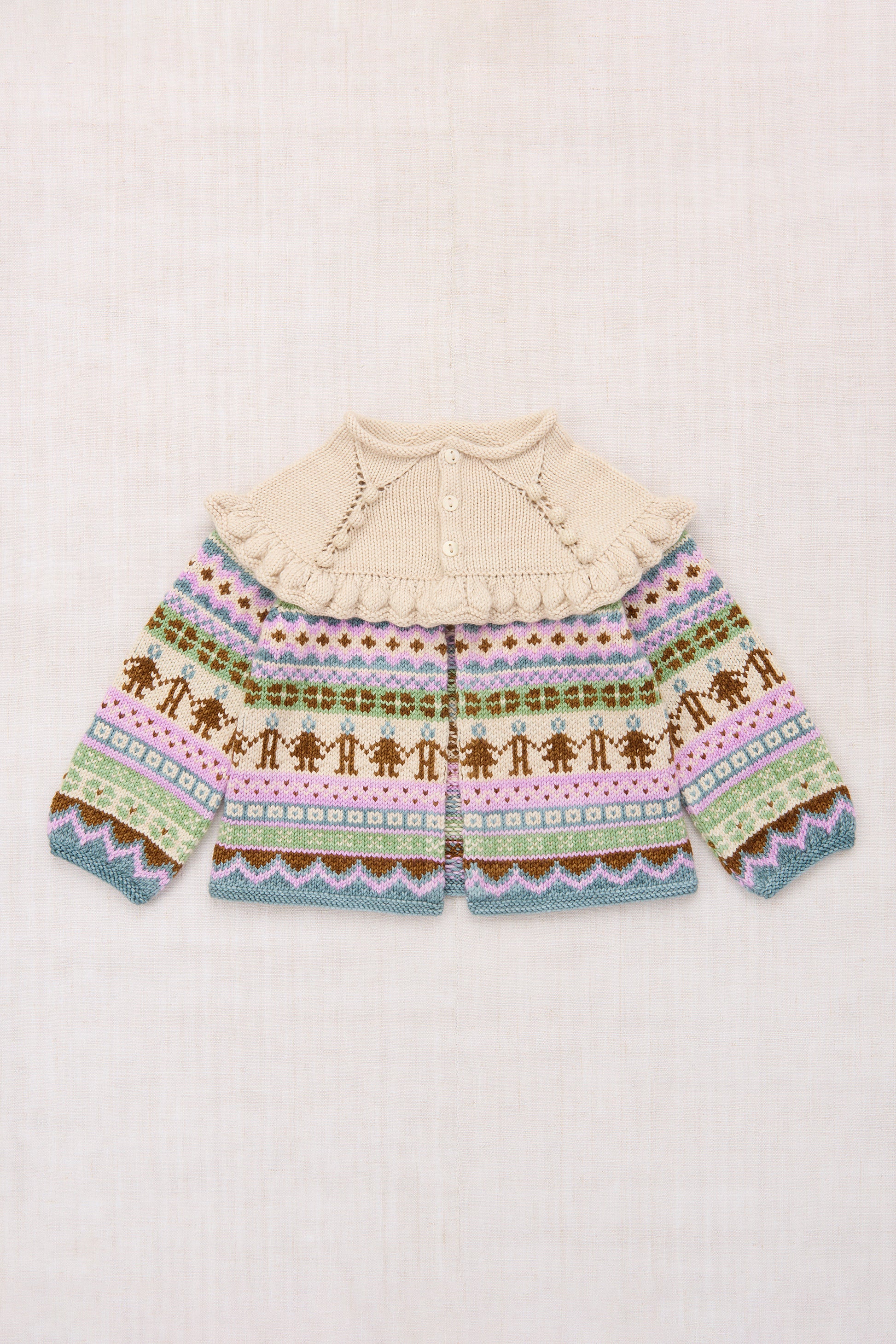 A three-button cardigan in Merino wool, featuring a Fair Isle-inspired colorwork motif, self-rolled mock neck, open A-line silhouette, elaborate yoke, and a ruffle that extends the full length of the top. With eyelet and popcorn stitch detailing, bracelet-length sleeves, garter stitch cuffs and hem, and horn button closure.