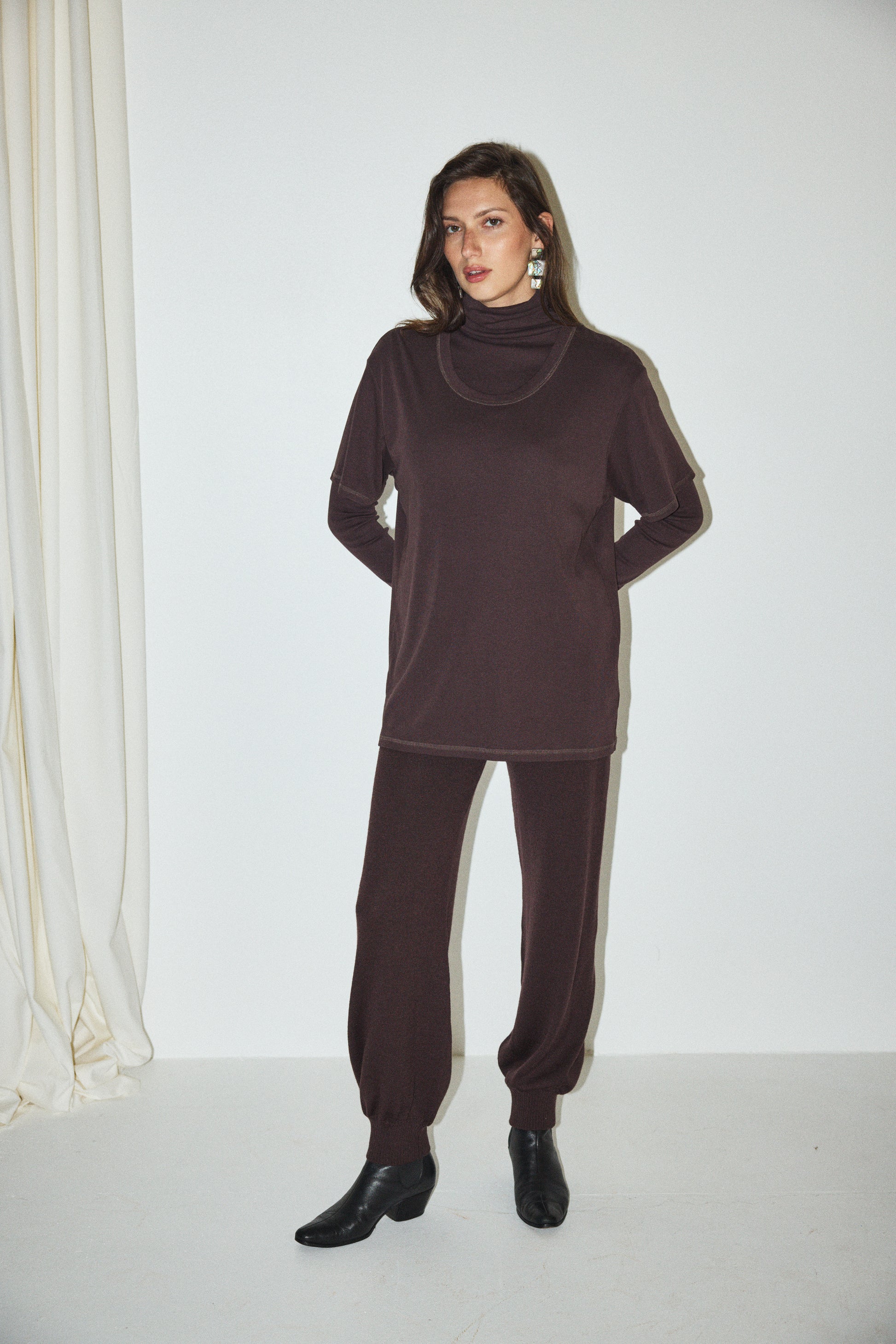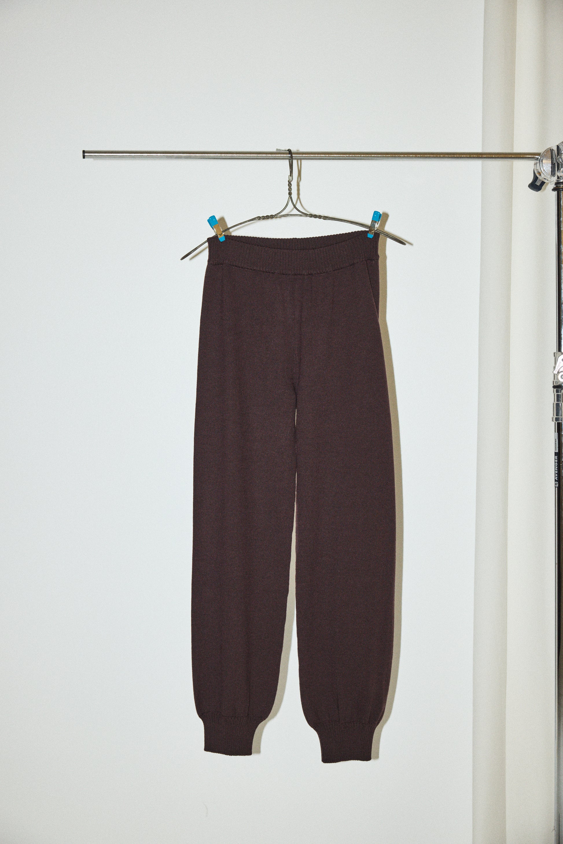A relaxed jogger pant in Merino wool, featuring a ribbed elastic waistband and cuffed hem.