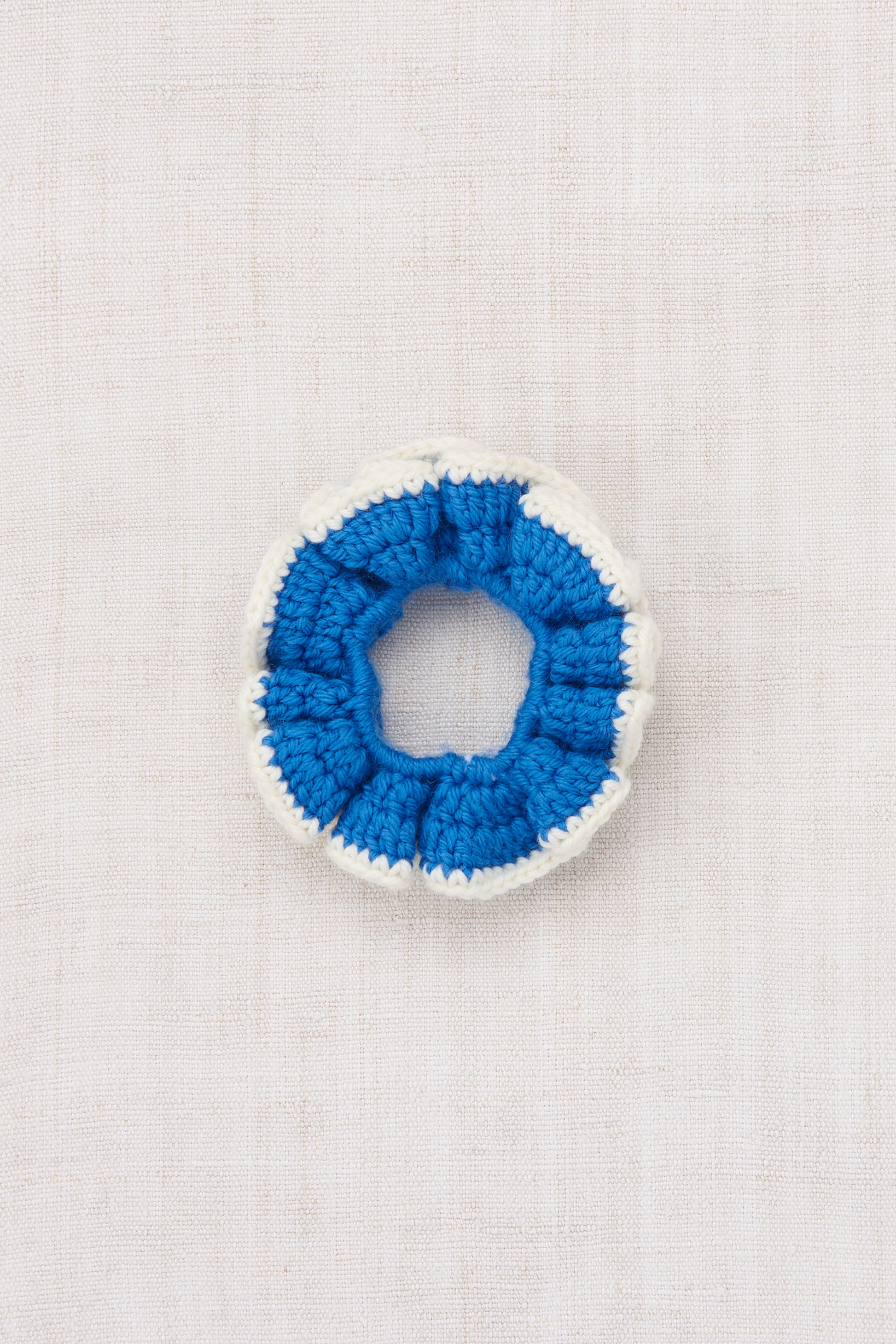 A hand-crocheted hair scrunchie in Merino wool, with a contrast edge. This effortless hairpiece is easy to style and adds a pop of color to any outfit.