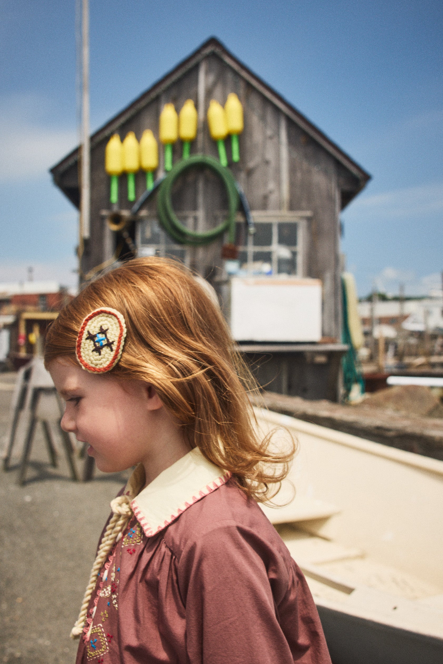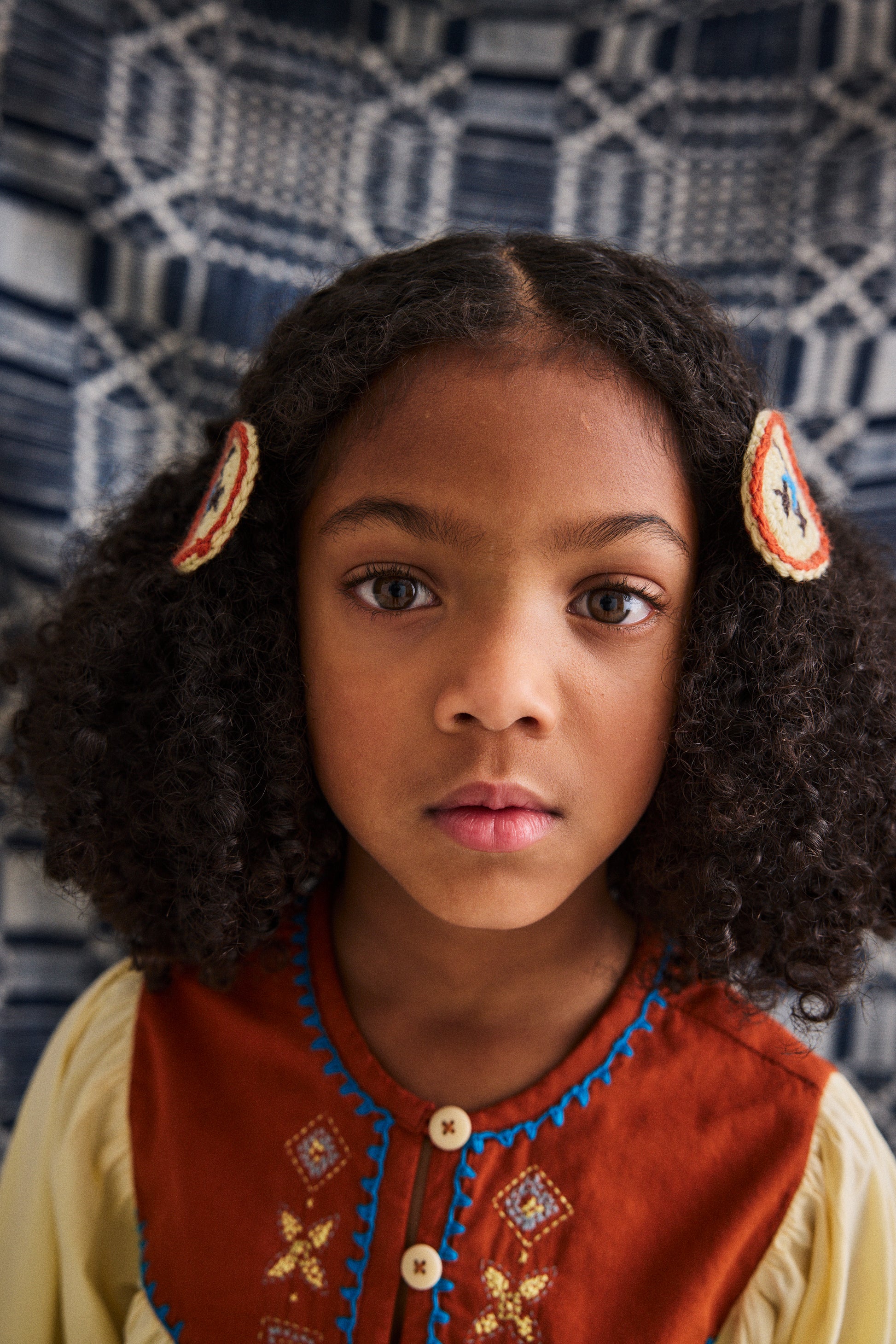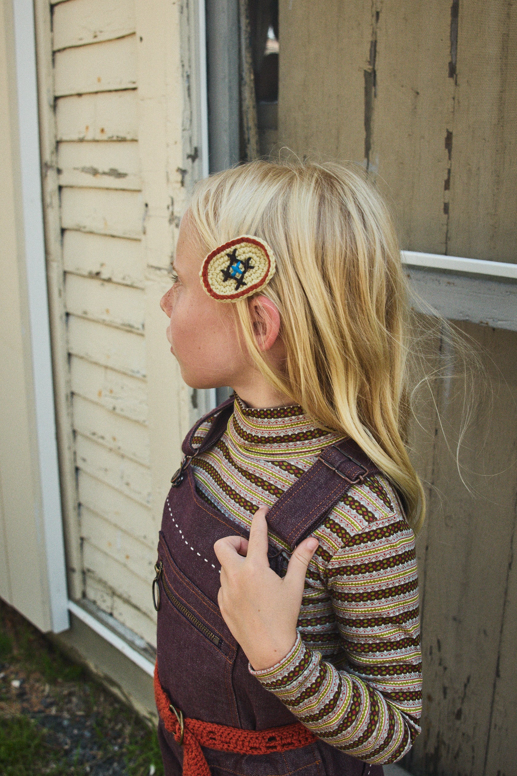 A hand-crocheted clip set in Merino wool, mounted on alligator clips. Finished with hand-embroidered cross-stitch designs.