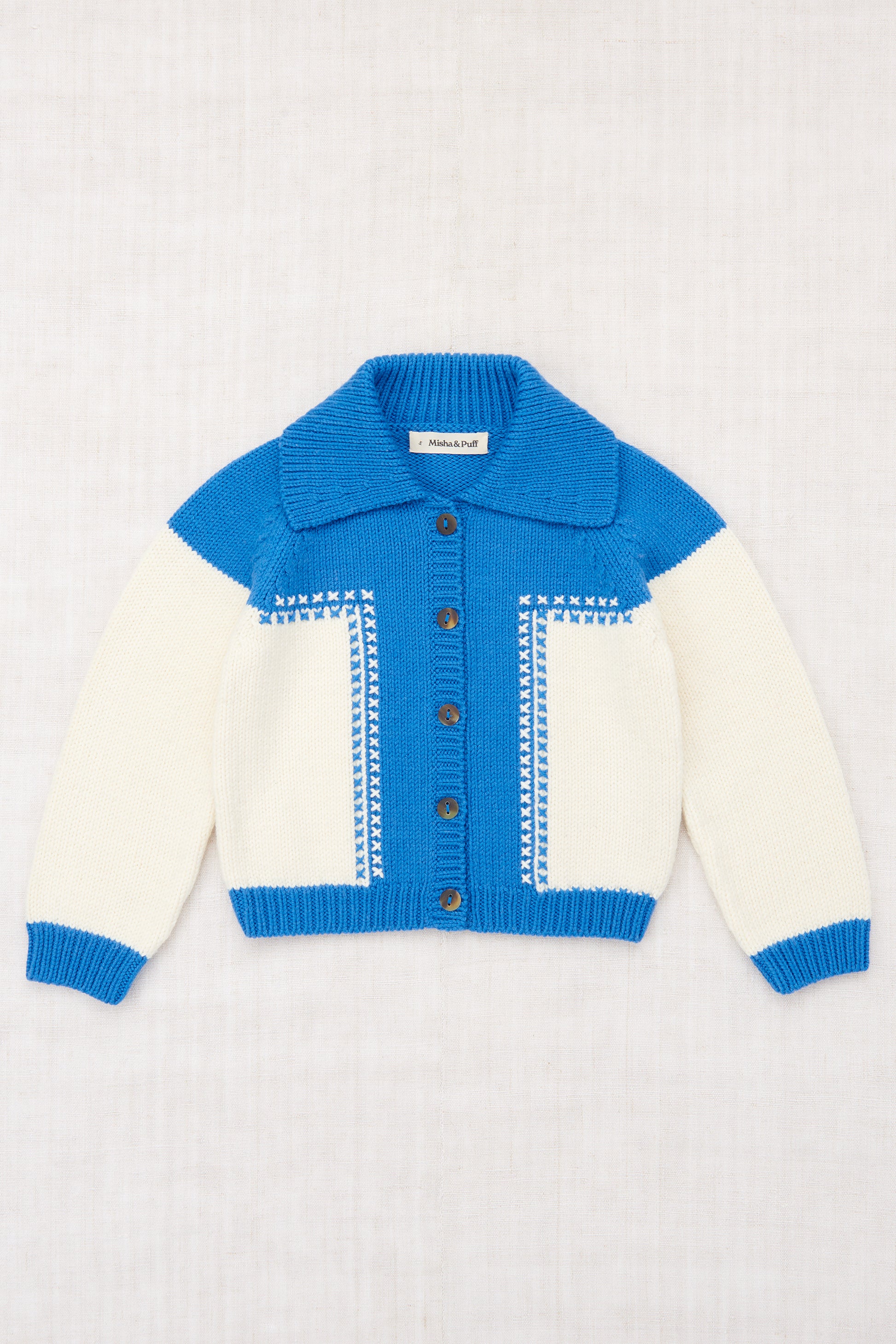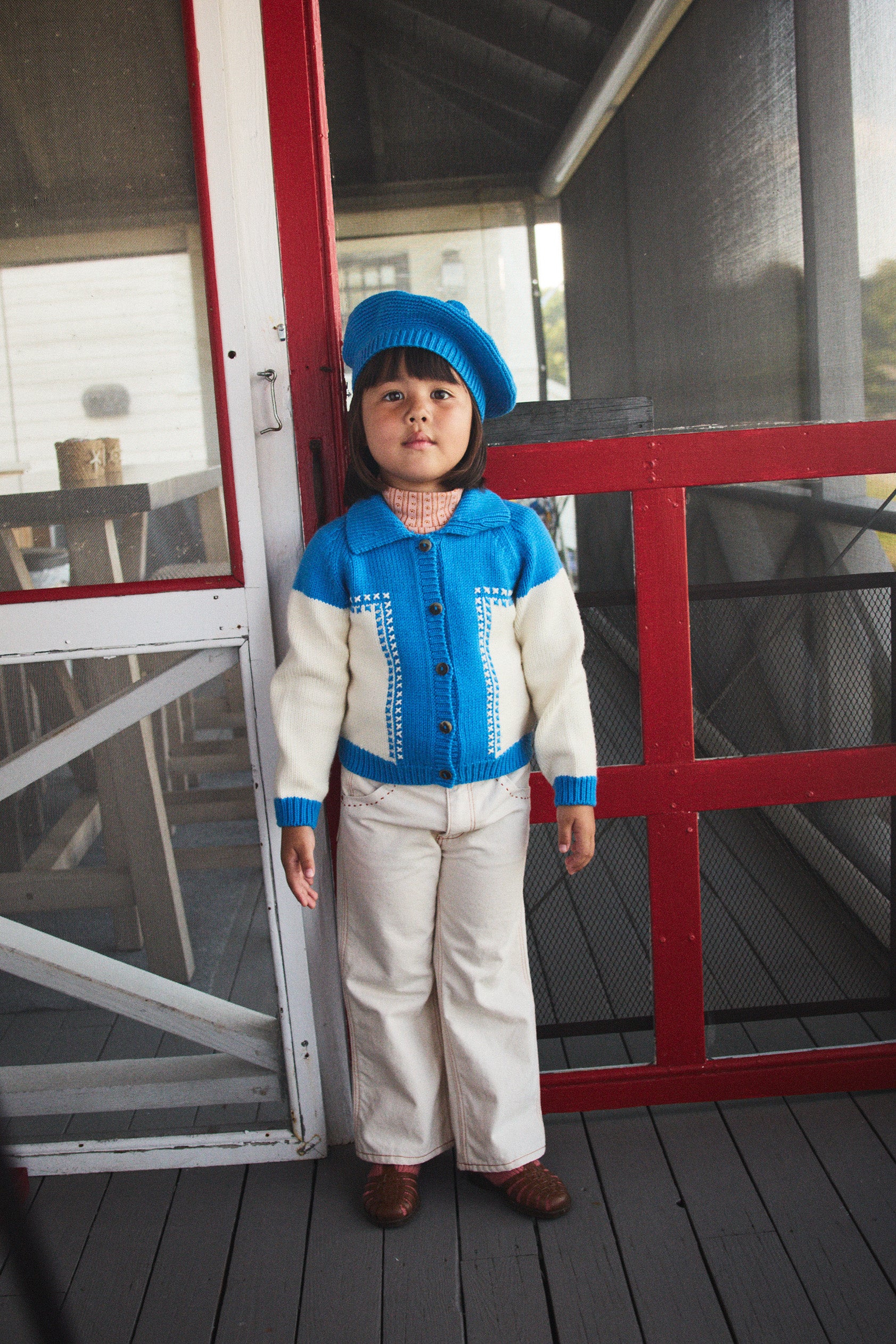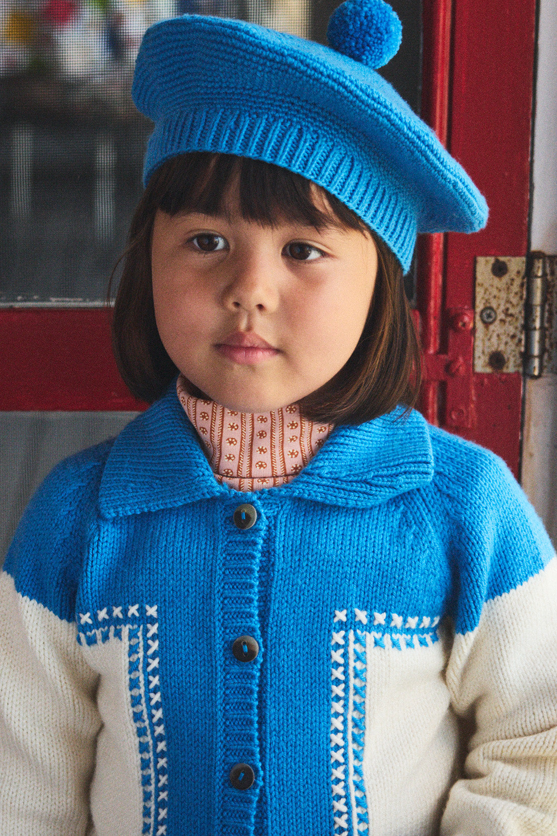 A vintage-style cardigan in Merino wool, featuring a point collar, ribbed trim and hem, and horn button closure. The perfect balance of roomy and tailored. Finished with hand-embroidered cross-stitch designs.
