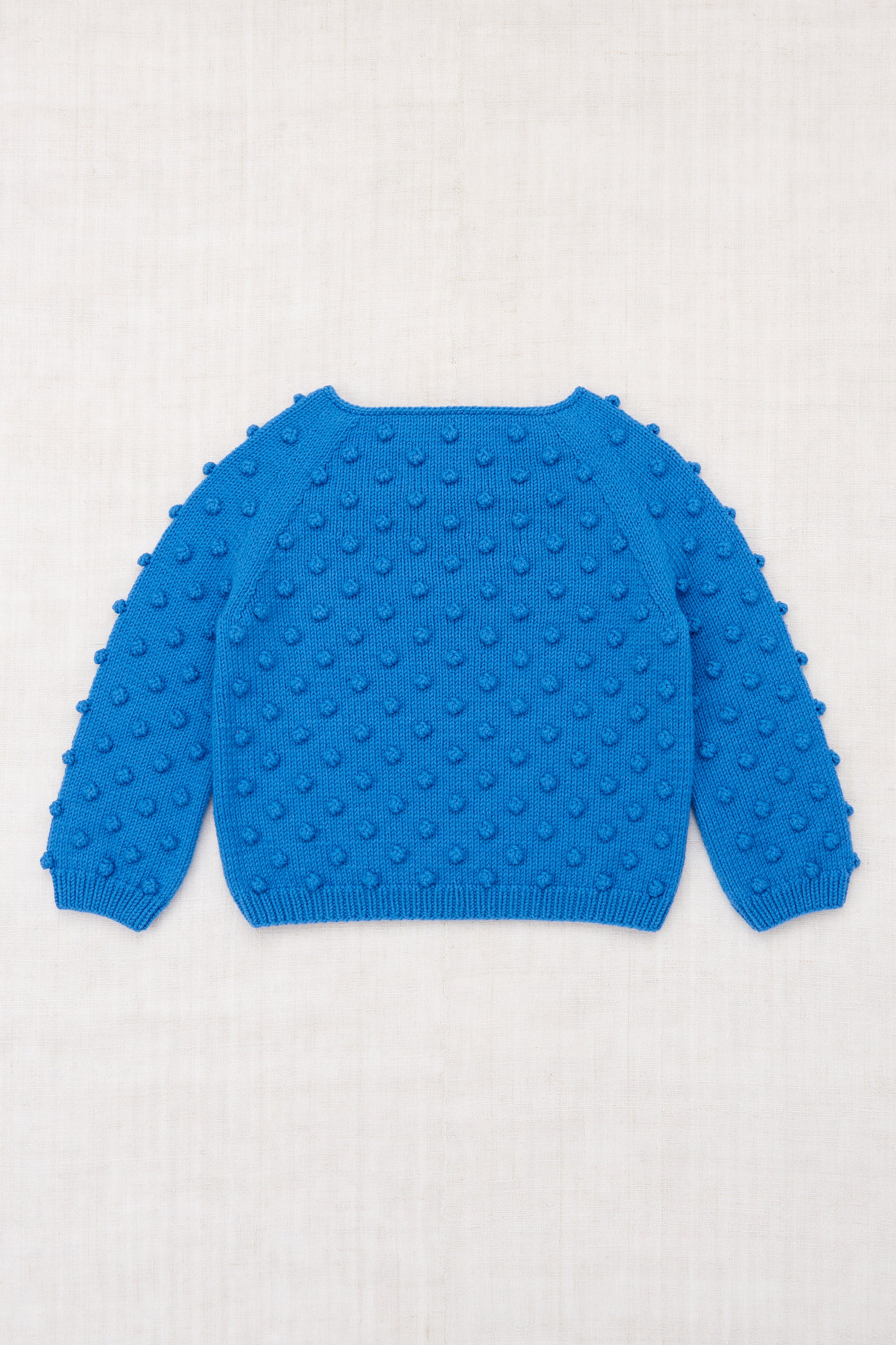 Misha & Puff’s signature hand-knit sweater in Merino wool, featuring an all-over popcorn stitch, rolled bateau neckline, ribbed cuffs and hem, and horn button closure at the back neck.