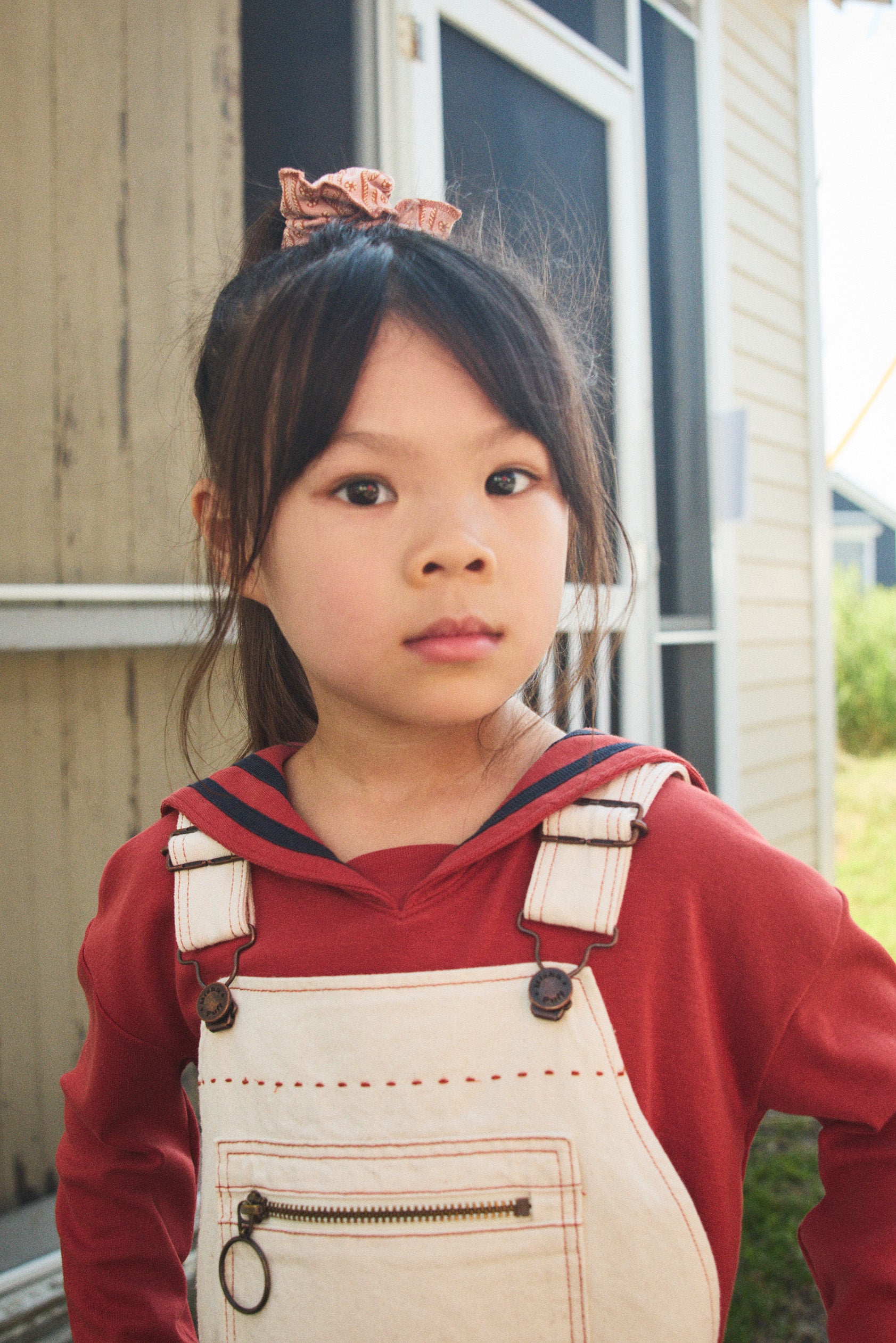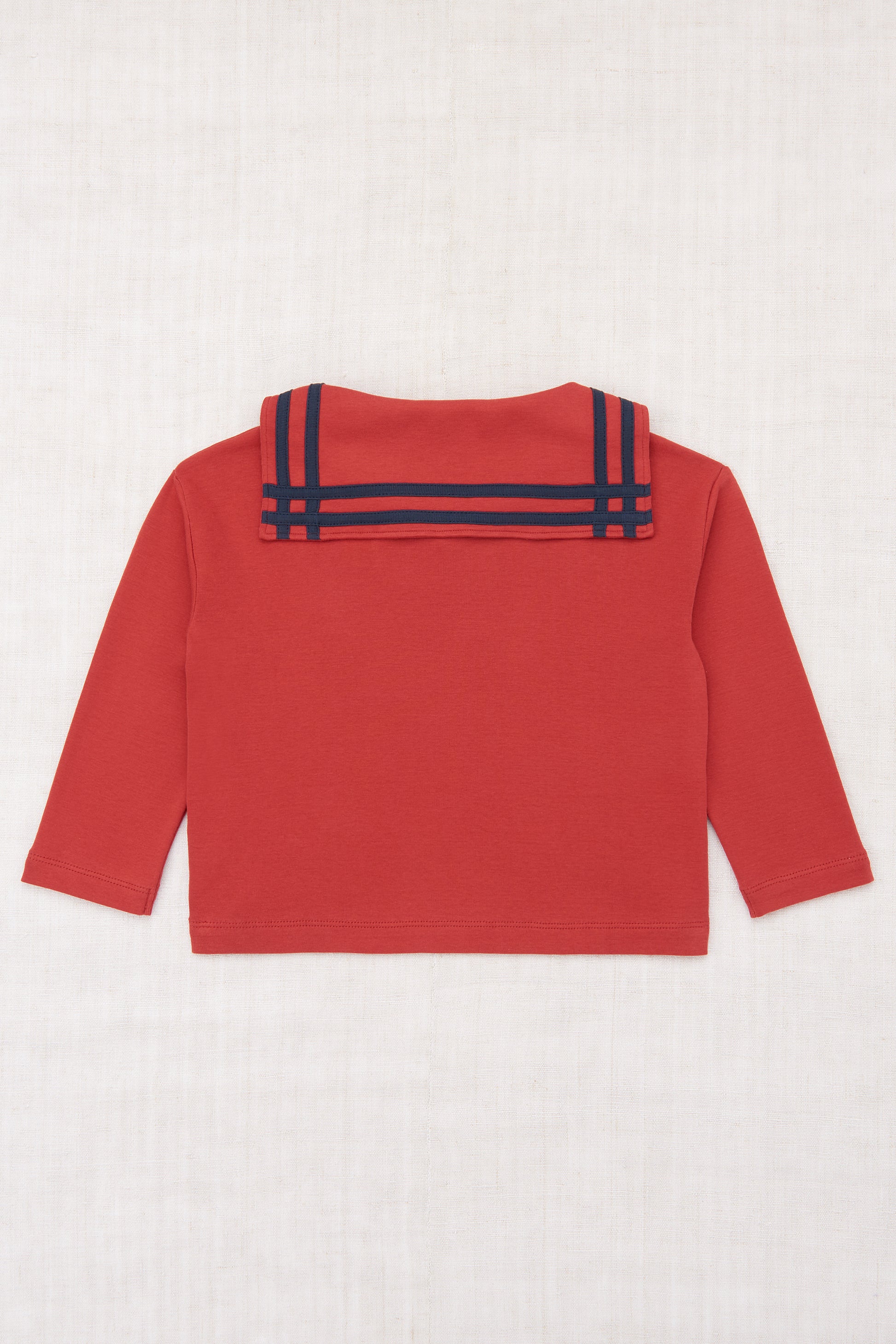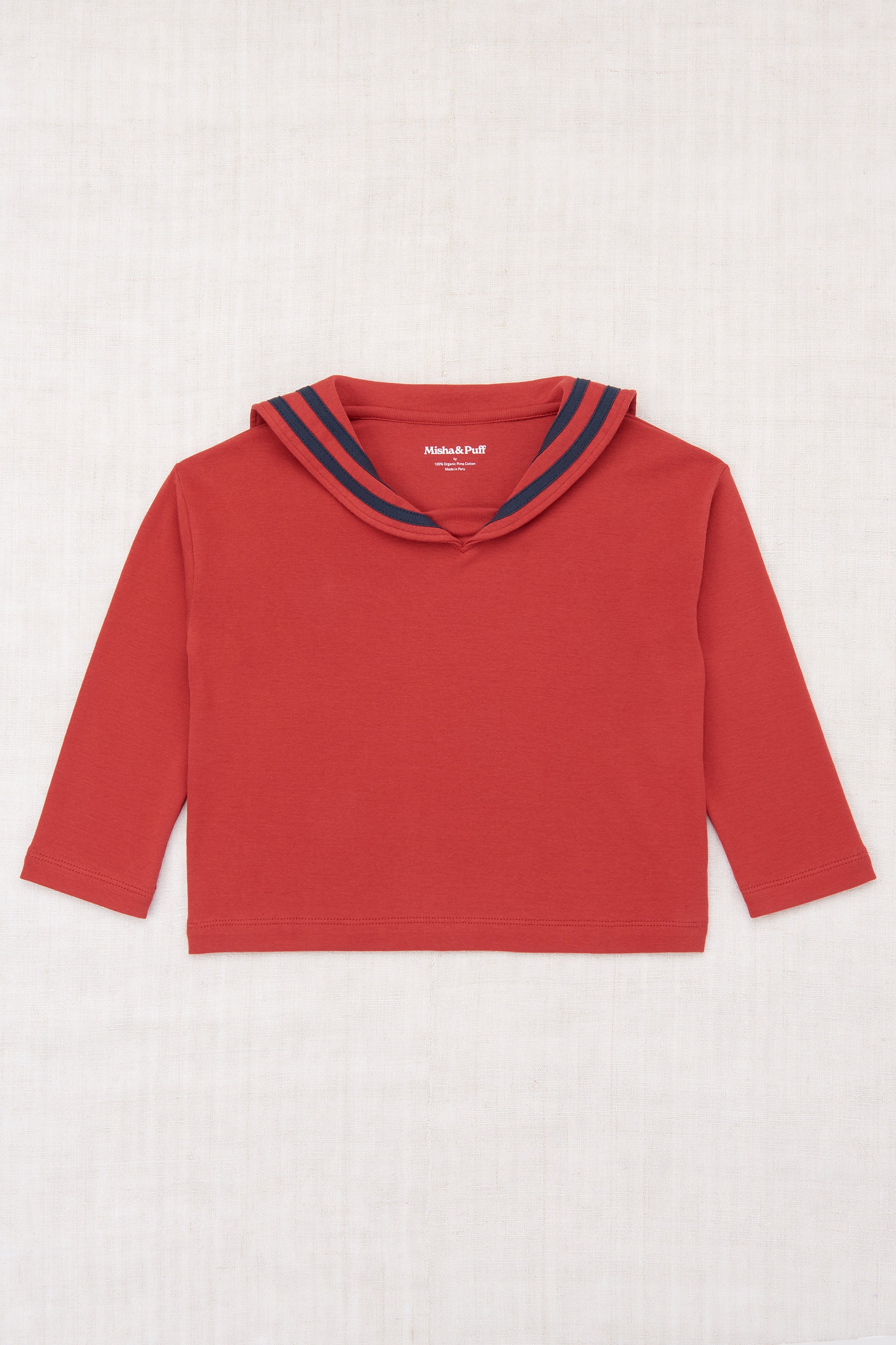 A boxy, vintage-style long-sleeved top in organic Pima cotton, featuring a bateau sailor collar with contrast appliqué stripe detailing.