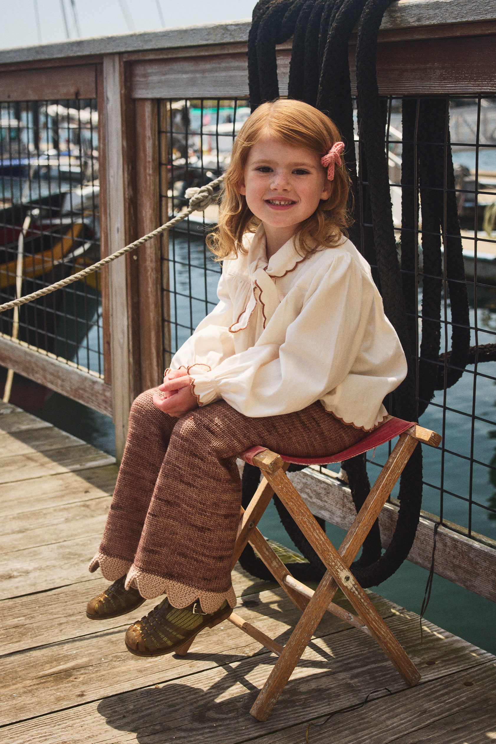 A fitted pull-on pant in a Merino wool knit, featuring a slight A-shaped flare, a soft banded elastic waistband, and a hand-knit scalloped hem.
