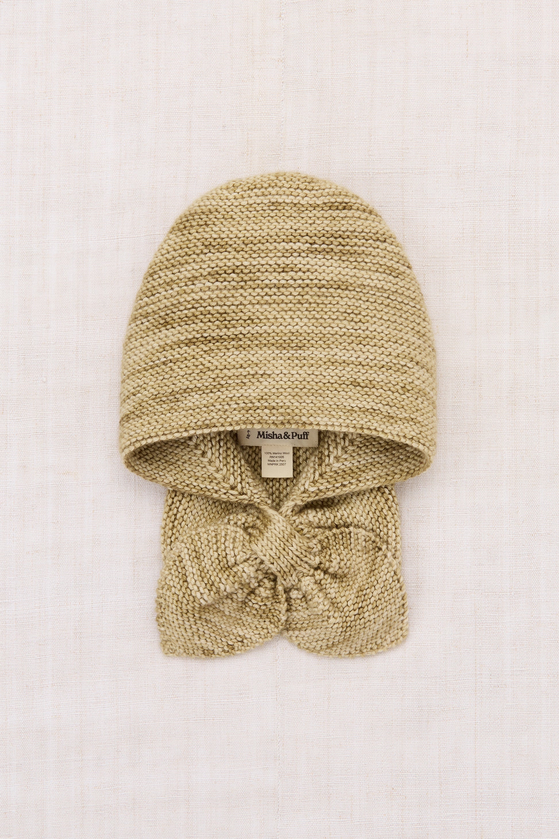 Misha & Puff’s signature hand-knit fitted hood in Merino wool, with a pull-through kerchief closure. Keeps heads and necks warm — the perfect complement to any outfit.