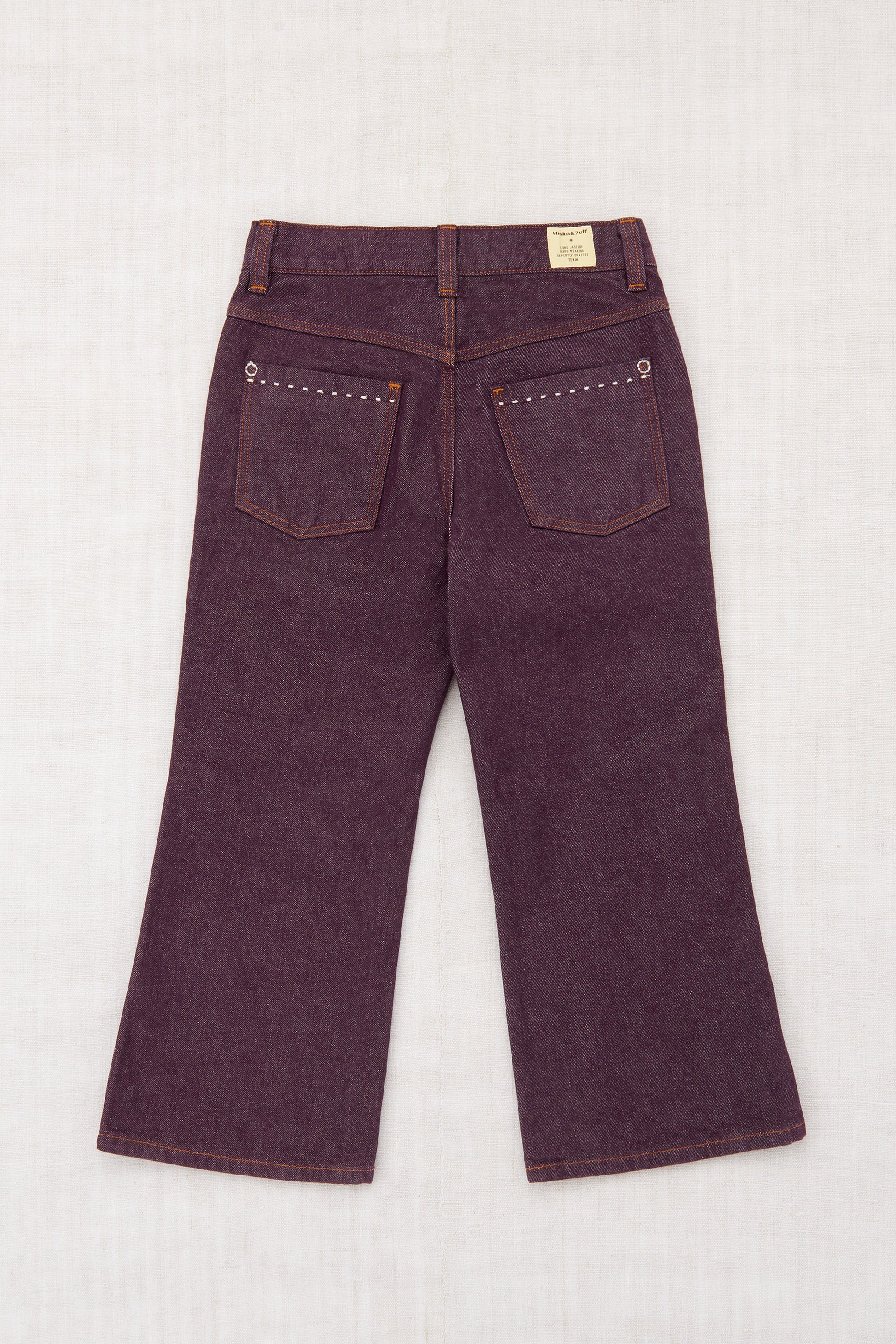 An incredibly versatile, vintage-inspired slim flared-leg jean in 100% cotton denim, featuring five pockets, print-lined front pockets, contrast topstitch detail, and a hidden interior adjustable waistband for the perfect fit. Finished with hand-tacked stitches instead of rivets for softness.