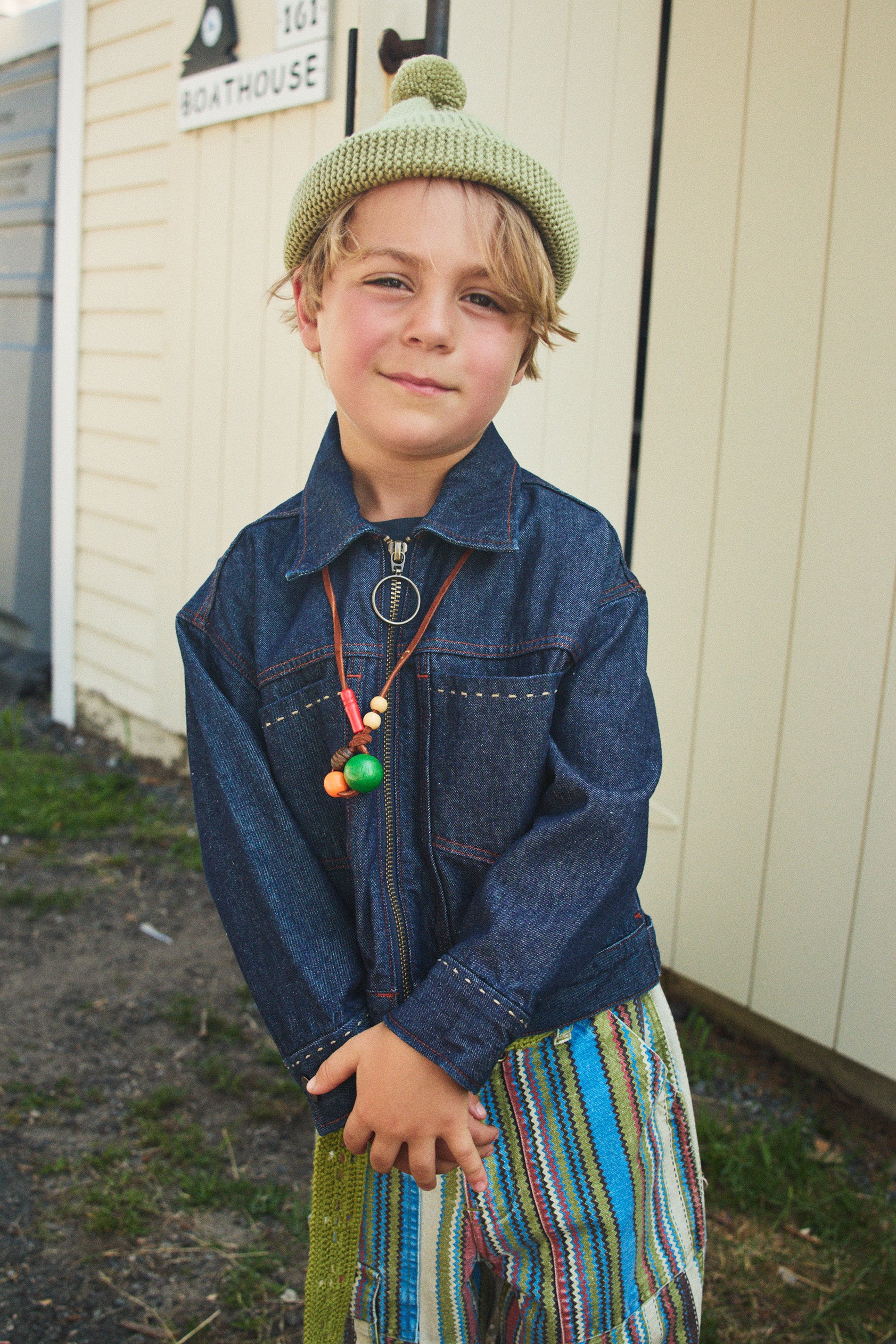 A classic vintage-inspired jacket in 100% cotton denim, with a point collar, contrast print lining and lined side slit pockets, two front patch pockets, front zip closure, and all-over contrast topstitch detail. Finished with hand-tacked stitches instead of rivets for softness.