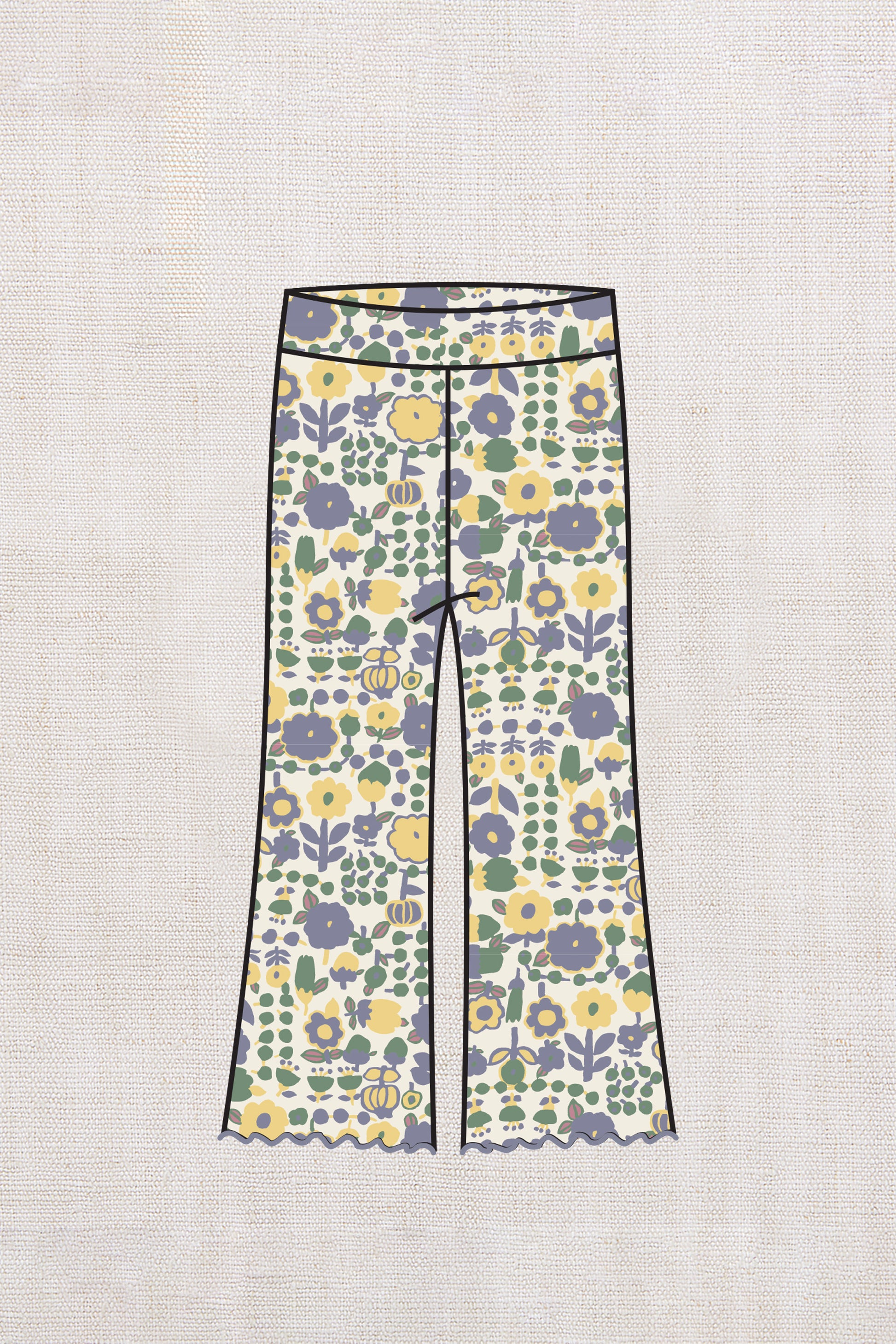 A pull-on pant in organic Pima cotton, featuring a trim silhouette, a soft banded elastic waist, and a ruffled kick-flare leg with a contrast merrowed edge.