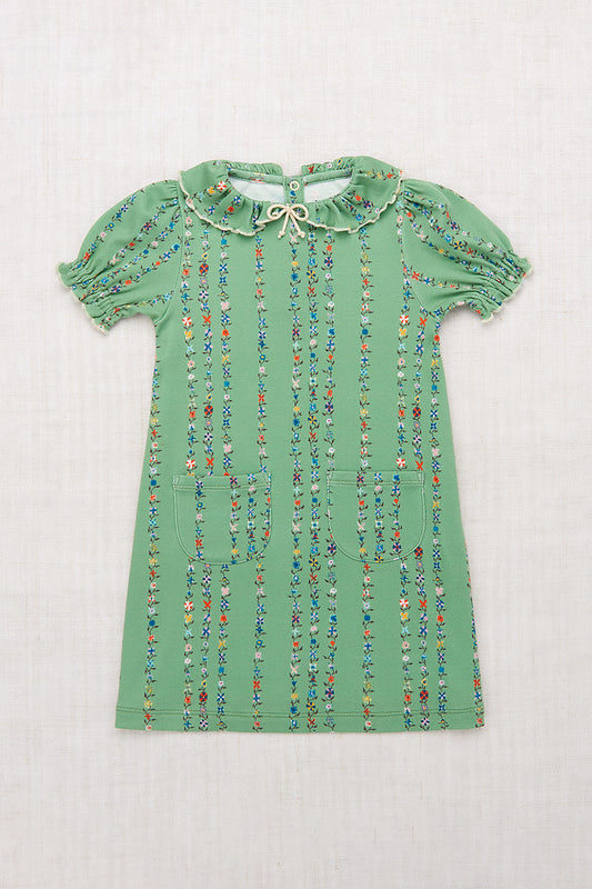 A balloon-sleeved dress in Pima cotton, featuring a ruffled rounded collar and soft elasticated ruffle cuffs with contrast merrowed edges, and rounded patch pockets. Finished with a mini bow at the center front and a snap closure at the back neck, it’s the perfect dress for play.