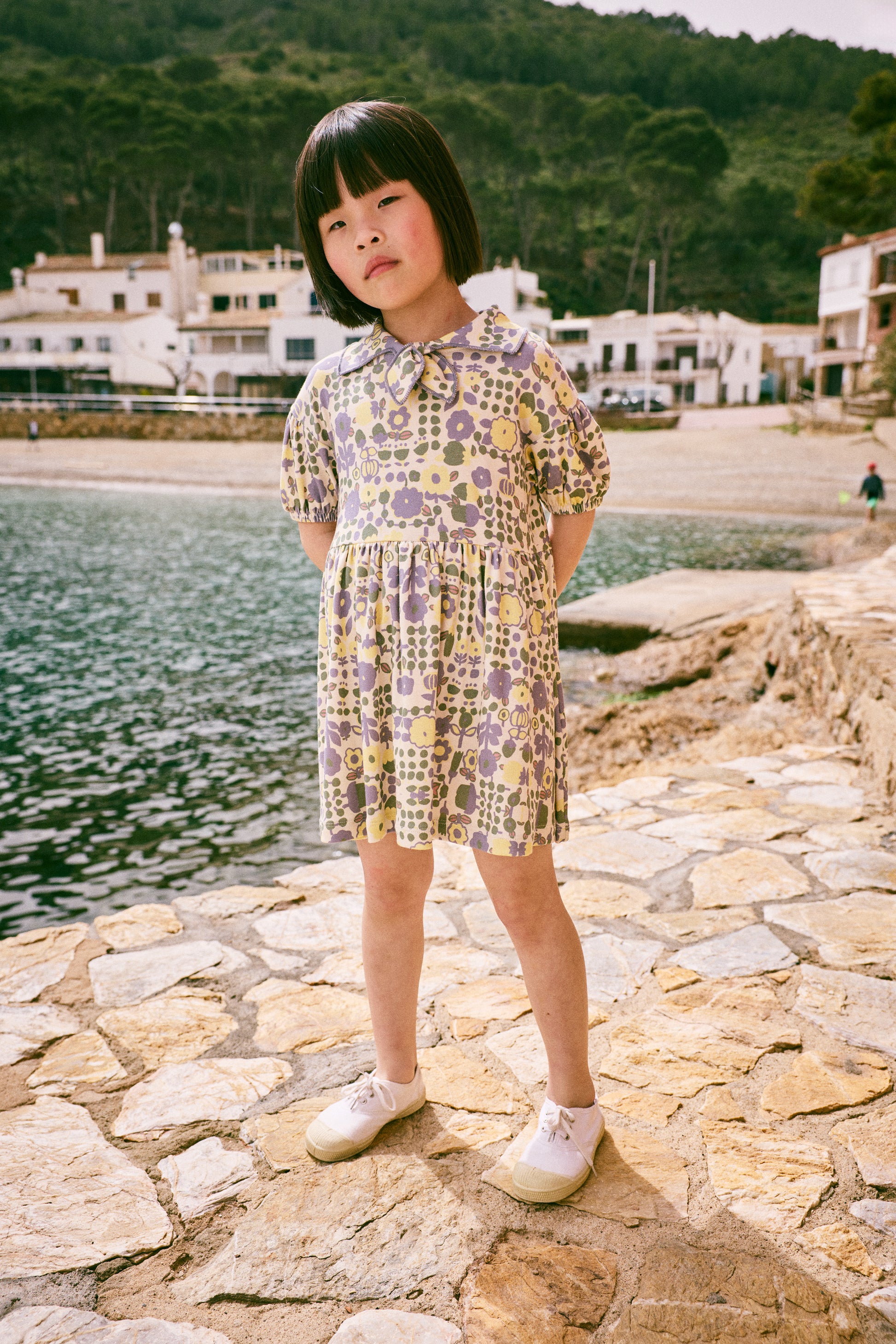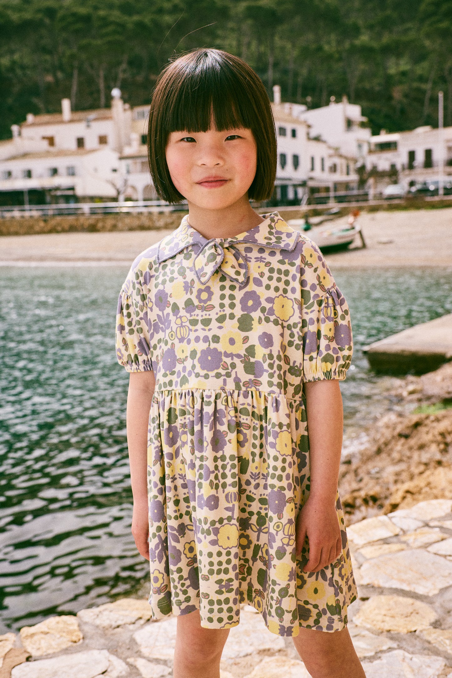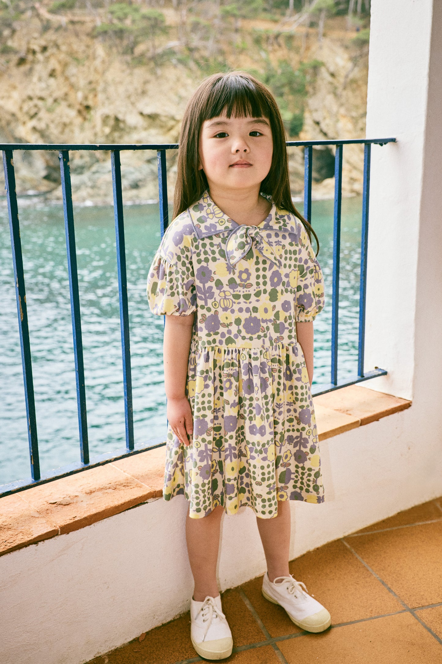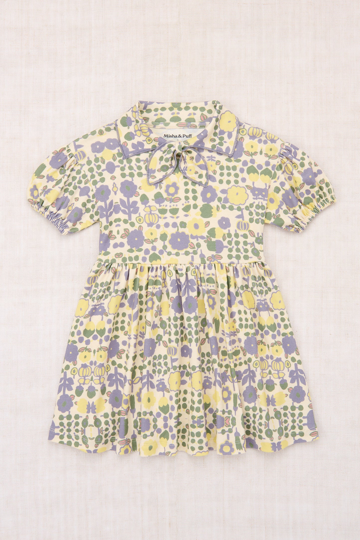 Inspired by Misha & Puff’s signature Scout Top, a short-sleeved peplum-style dress in organic Pima cotton. Featuring puff sleeves with soft elasticated cuffs and the Scout pull-through kerchief with additional soft pointed collar.