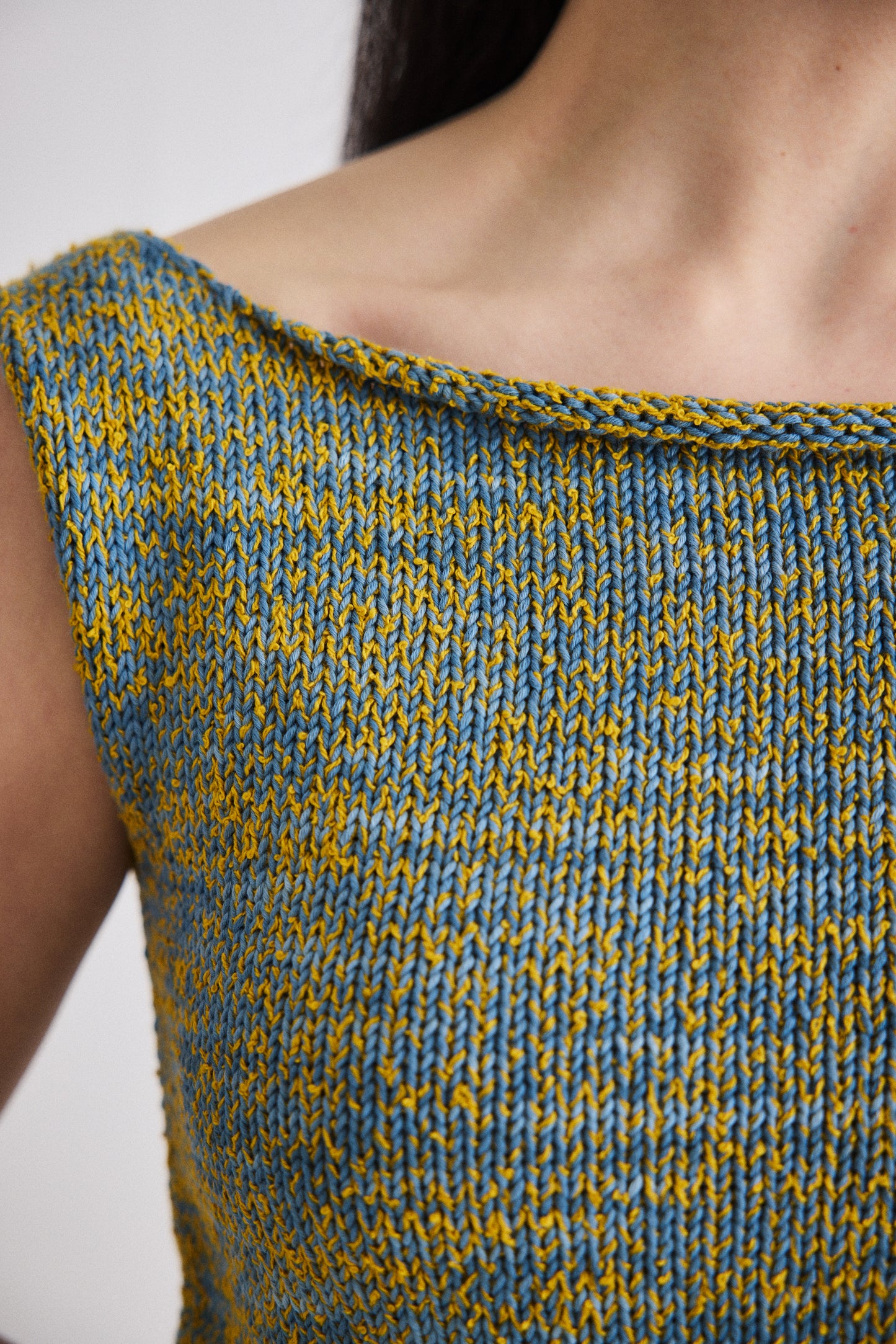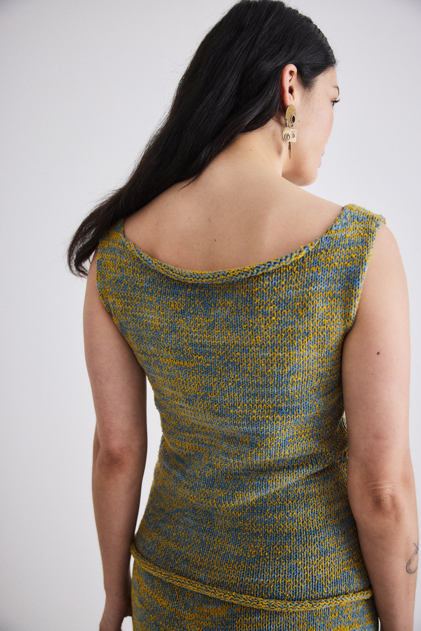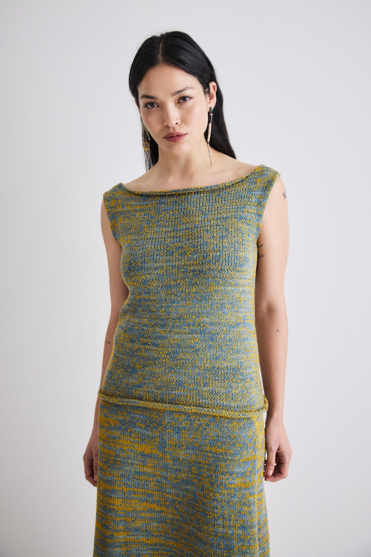 A textured marled tank in a Pima cotton and organic cotton bouclé blend, featuring a slim-straight silhouette, wide boatneck, and rolled trim. This style has a slim fit—consider sizing up for a less form-fitting look.
