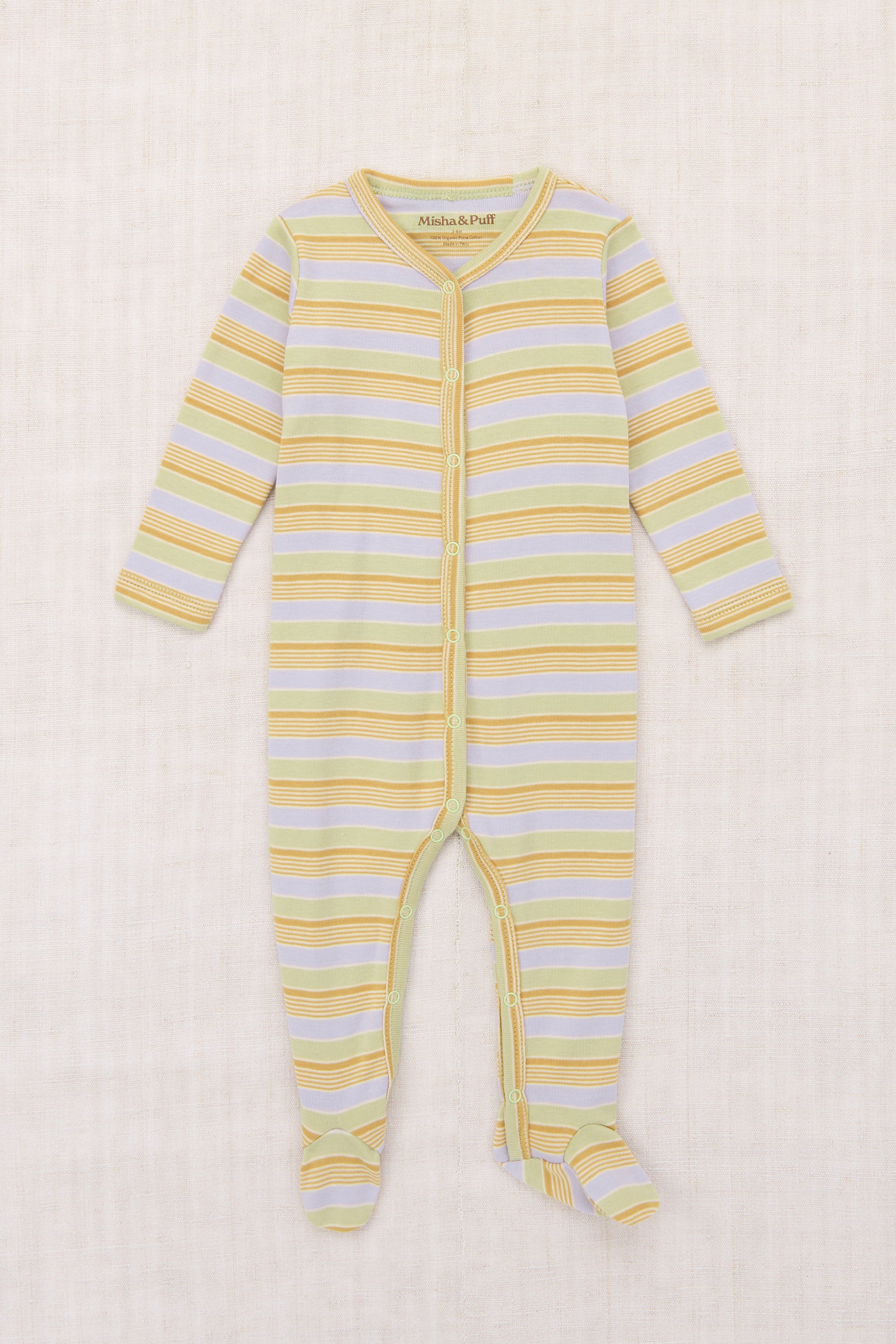 A long-sleeved one-piece in soft organic Pima cotton, with snap closure down the front and attached feet — for sleep and play. Each stripe is yarn dyed separately before being knit together, creating rich color that lasts longer.