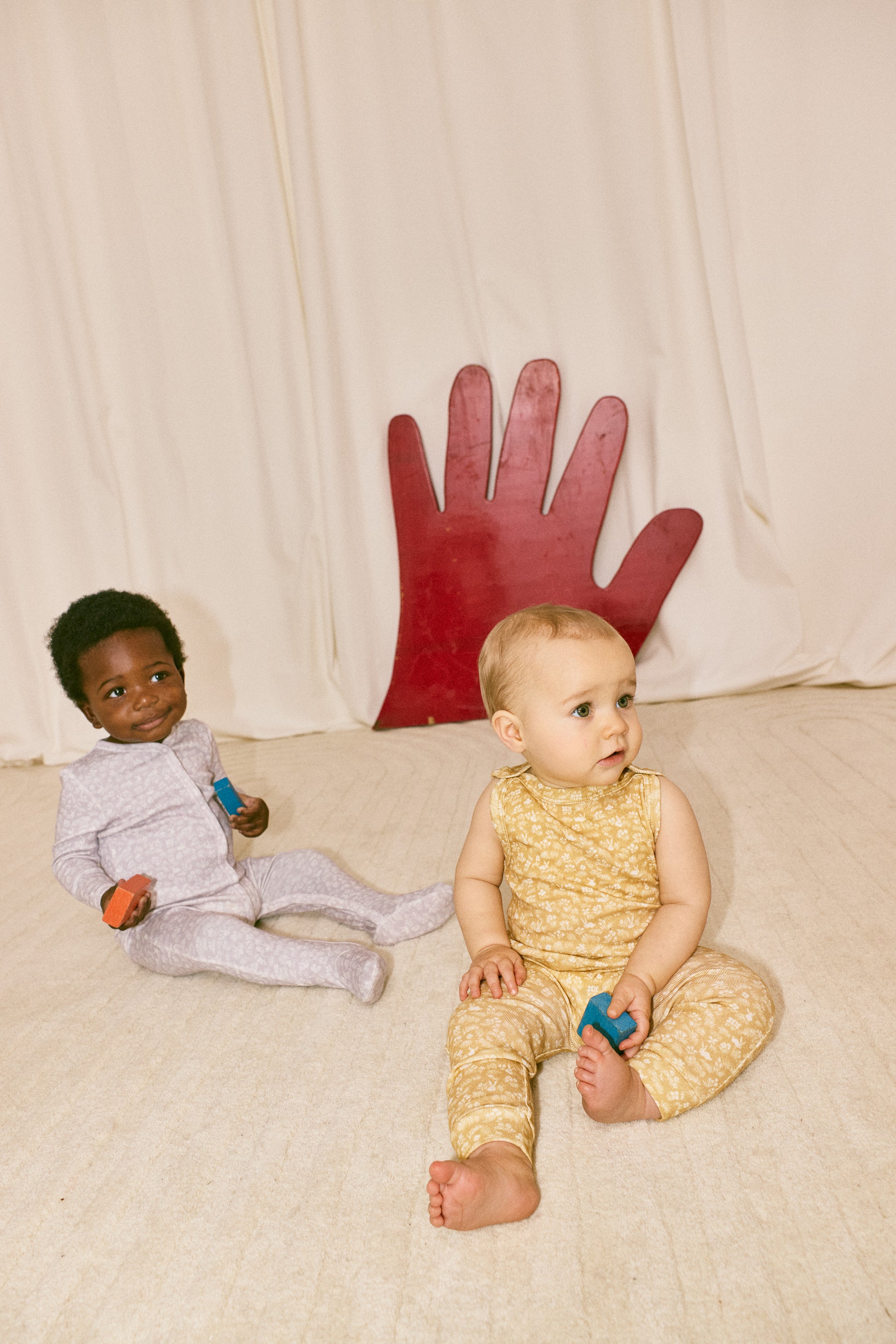 A sleeveless overall onesie in soft organic Pima cotton, with snap closure at the shoulder for easy on-and-off — perfect on its own or layered for a versatile, buildable look.